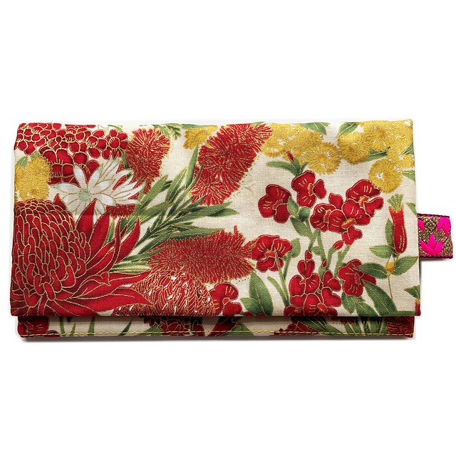 ★8-98-spec ソテツの混ざったボタニカル柄、赤系。細い金箔でアウトライン。 大きめ大胆な花柄お好きな方へ。豪華で繊細でゴージャスな布。浮世絵 日本画風 リッチでゴージャスです。カバンの中で見逃しません。 ・中布 赤水玉のスタンプ調/チラ見えライン 紫/インナー 紅赤 piott sawing club ハンドメイド布財布を見ていただいてありがとうございます。 とにかく軽い! ファスナーがないので自由な厚みで使える、フレキシブルであなた次第な、カード収納 ヌノサイフ。 国内、海外の問屋や、インポートで取り寄せたデッドストックの布を使って、華やかでキッチュに、piottのテイストでハンドメイドしました。 軽くて小粋な、シンプルで使いやすい布の札入れです。お薬手帳、へそくり管理にも。 ◆すべてオリジナル、家庭用ミシンで手作りの一点もの。既製品のクオリティの高さはありませんが、世界で一つの色合わせハンドメイドです。 ◆古いスカーフや、デッドストックの布は洗濯してから断裁しています。 ◆レシートやカード類(16枚)が綺麗に収納されるカードフォルダー二枚添付します。(現在のインナーのカードホルダーは「株式会社ハピラ」さんの製品。感謝!) ◆縫い目や内側の端の処理はサンプル写真をご覧ください。 ◆横195~200mm×縦205mm前後→二つ折りにすると天地110mm前後・お札が綺麗に収まるサイズ。サンプル写真をご覧ください。 ◆カードフォルダを取れば、小さくたたんで使うこともできます。 ◆くくりひもは私がいつも使っているような簡単なものを一本おつけします(ひもの種類はおまかせください) ‥‥‥‥‥‥‥‥‥‥ piott sawing club ハンドメイド布財布は……… カードをたくさん入れるとどんどん重くなってしまう皮財布に困って、軽い布の札入れをさがしたけれど…好きなデザインがまったく見つからない…。 思い立ってデッドストックの布で色とりどりに作って使っていたら、「かわいい!どこで買ったの?私も欲しい!」「こういう軽い財布を探していたよ」とたびたび言われるようになりましたので、sawing club で作ってお裾分けすることにしました。 商品ではありますが、心をこめた一点ものの手作りなので、手作り品質をご理解いただけ、自由自在なpiottのセンスを面白がって使ってくださる方のお手元に届くことを願っています。 【検索ワード】 赤 花柄 ボタニカル 浮世絵 ソテツ