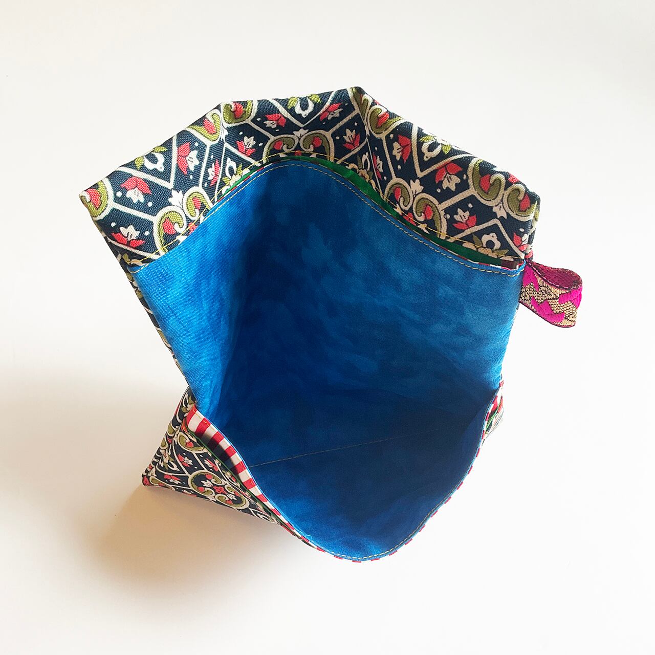複雑でよくできた、かっこいい模様なので、和風だけどいつか使いたいと思って温めていました。和風に渋くならないようにできないものかと思い続けてきましたがやっとピンと来て縫製に至りました。思い入れいっぱいの一点になりました。