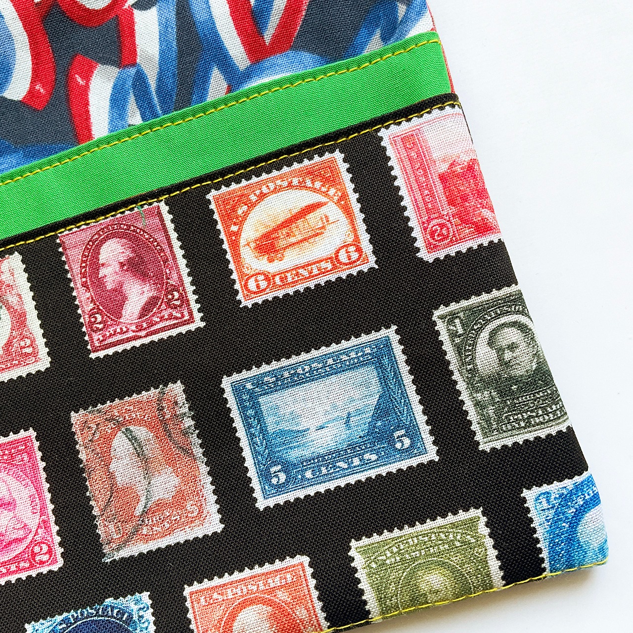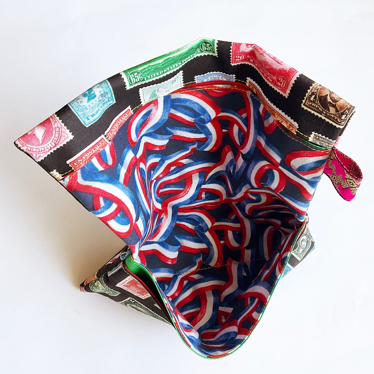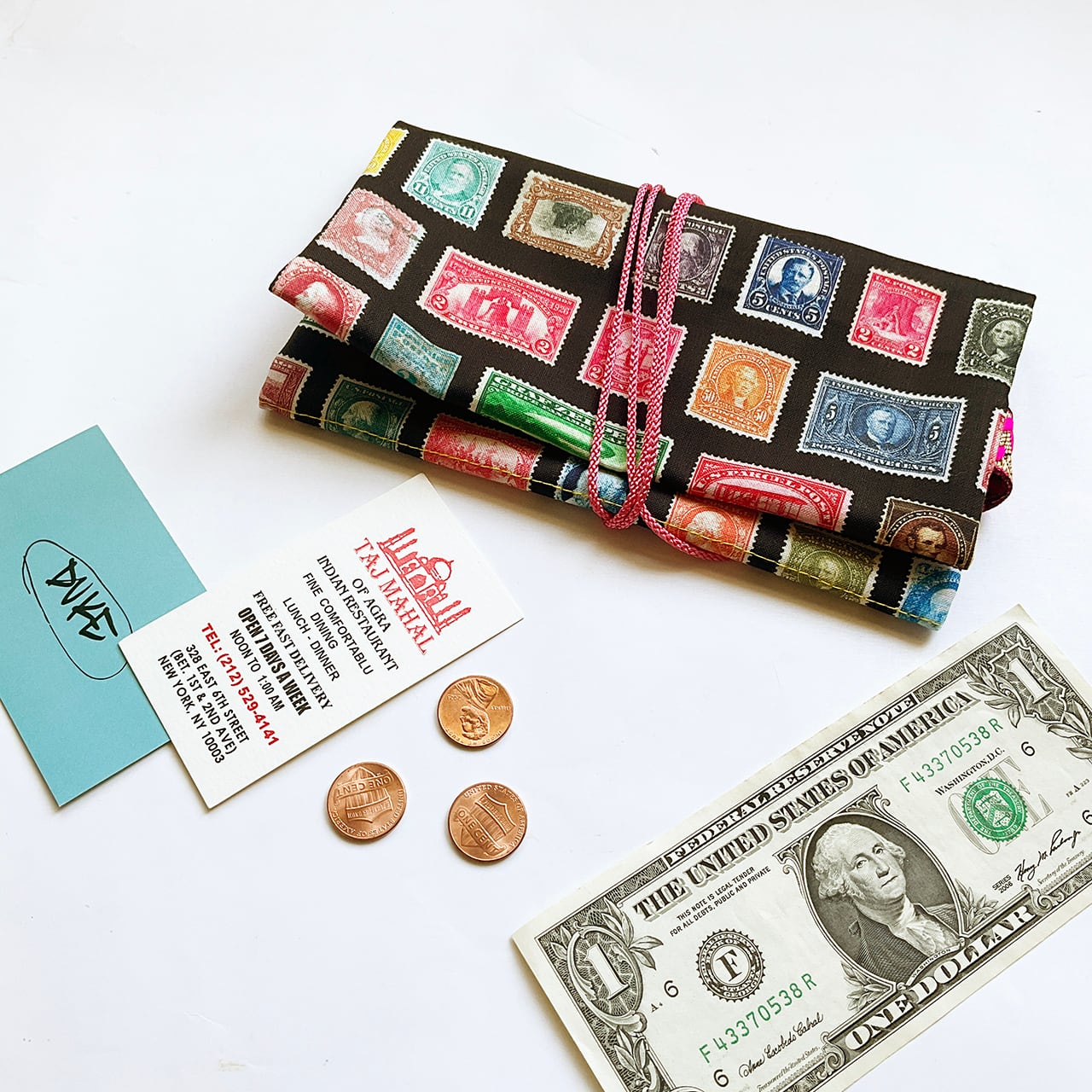切手を並べただけの布なのになんでこんなに心踊るんだろう? きっと切手が大好きだから。切手好きの人案外たくさんいる気がします。世界中をギュッとこのヌノザイフに集めました。中布はかなりニッチに世界を旅するイメージで