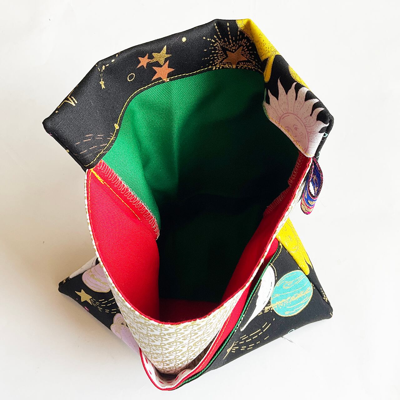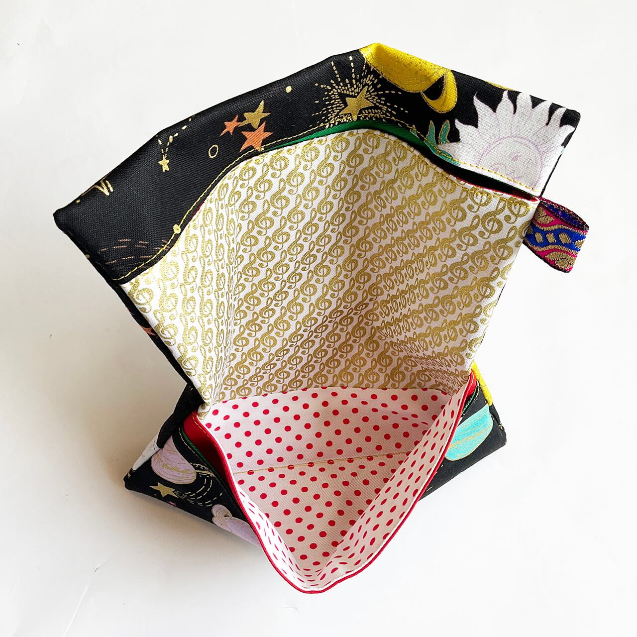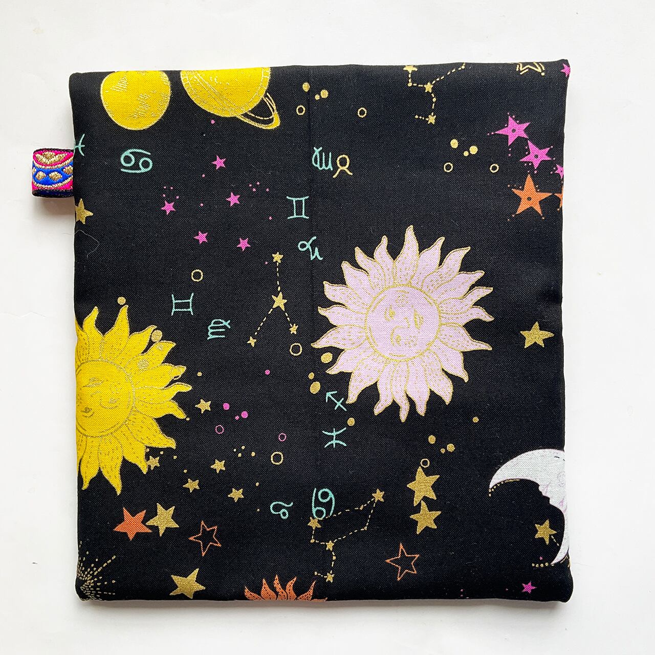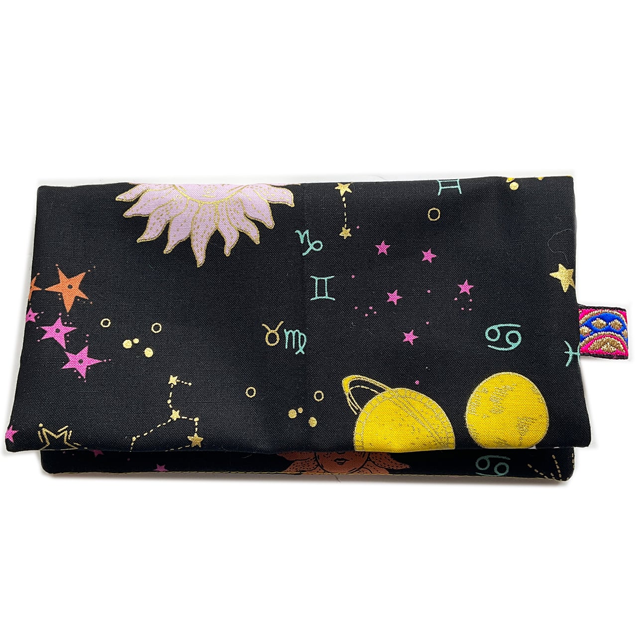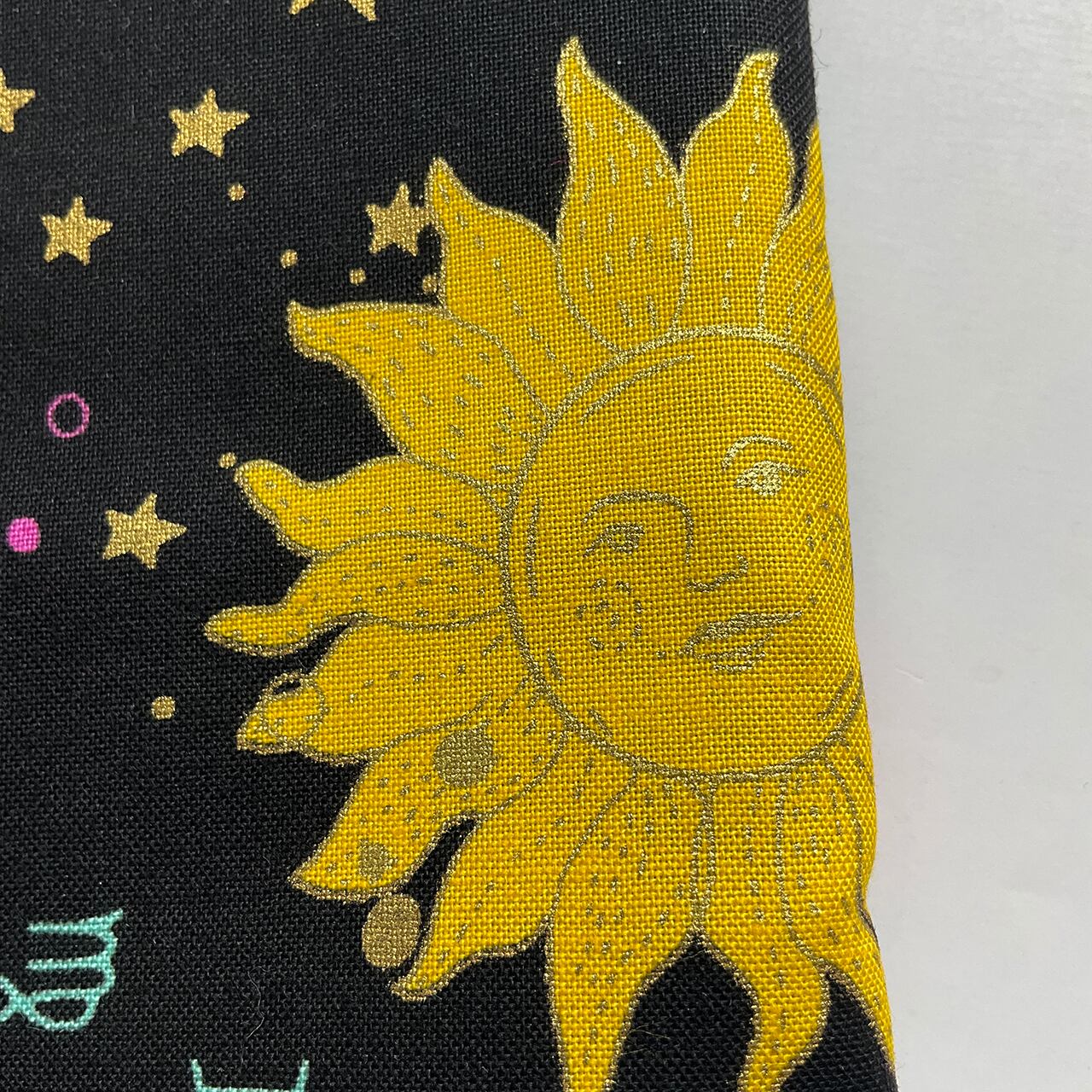 はじめまして!の布です。 ジャンコクトーの世界のような星座のヌノザイフ。黒地に黄色い太陽が効いています。