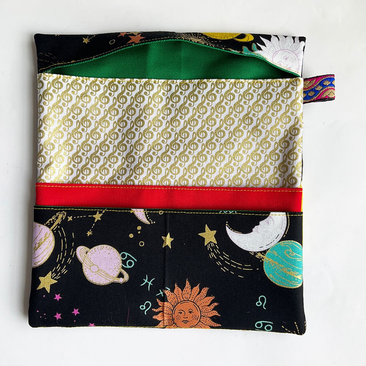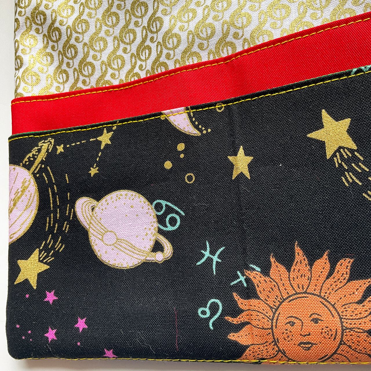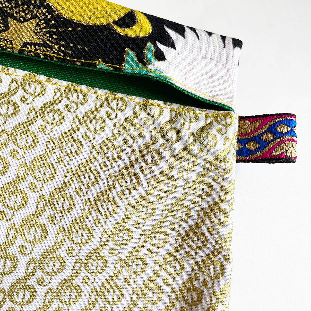 手書きの顔やラインの味がコミカルな宇宙。金箔のト音記号のMIXと合わせました。
