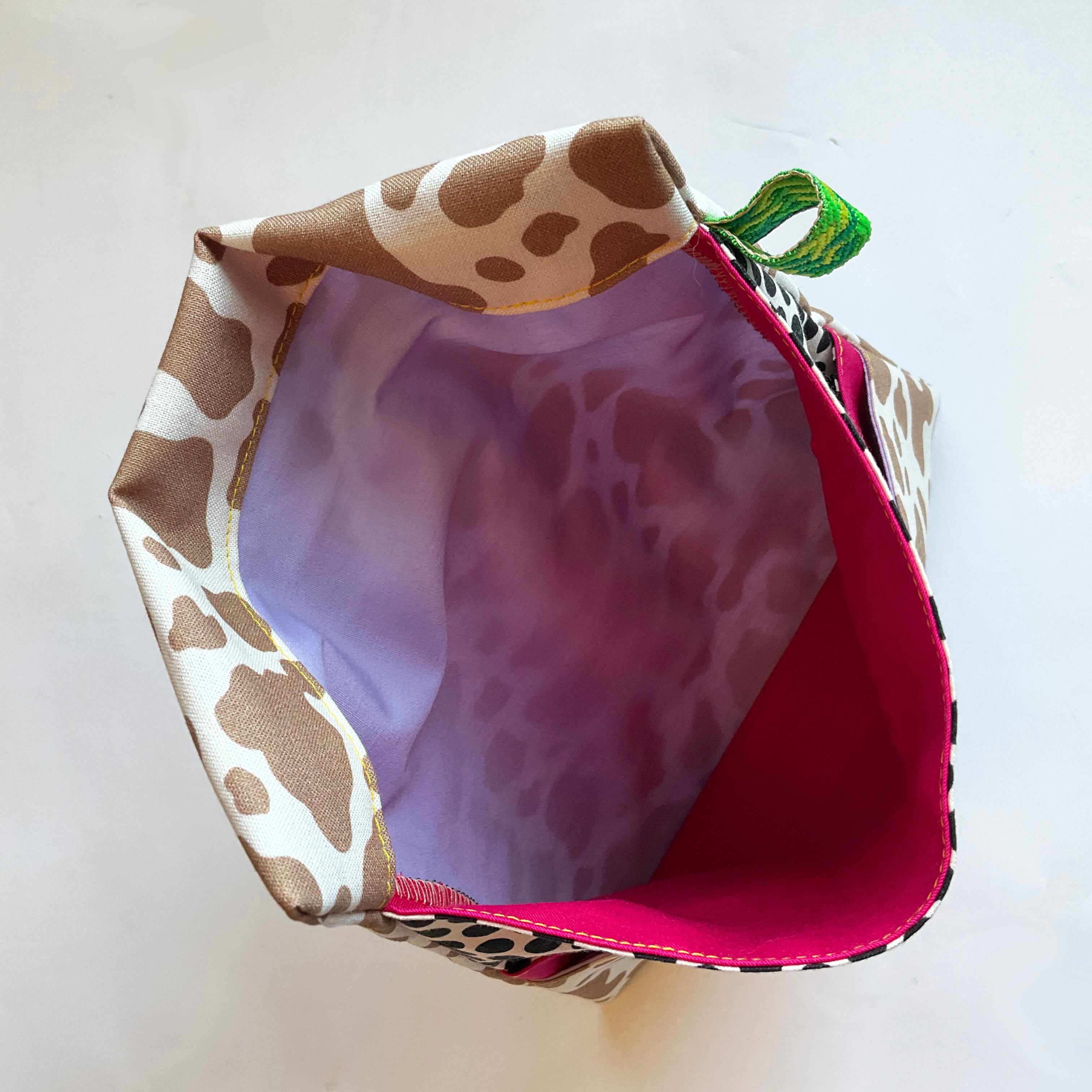 形は江戸の道中財布。欧米のデザインファブリックでポップに明るく作っています。