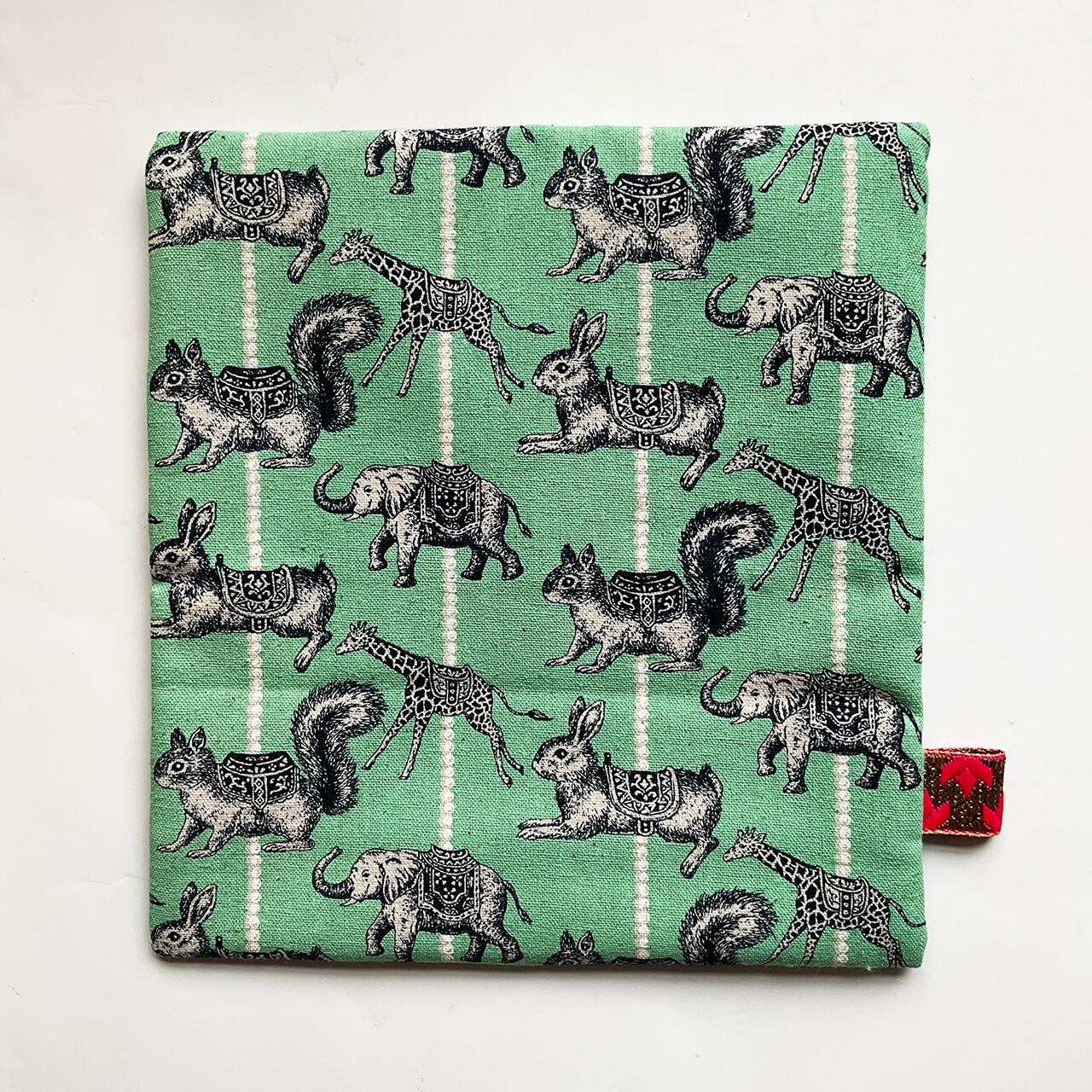 ぞう、きりん、うさぎ、りすがメリーゴーランドで回っているサーカスのようなヌノザイフができました。新色です。