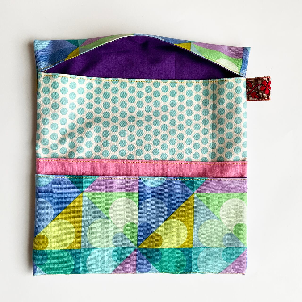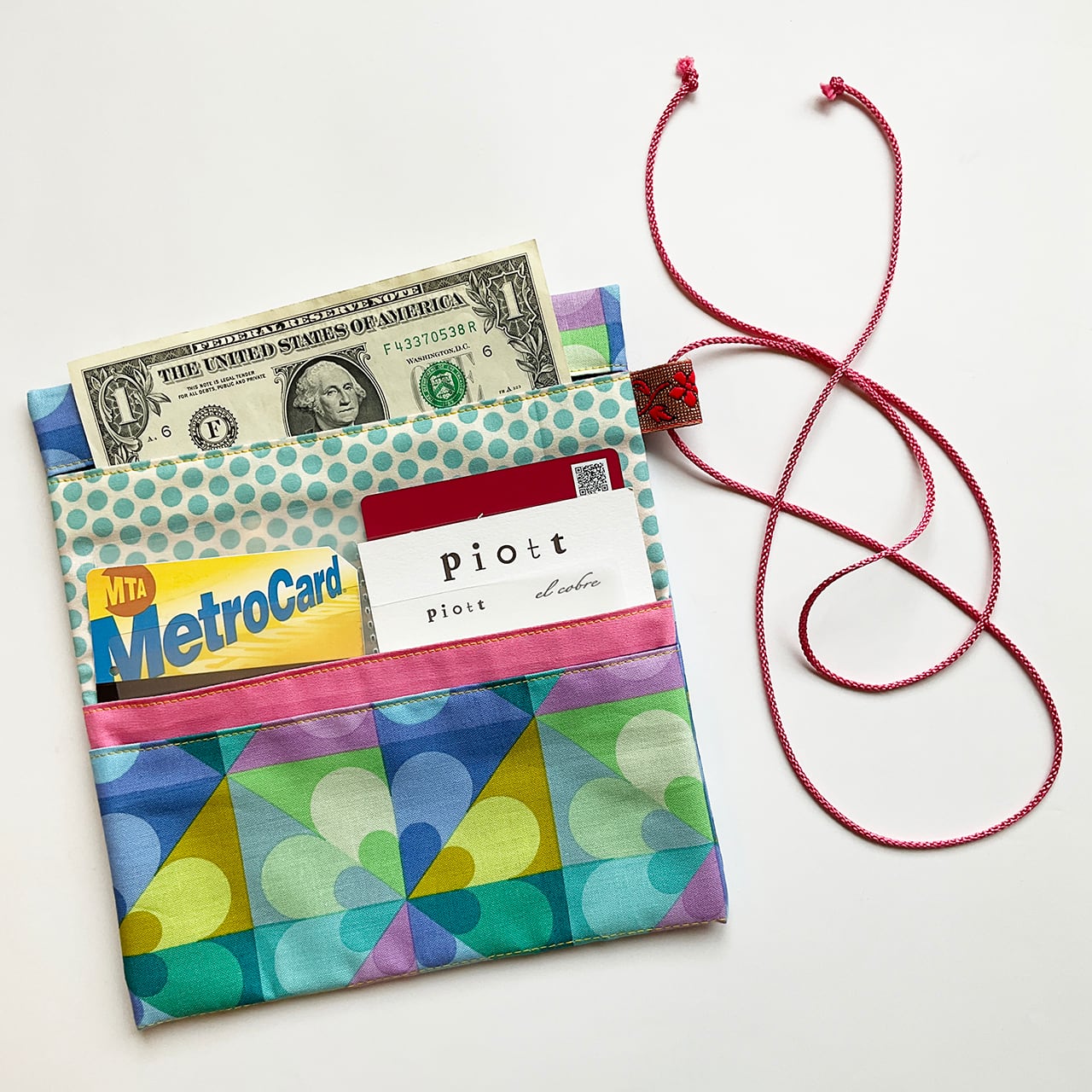 形は江戸の道中財布。欧米のデザインファブリックでポップに明るく作っています。