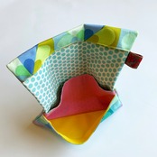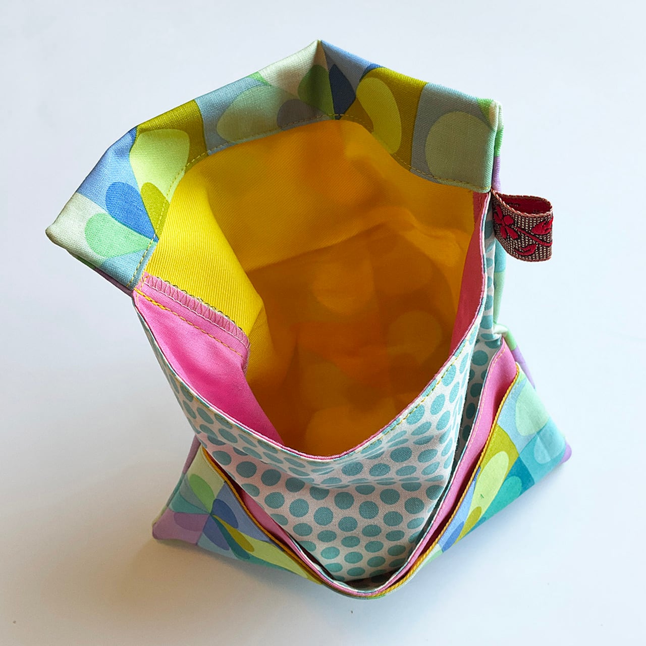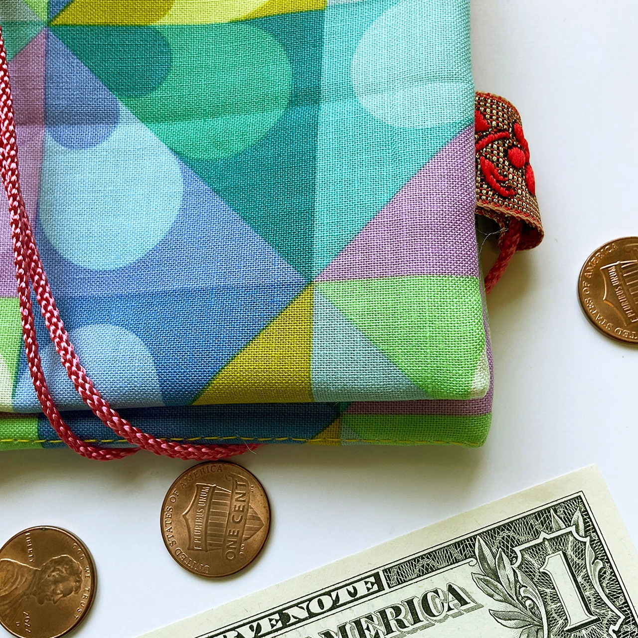 形は江戸の道中財布。欧米のデザインファブリックでポップに明るく作っています。