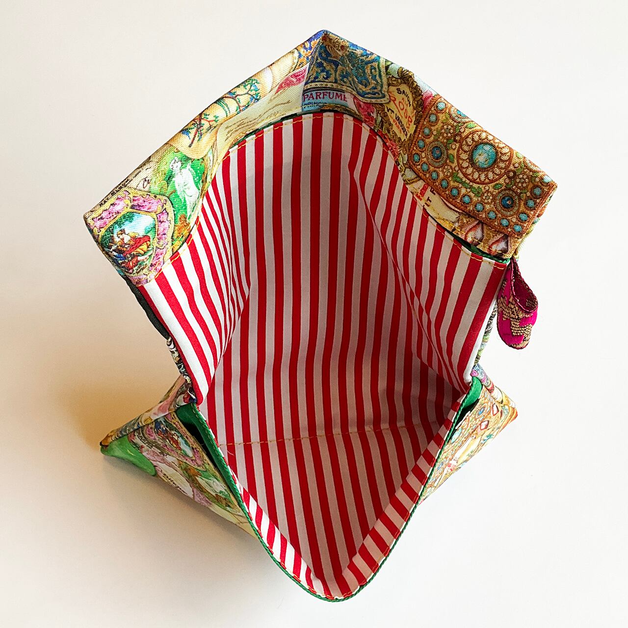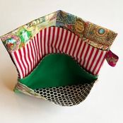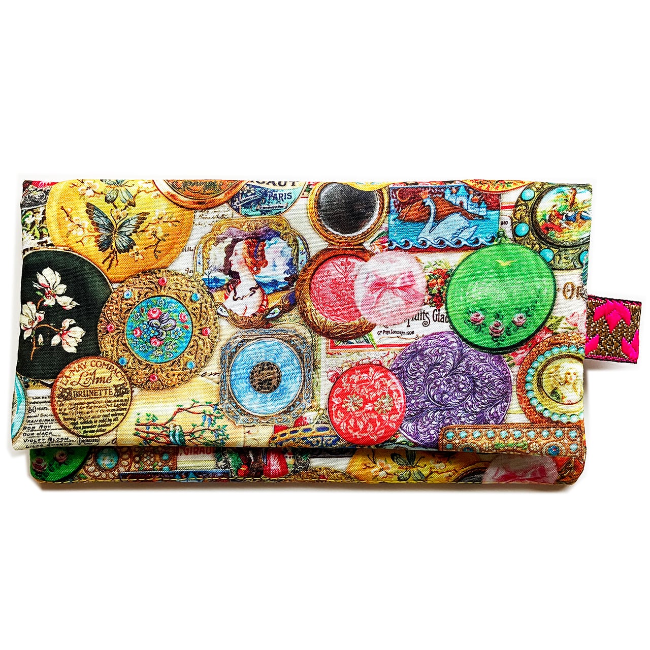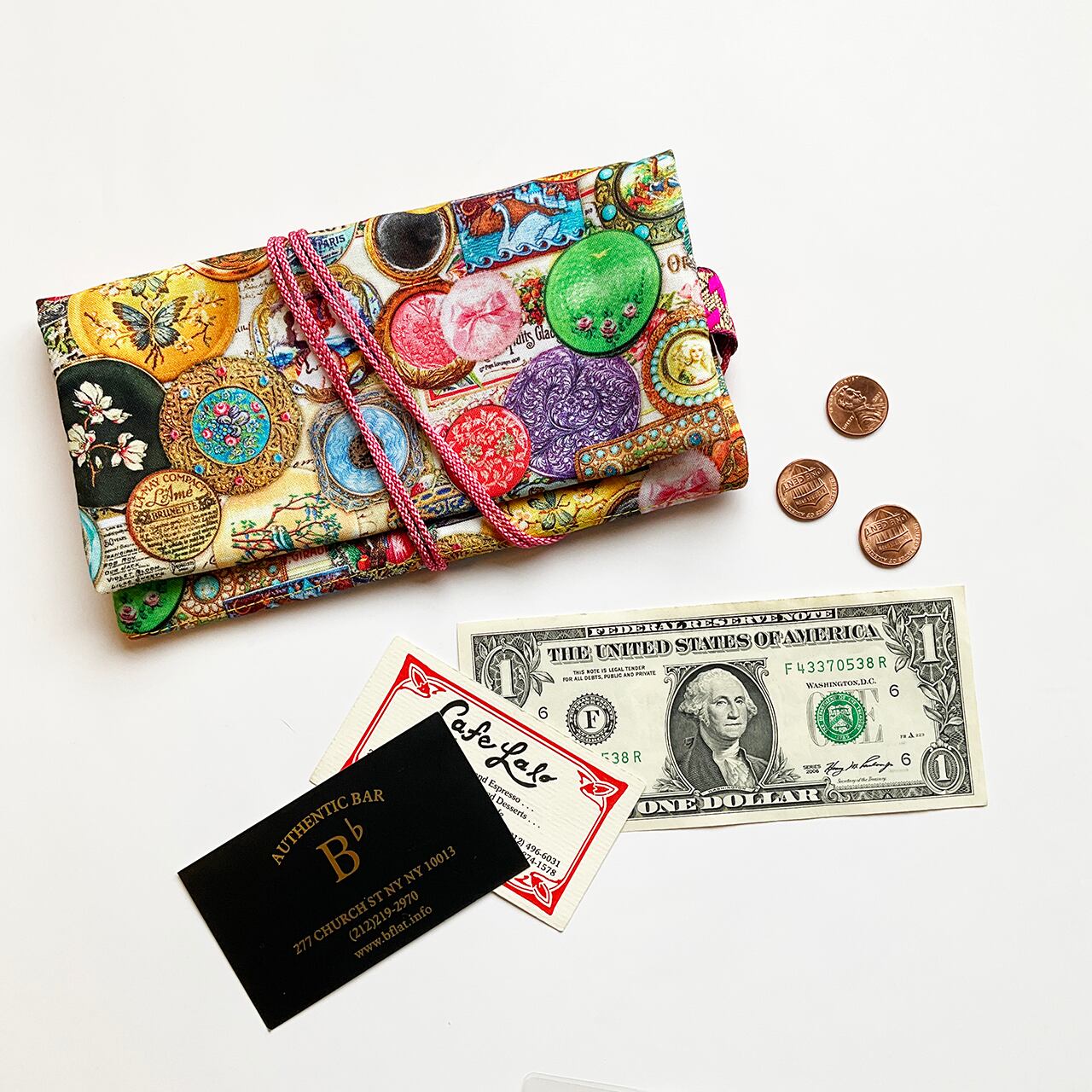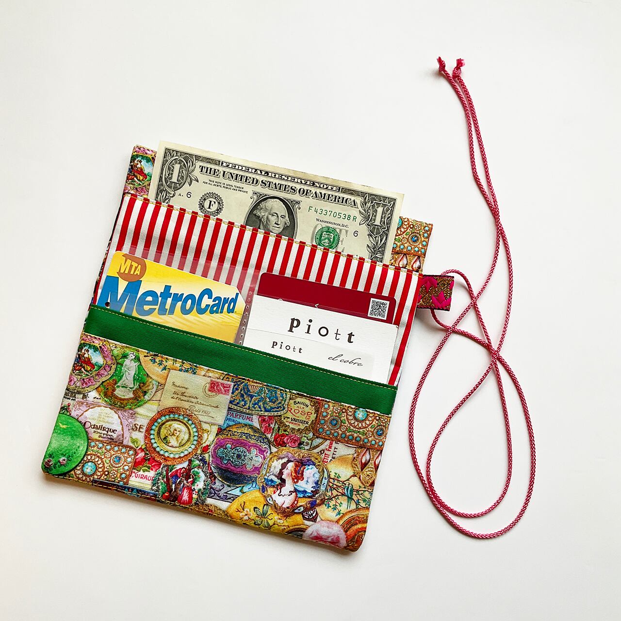 形は江戸の道中財布。欧米のデザインファブリックでポップに明るく作っています。