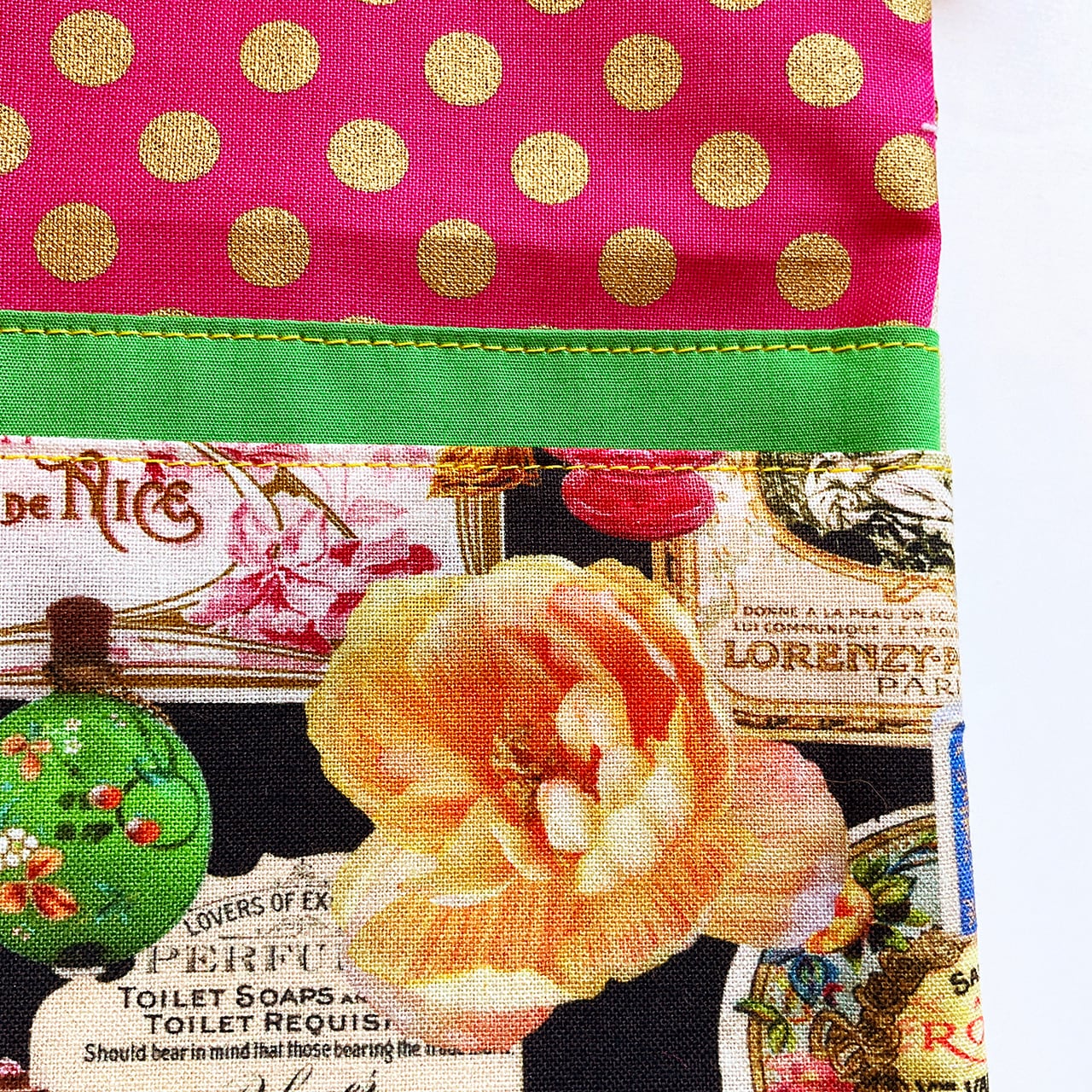 アンティークの香水瓶をコラージジュ。黒地。ヴィンテージやデッドストックの香水ビンのコレクションと、ボトルに移し替える前のデッドストック香水ラベルをコラージュした珍しい布。古き可愛さが全部詰まっています。