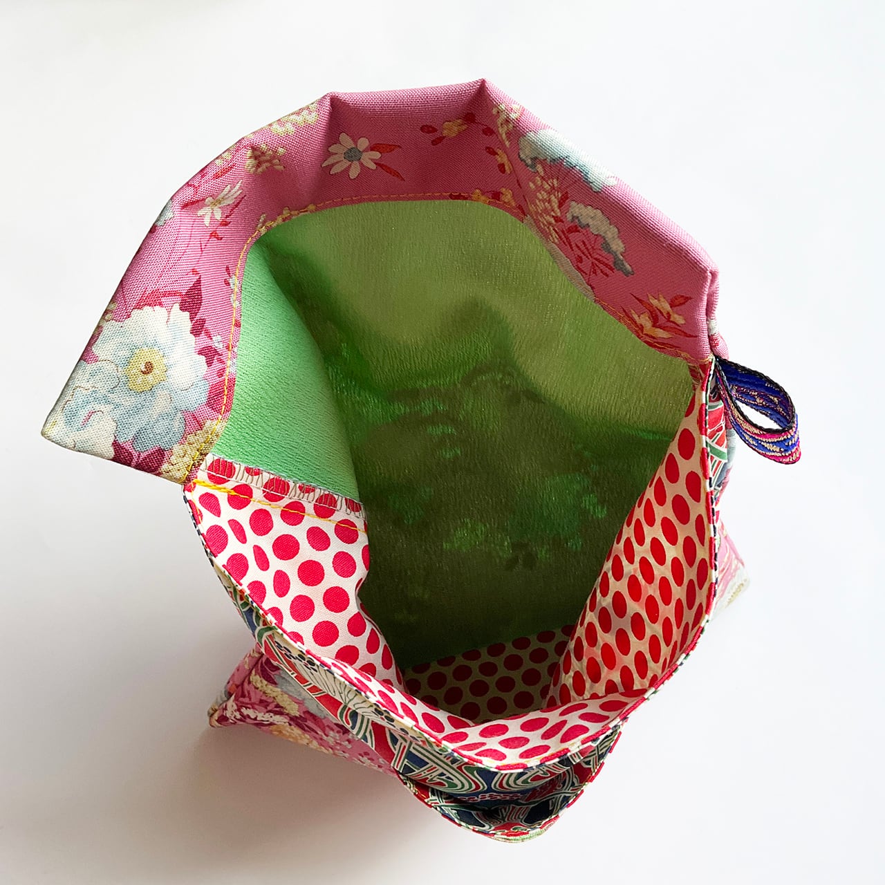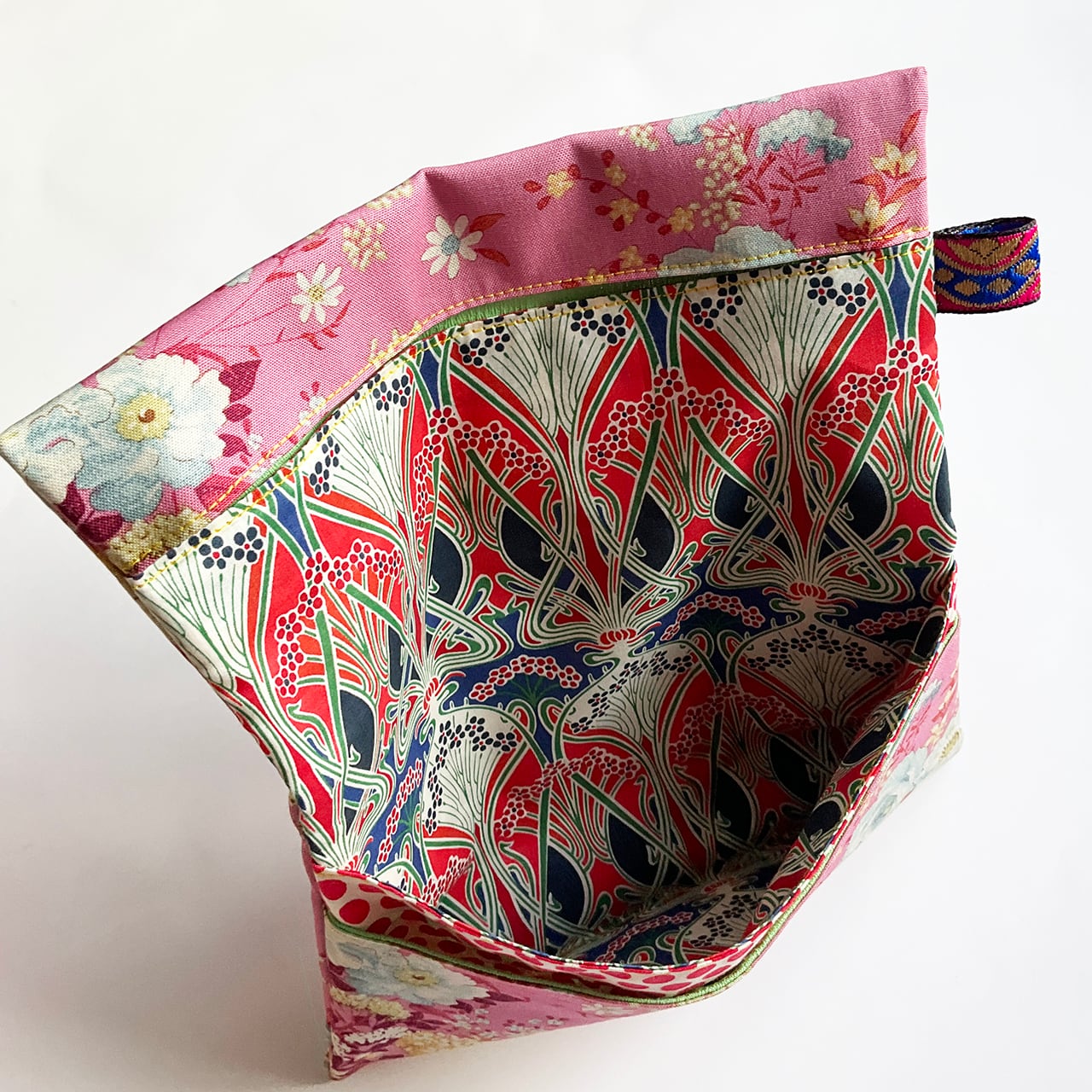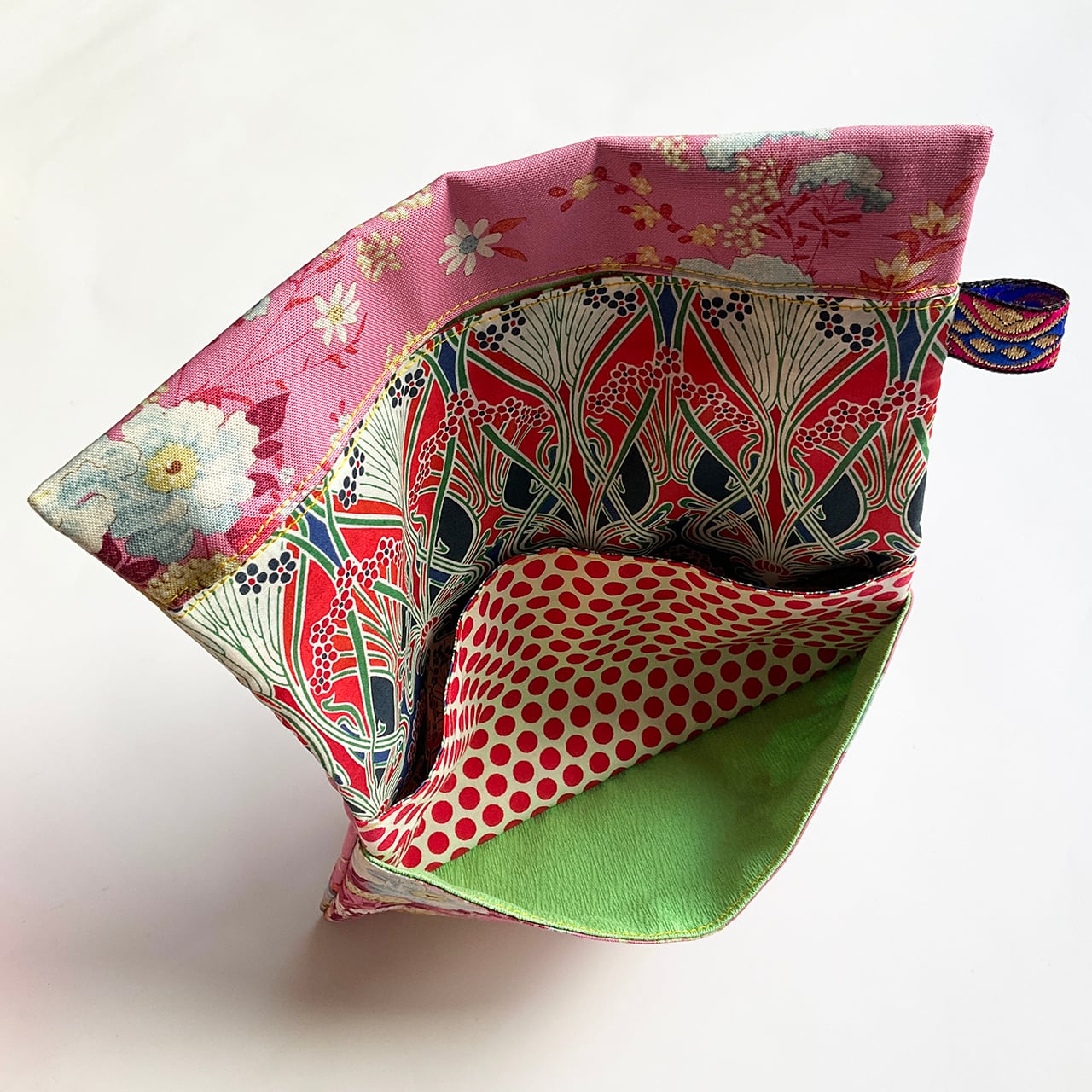 スモーキーでレトロなボタニカル柄は大人っぽくシックなカラーリングなので、思い切った組み合わせに。開けたときのギャップを楽しんでくれる方に気に入ってもらいたいな。かなり攻め攻めの攻めた一点です。対面販売でとても評判が良かったのでほぼ同じ布合わせで作ってみました。