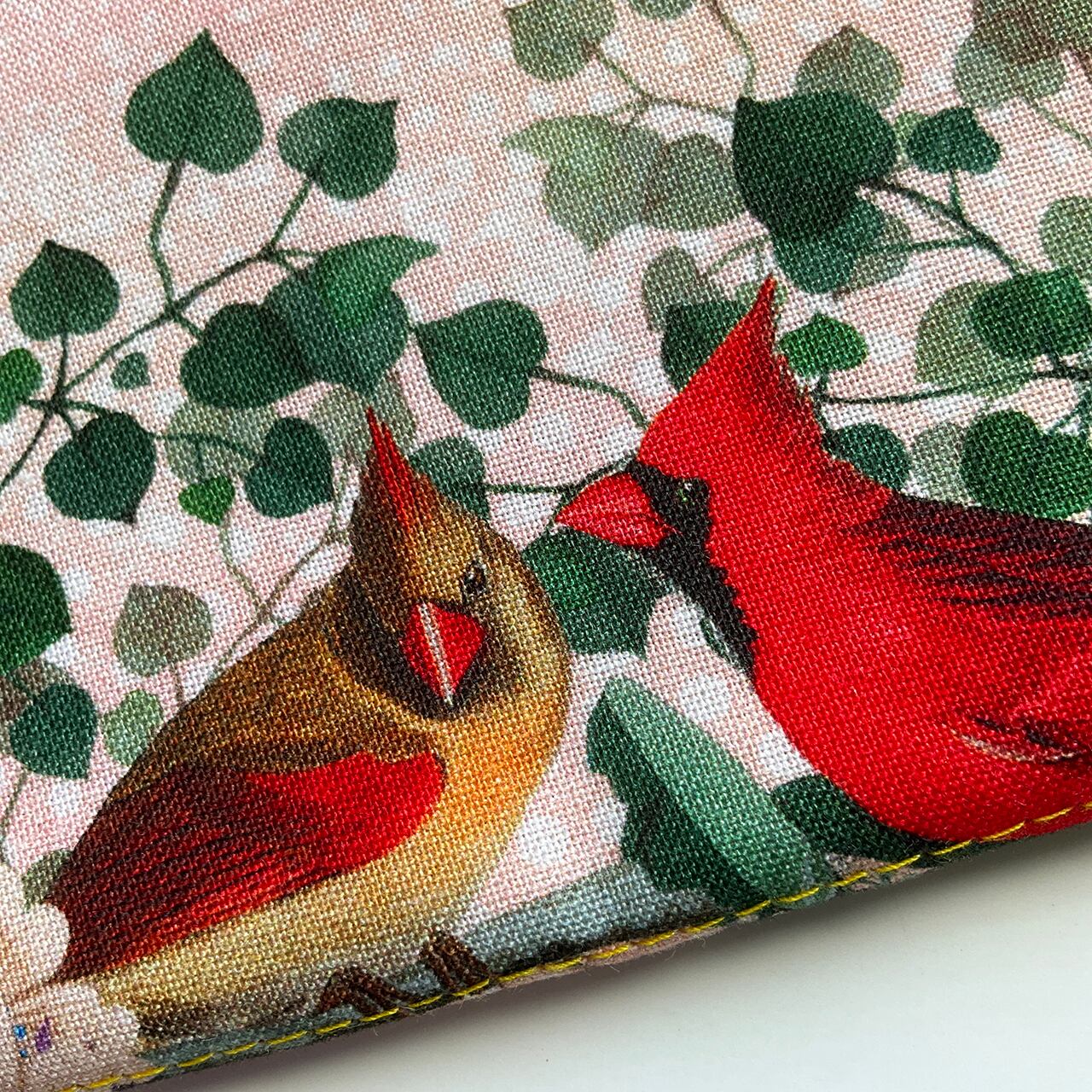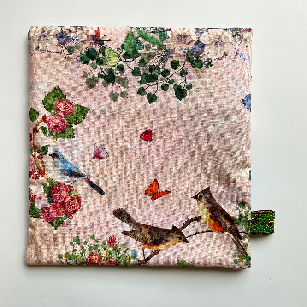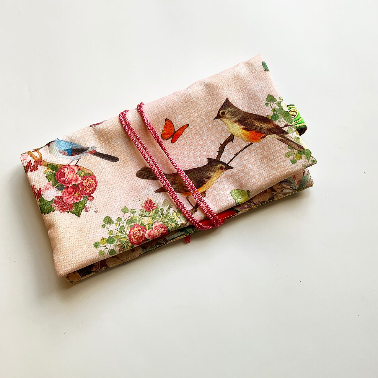 小鳥の図鑑のような柄布。カットする場所によって全く違う顔になります。開けた時にギャップを楽しんで布合わせ。ブロカントの鳥をあちこちに構成しました。余白を物語として楽しんでみてください。