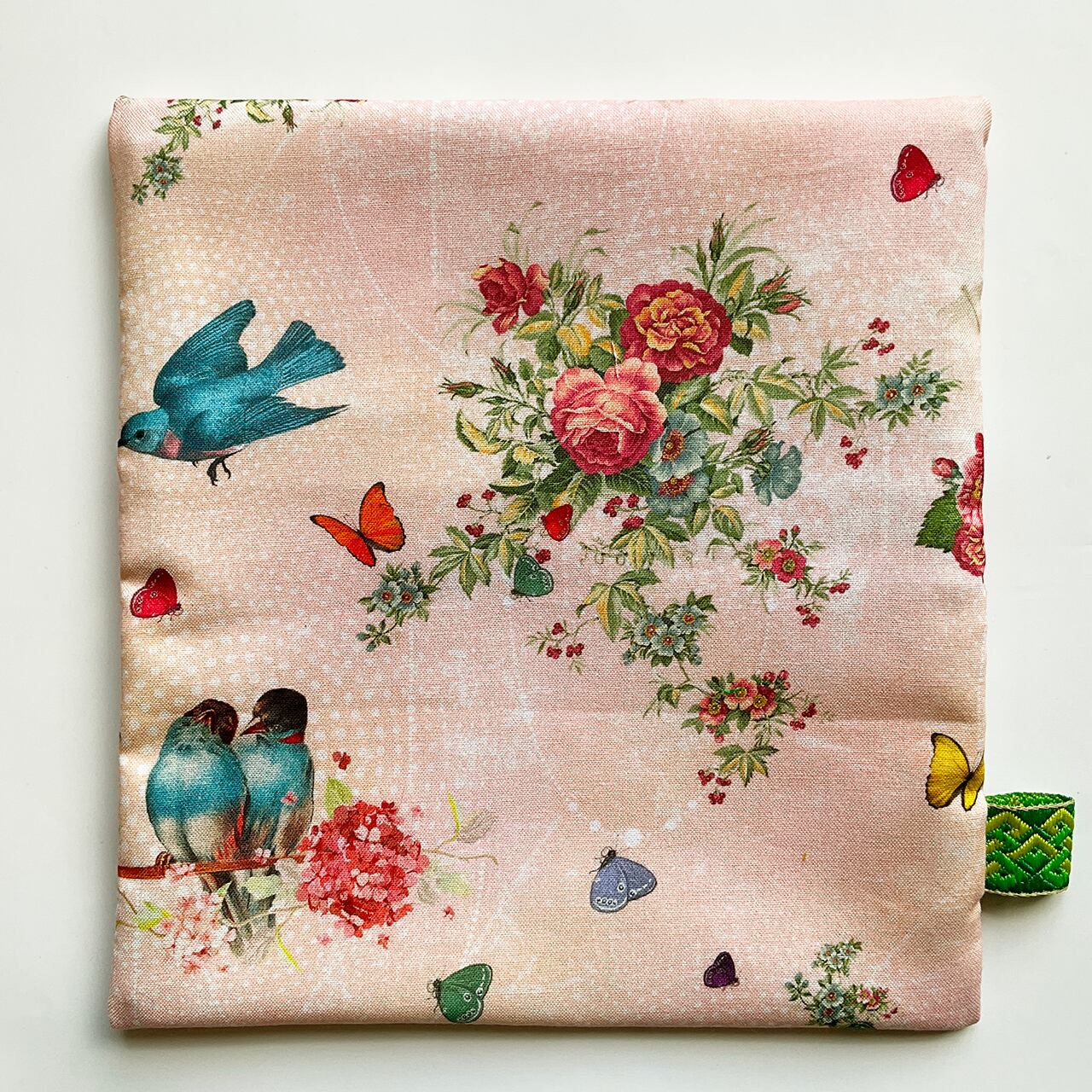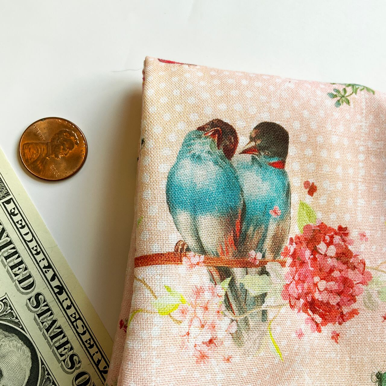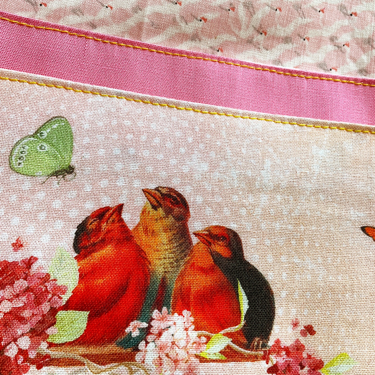 小鳥の図鑑のような柄布。カットする場所によって全く違う顔になります。ピンクブロカントのフワっとした世界のままに布合わせ。ピンクとクリーム色ってなんでこんなにカワイイんでしょう。