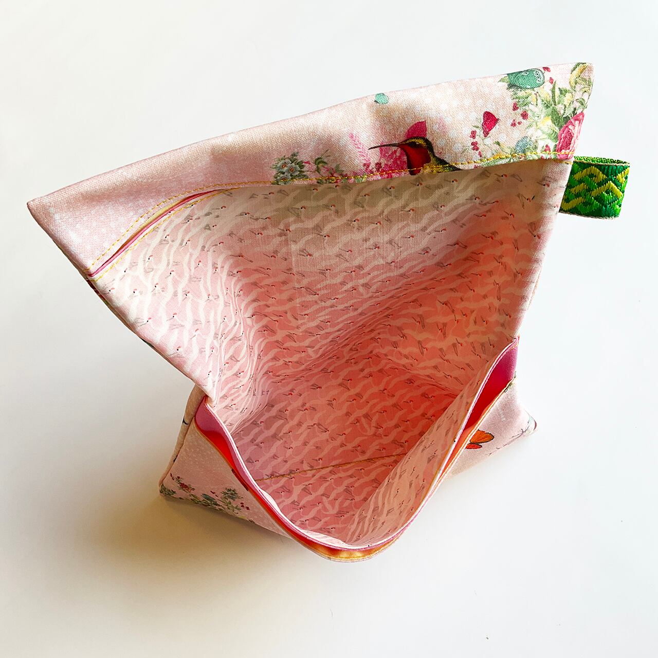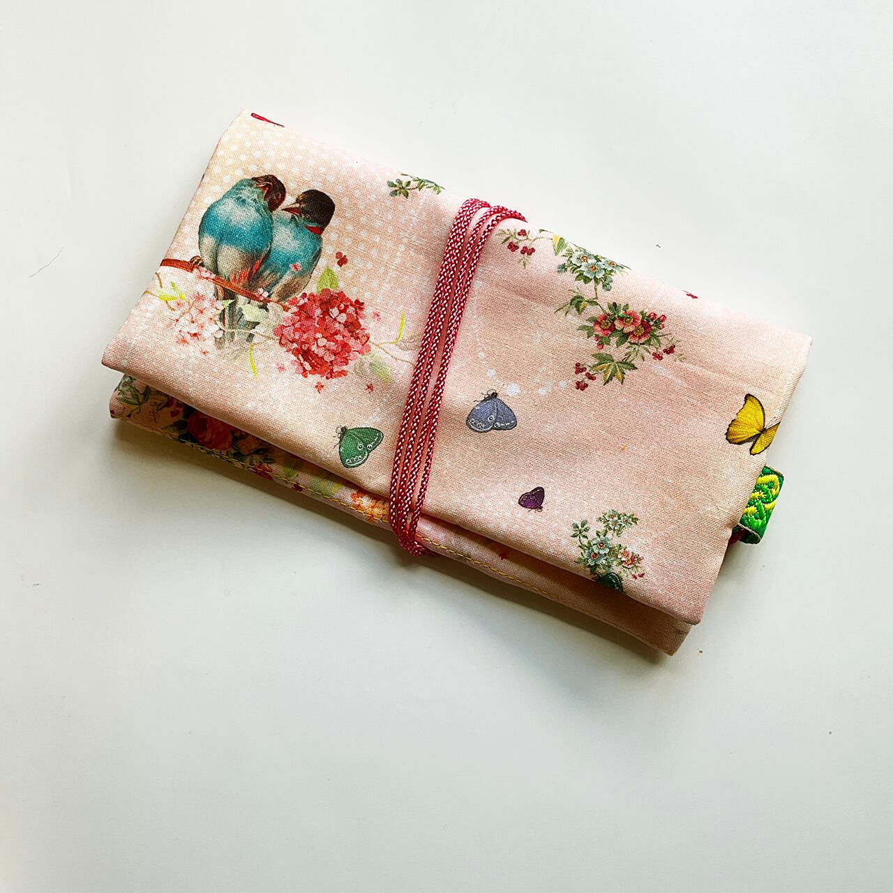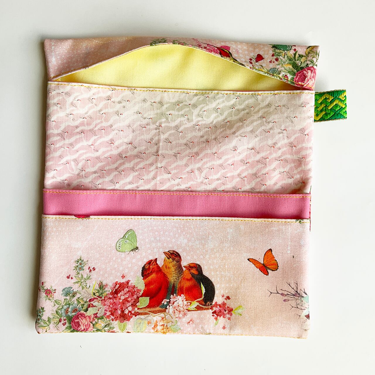 小鳥の図鑑のような柄布。カットする場所によって全く違う顔になります。ピンクブロカントのフワっとした世界のままに布合わせ。ピンクとクリーム色ってなんでこんなにカワイイんでしょう。