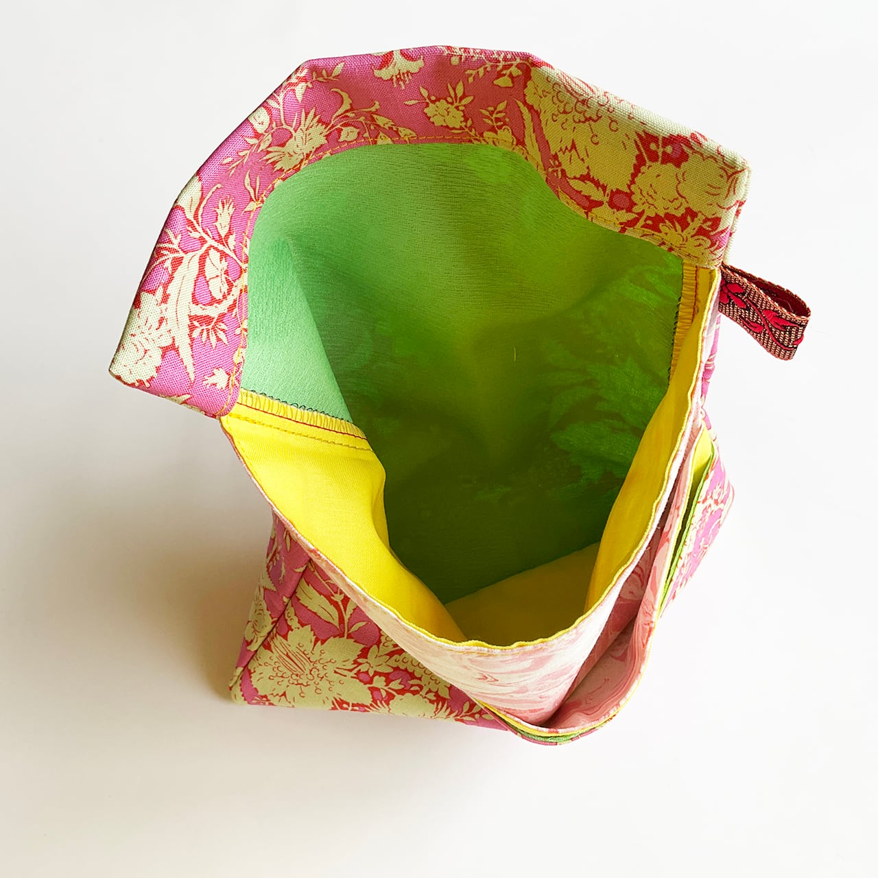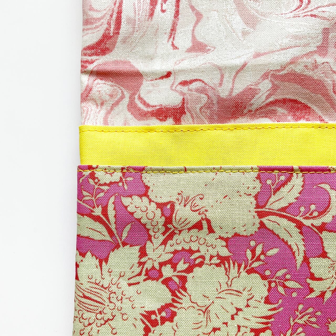優しく明るい二色を赤が縁取る洒落たデザインの布。色数が少ないけれどPOPで高級感のある一点になりました。中布を墨流しにしたら、ロマンチックなようで退廃的なオンリーワンな一点になりました。