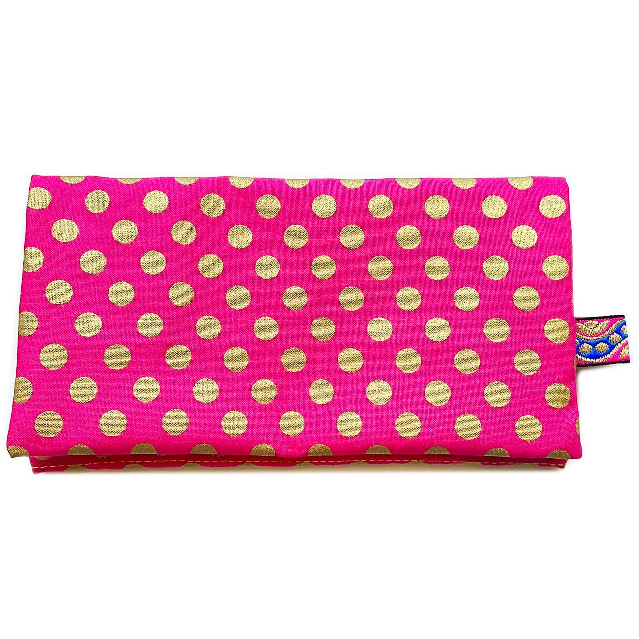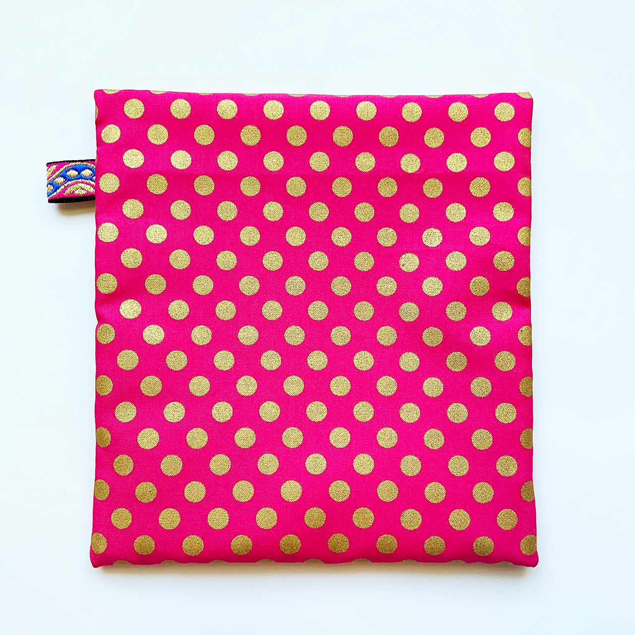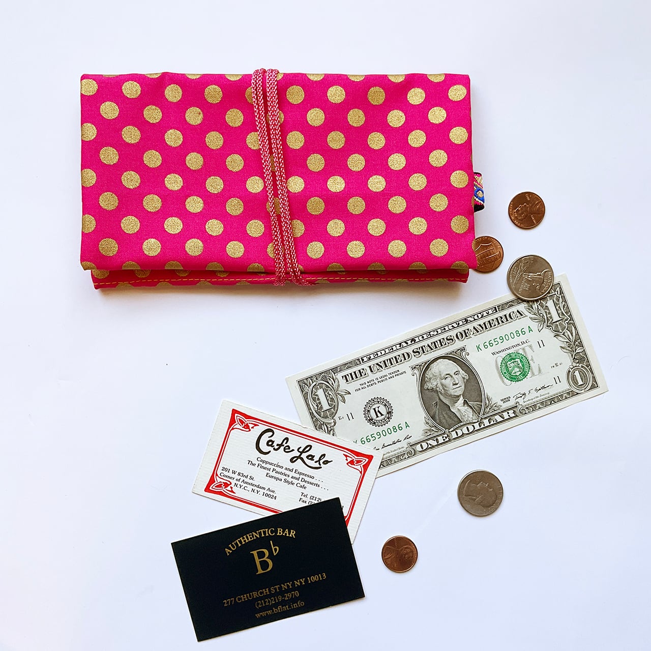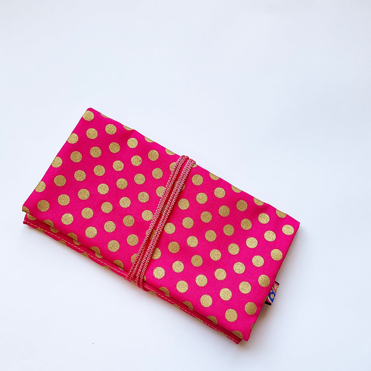 濃いピンクに濃いめの金箔のしっかりしたドット。中布、ちらみえ、インナー共に完璧にソリッドな、私好みのヌノザイフになりました。静かなpopでテクノっぽくもあり組み合わせ大満足の仕上がり。おもいのほかクール。すべてドットは初めての組み合わせ!