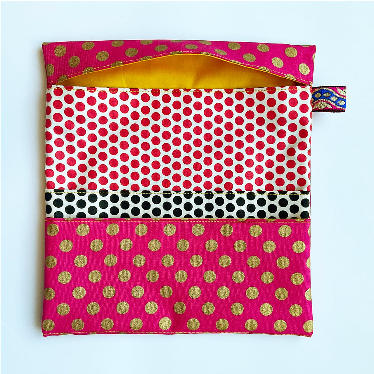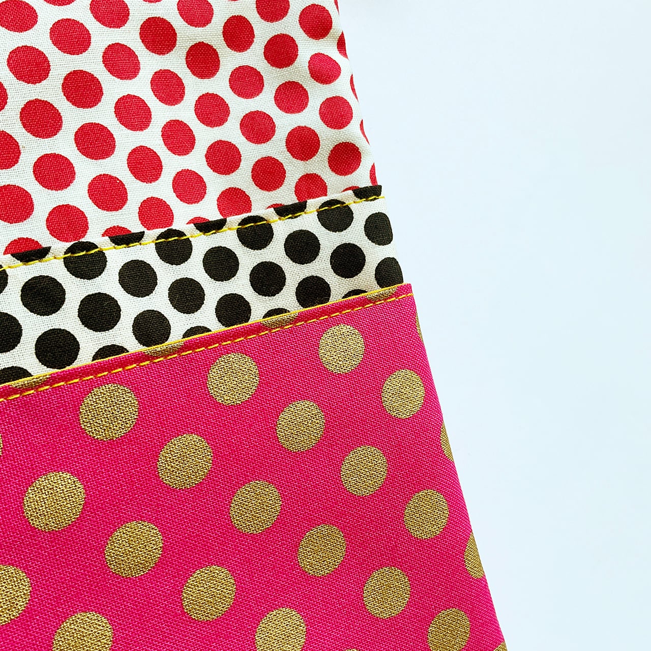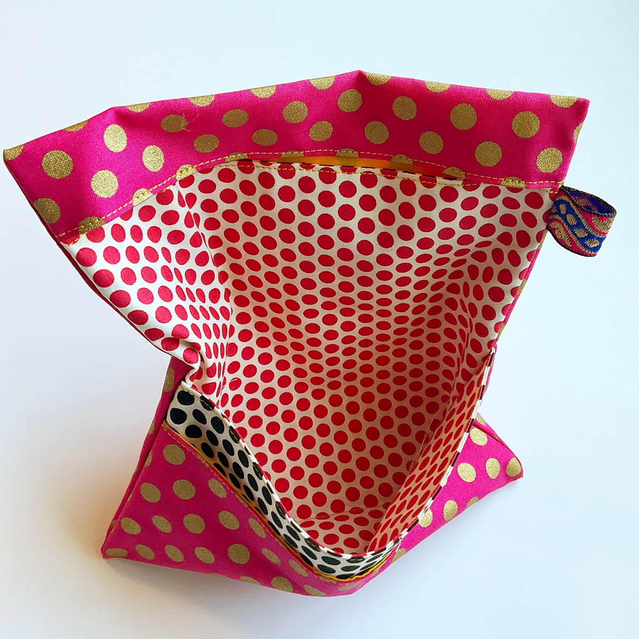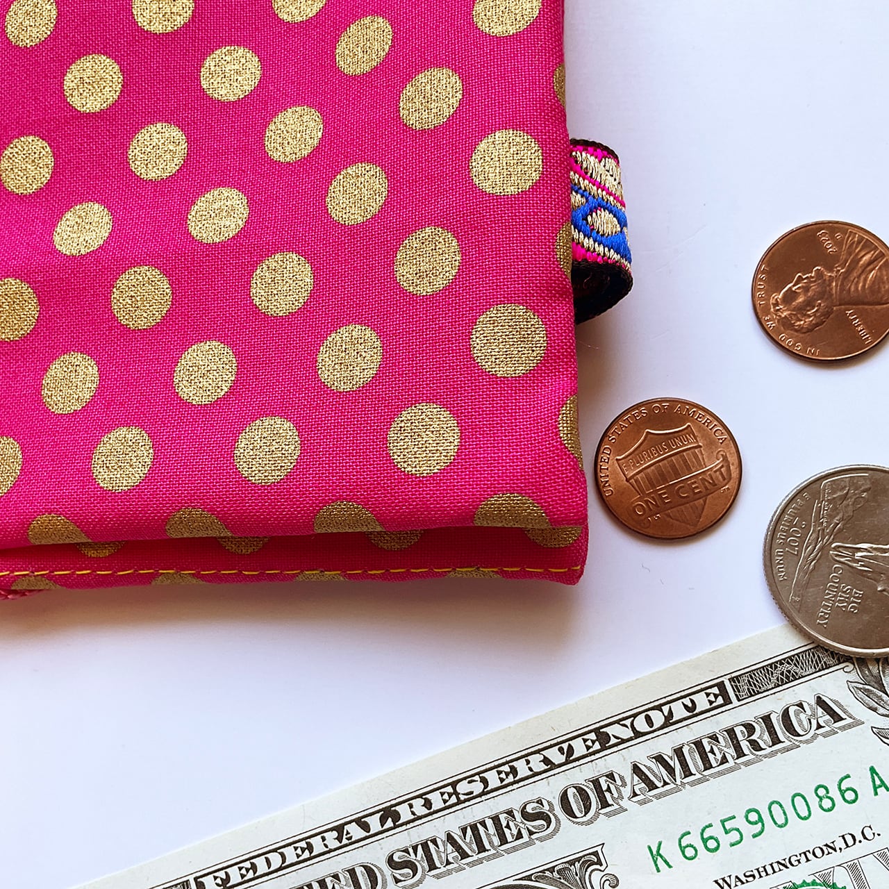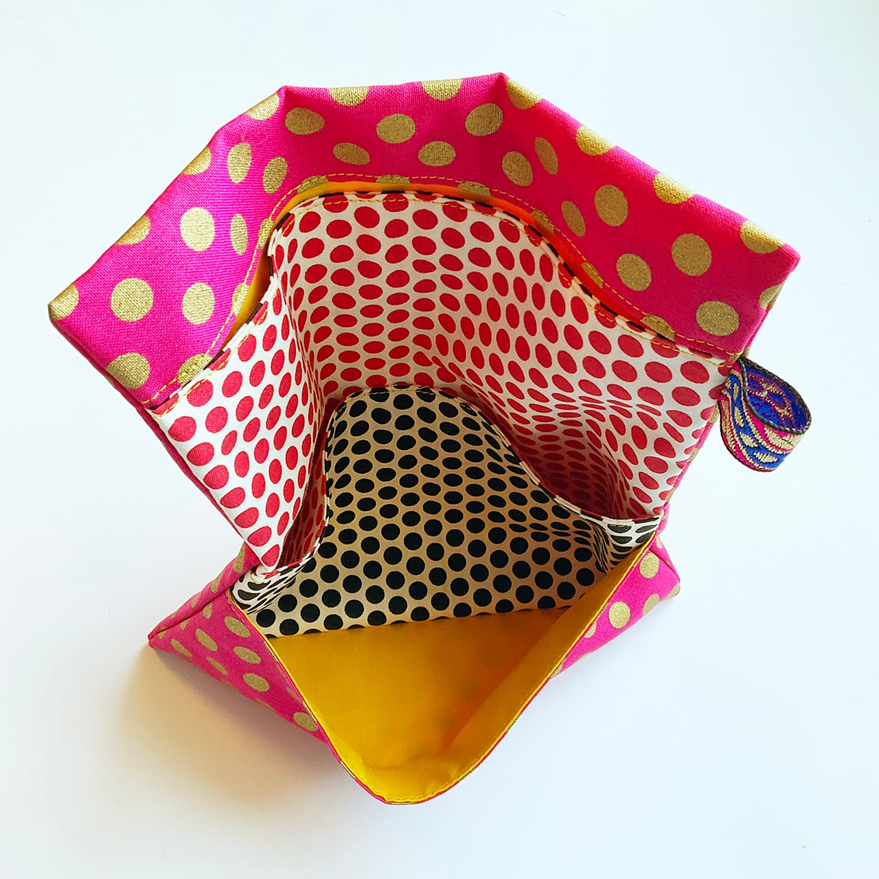 濃いピンクに濃いめの金箔のしっかりしたドット。中布、ちらみえ、インナー共に完璧にソリッドな、私好みのヌノザイフになりました。静かなpopでテクノっぽくもあり組み合わせ大満足の仕上がり。おもいのほかクール。すべてドットは初めての組み合わせ!