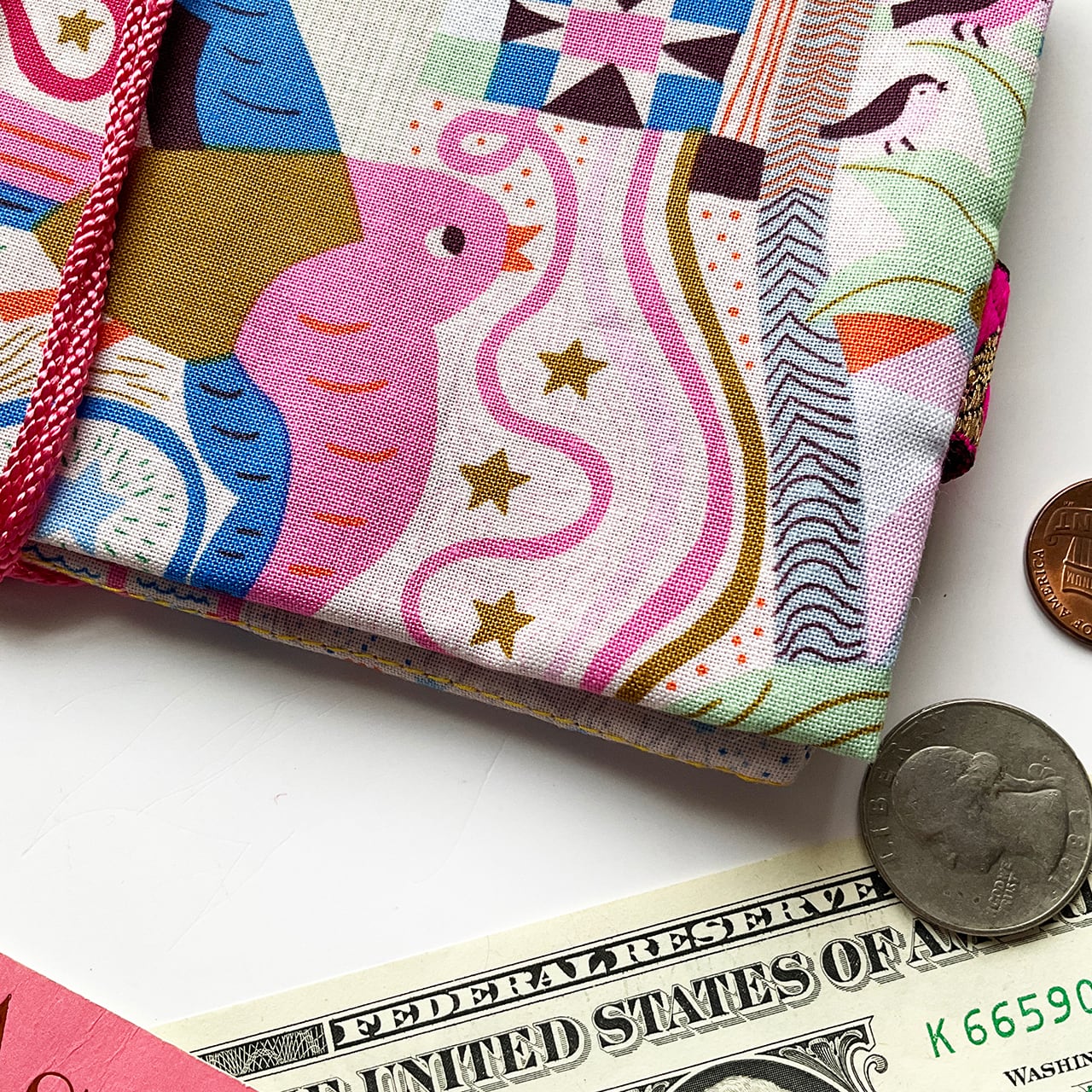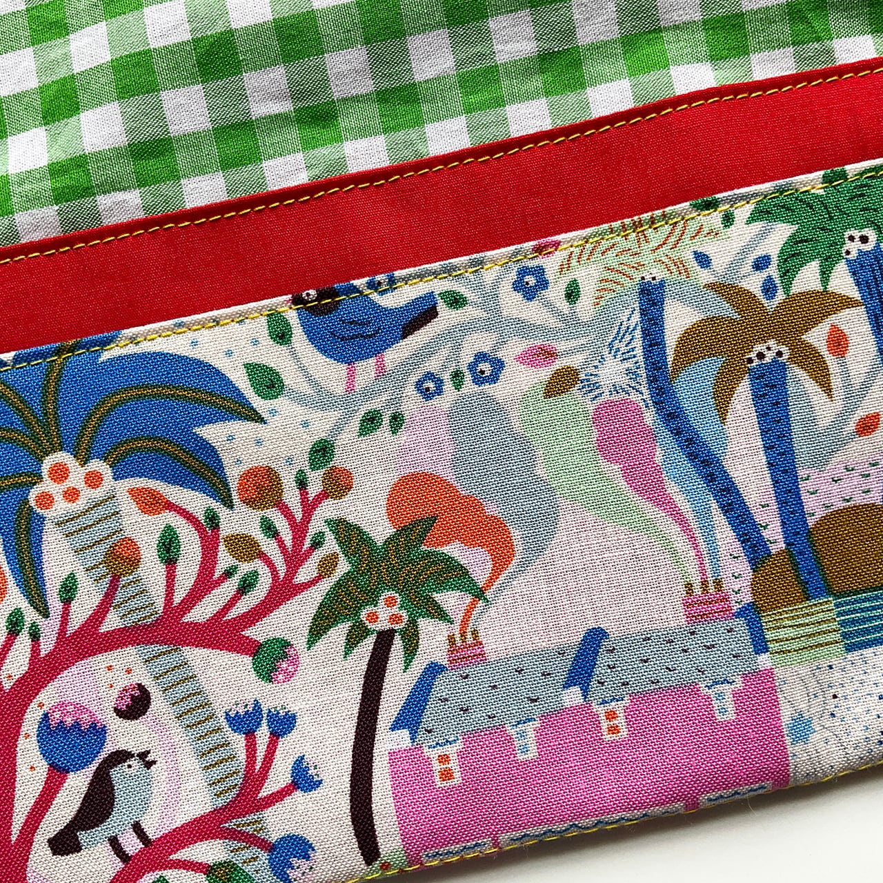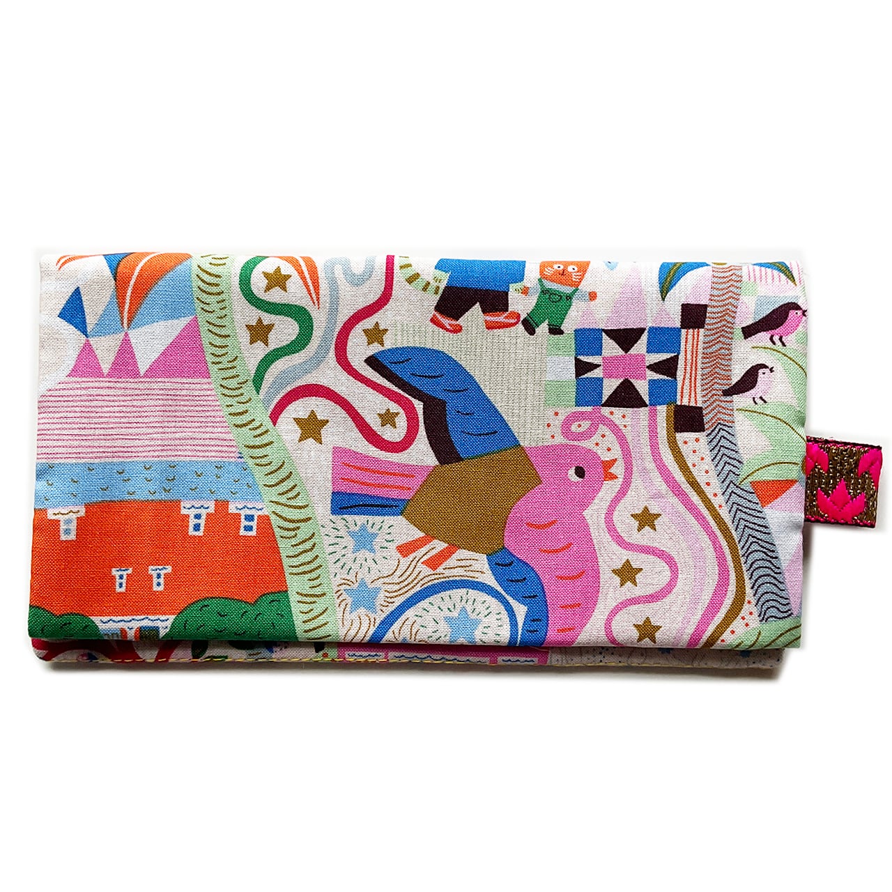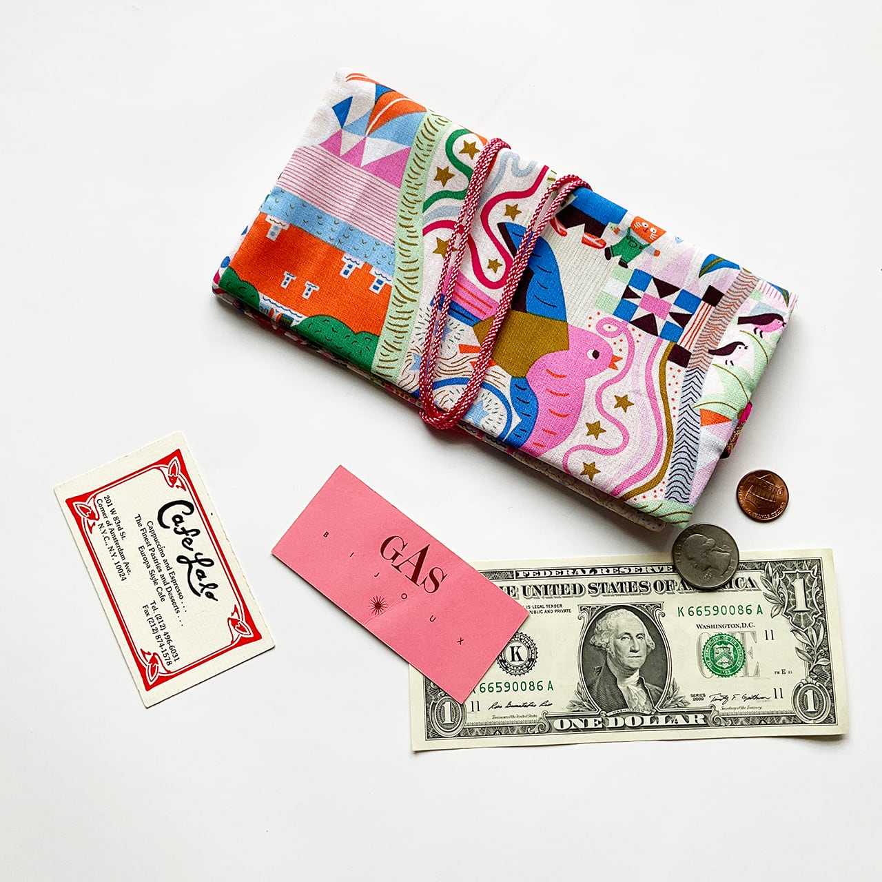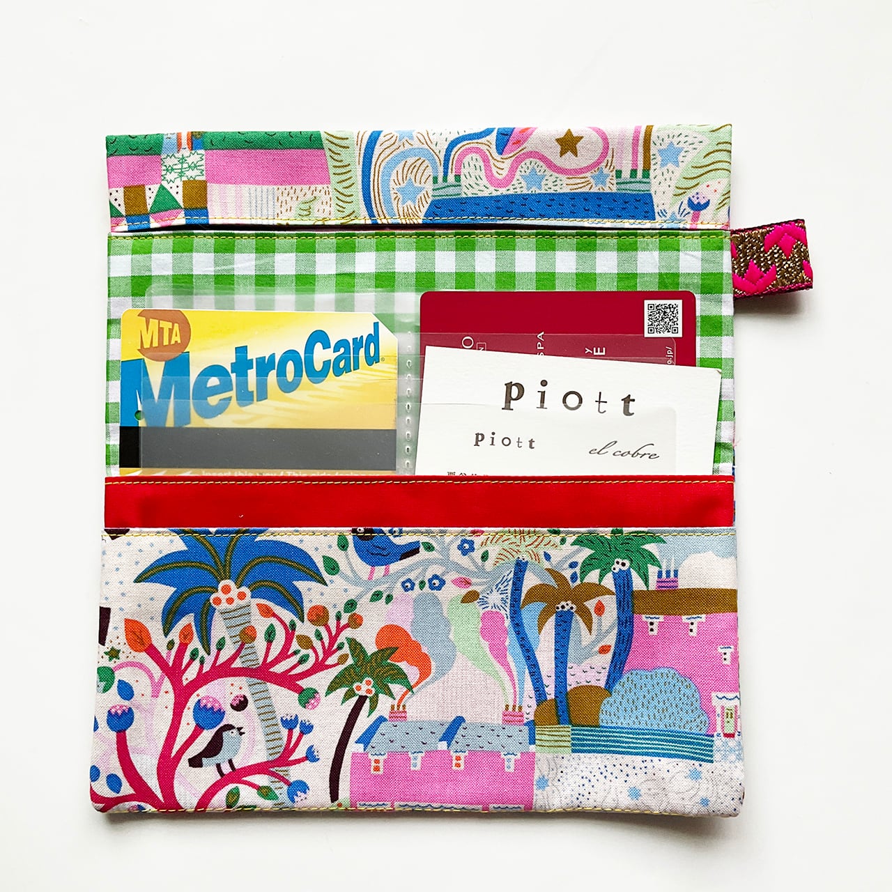 形は江戸の道中財布。欧米のデザインファブリックでポップに明るく作っています。