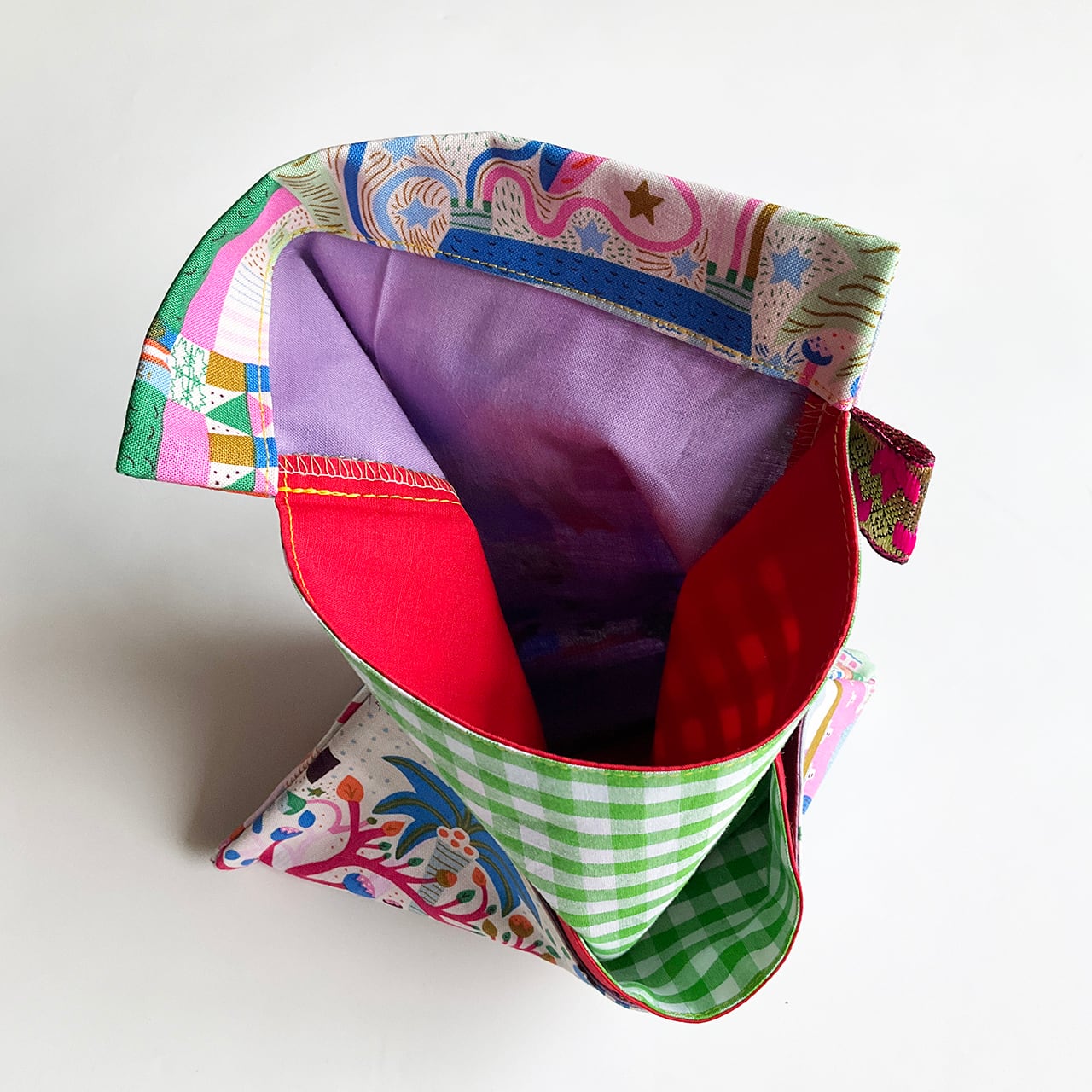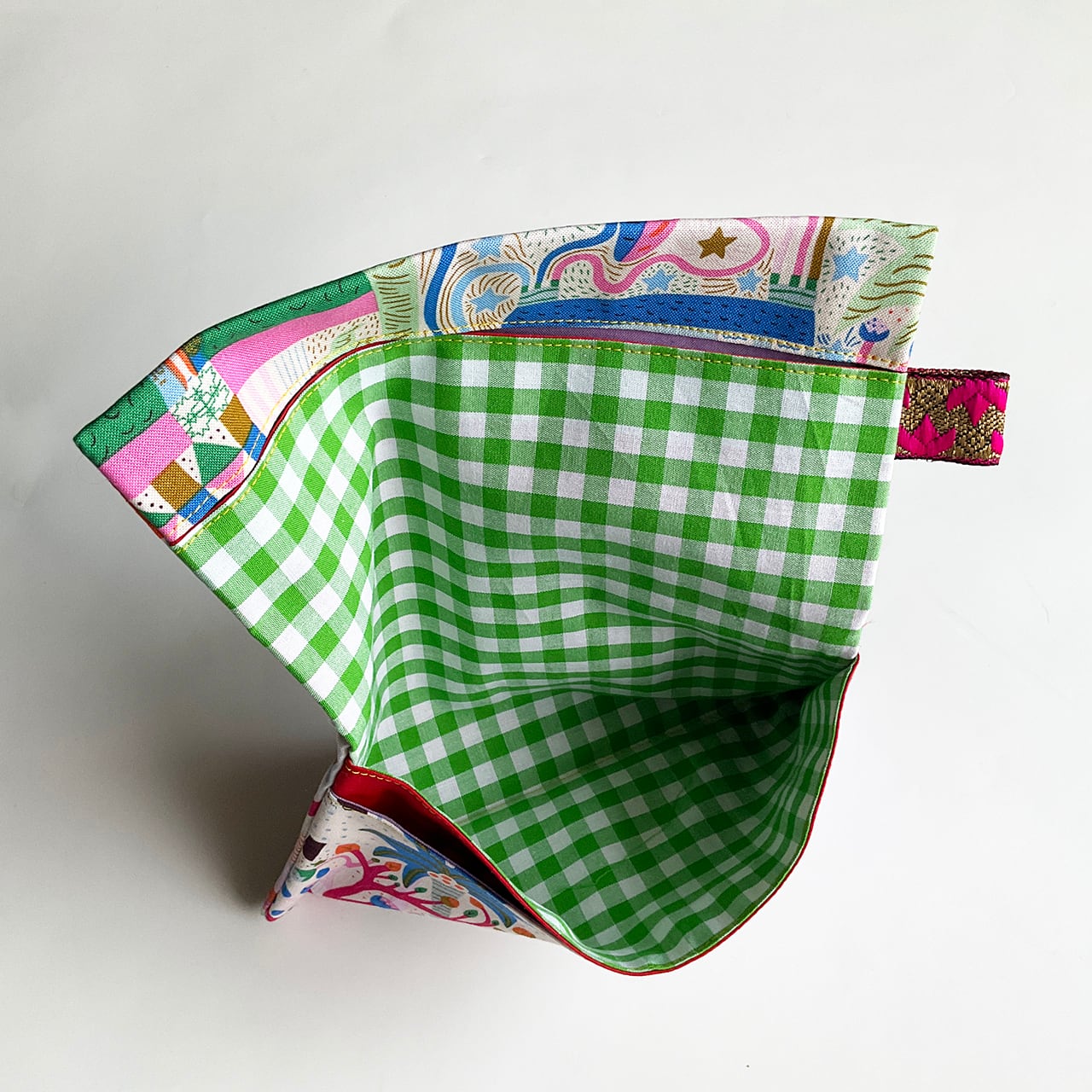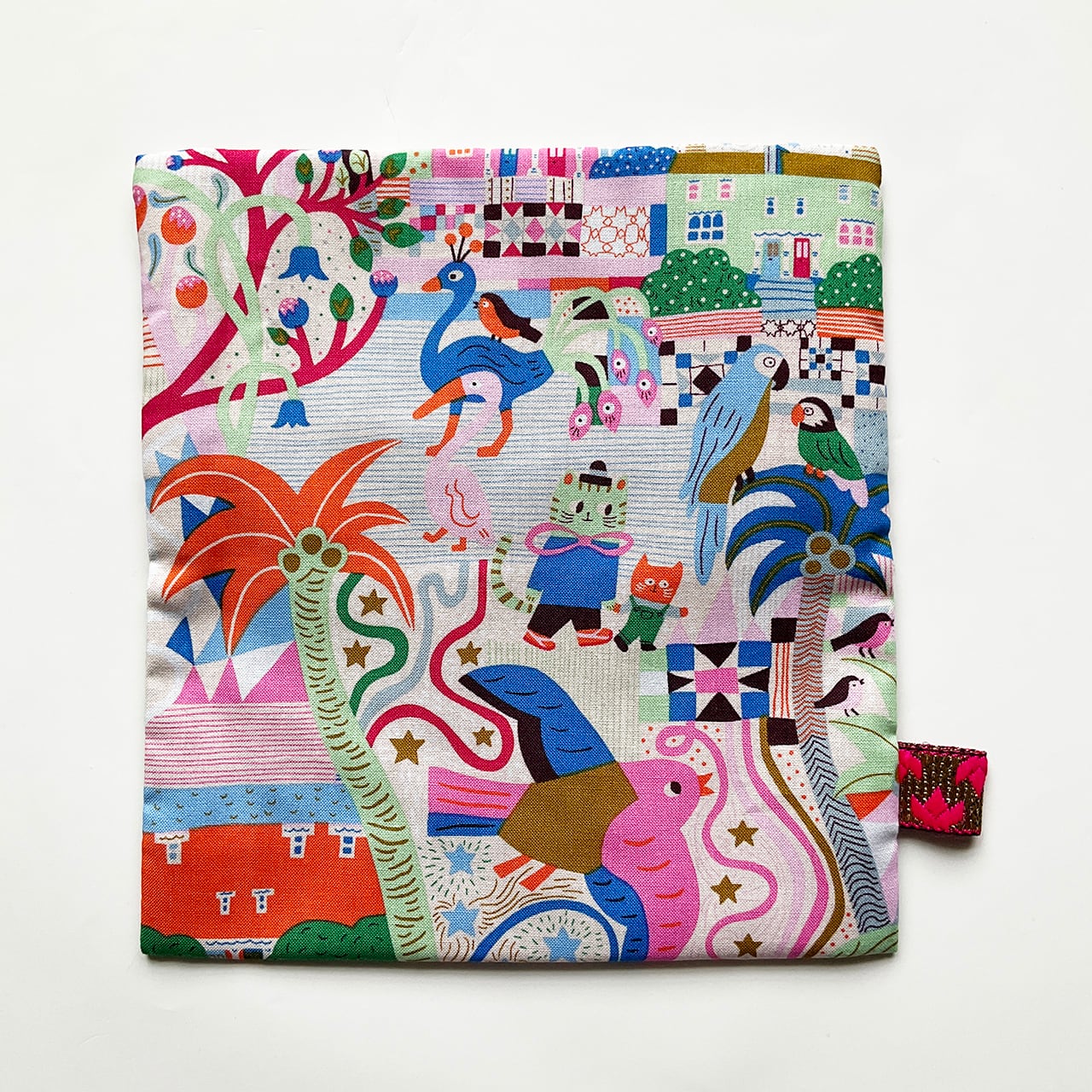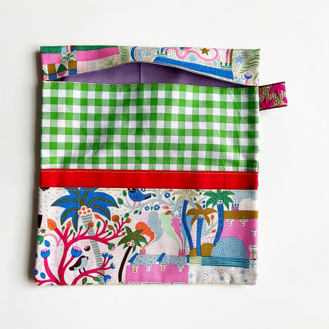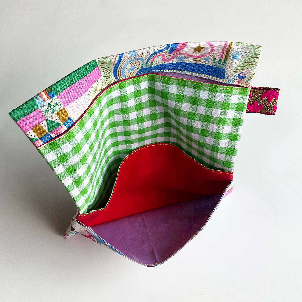 形は江戸の道中財布。欧米のデザインファブリックでポップに明るく作っています。