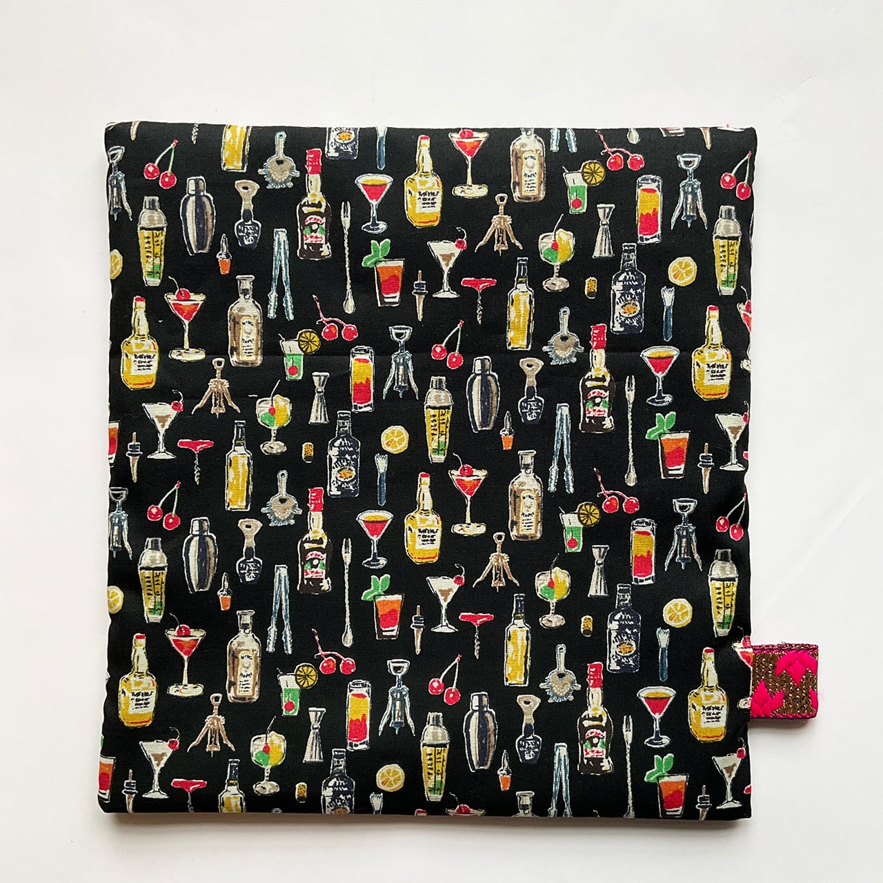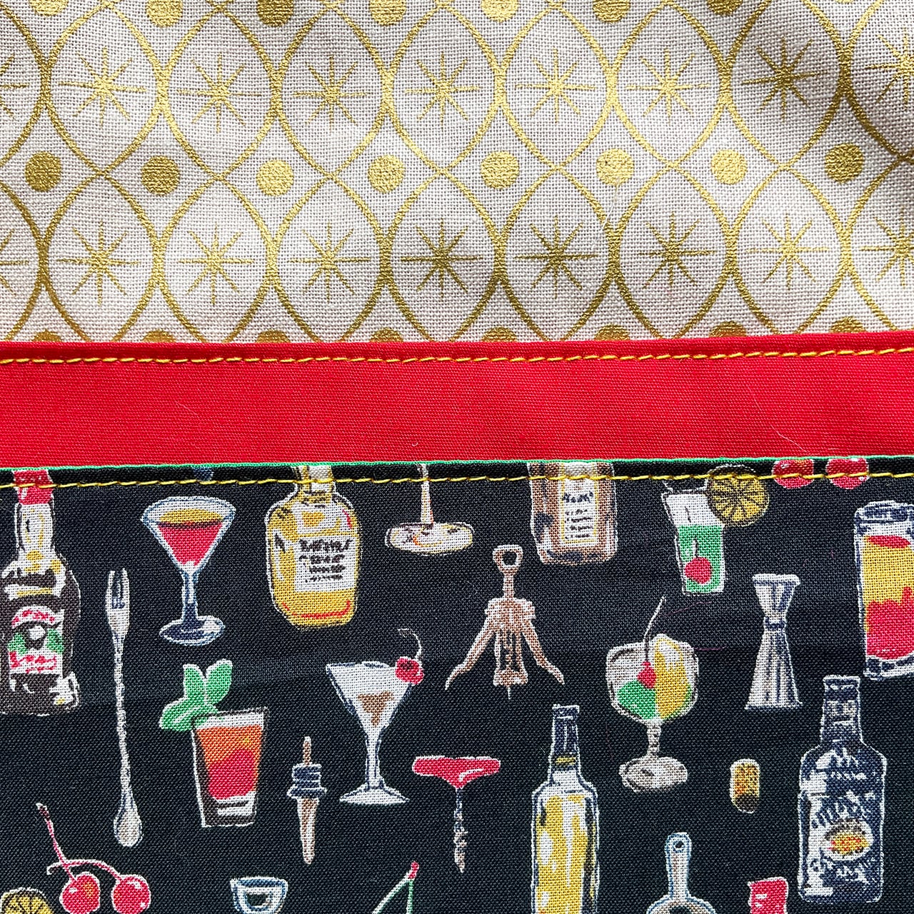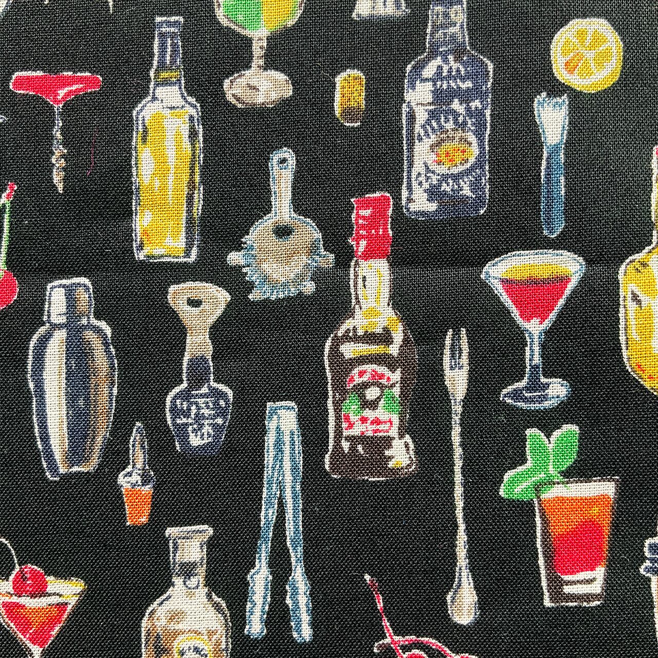 お初です!バーの柄。小さなイラストのカクテルグッズたち。京都で素敵なバーに行った次の日に、布屋さんで見つけたのでこれは運命だと思って買った布。弾ける炭酸をイメージして布合わせ。この可愛くて小さいイラスト手にとってみてほしい。