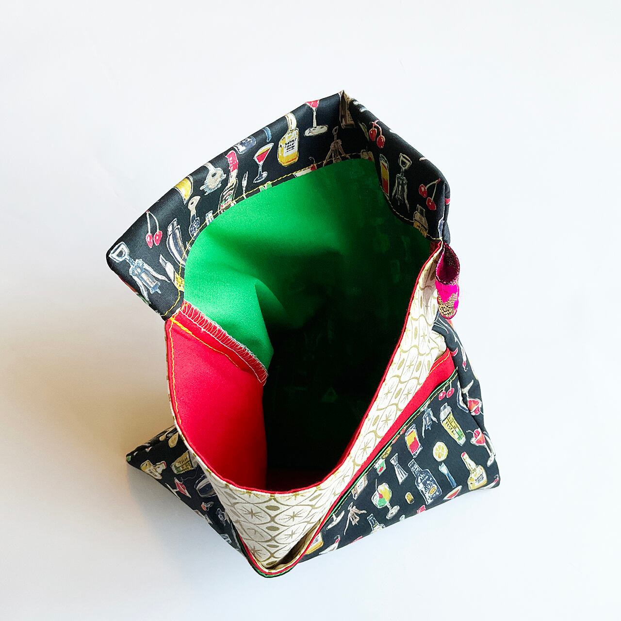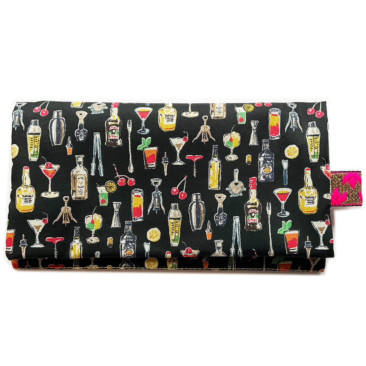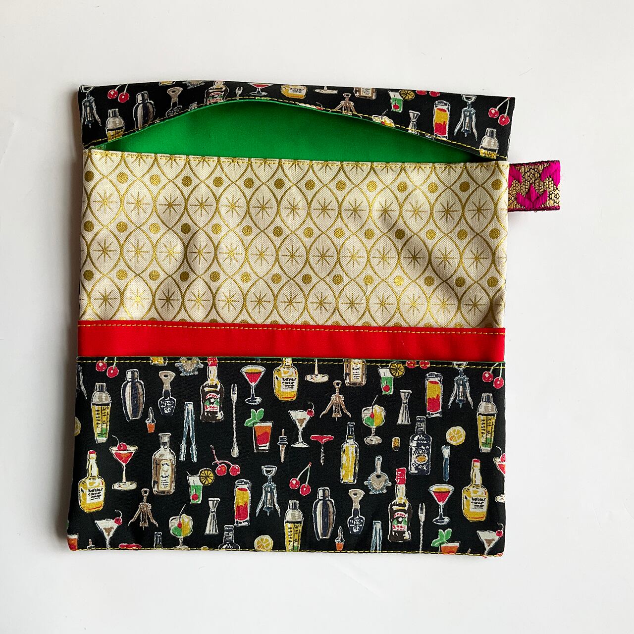 お初です!バーの柄。小さなイラストのカクテルグッズたち。京都で素敵なバーに行った次の日に、布屋さんで見つけたのでこれは運命だと思って買った布。弾ける炭酸をイメージして布合わせ。この可愛くて小さいイラスト手にとってみてほしい。