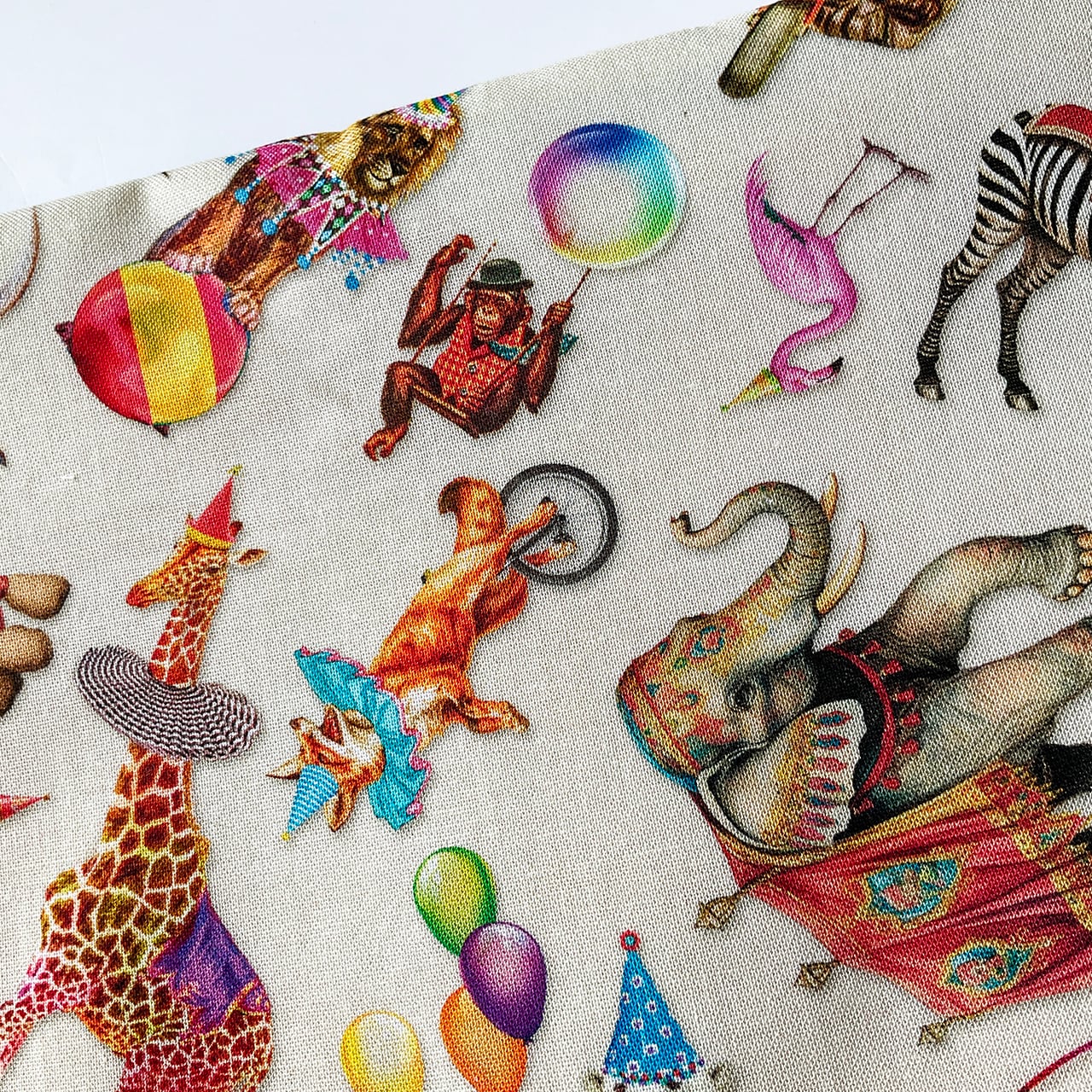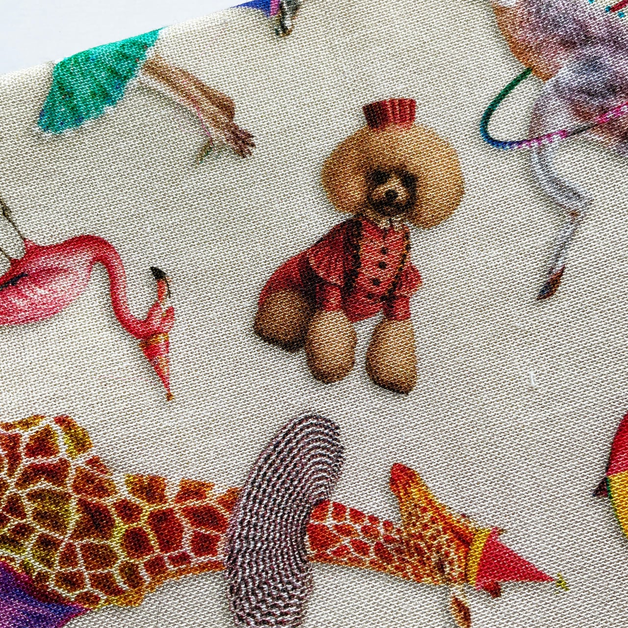 お初です! 存在は知っていたけれど、実物の布を見たら買わずに折れなかった、ハッピーな布。飴色虹色のサーカス小屋。細部見れば見るほど飽きない、たまらないかわいさ。