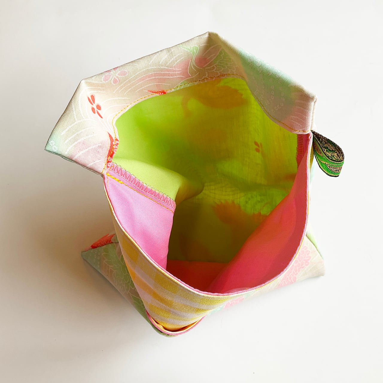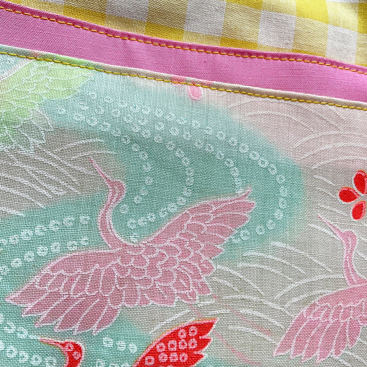 蛍光モスリンを使ったボンボンのような甘い一点。モスリンのパウダーな世界が大好きなので大切に布合わせ。昭和レトロになりすぎないように、軽く明るく布合わせを心がけます。