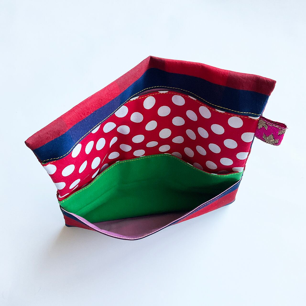 思い立ってデッドストックの布で色とりどりに作って使っていたら、「かわいい!どこで買ったの?私も欲しい!」「こういう軽い財布を探していたよ」とたびたび言われるようになりましたので、sawing club で作ってお裾分けすることにしました。