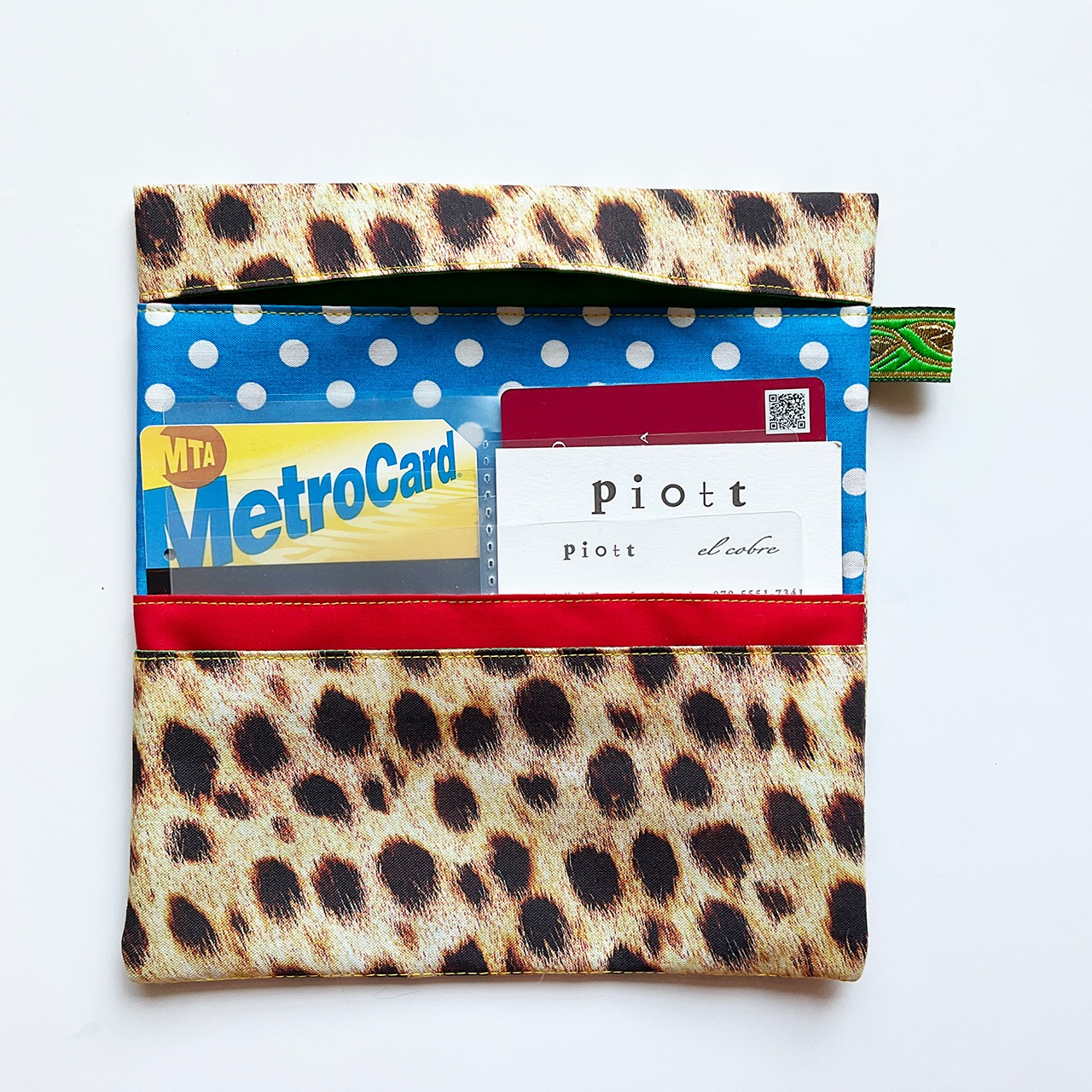 形は江戸の道中財布。欧米のデザインファブリックでポップに明るく作っています。