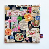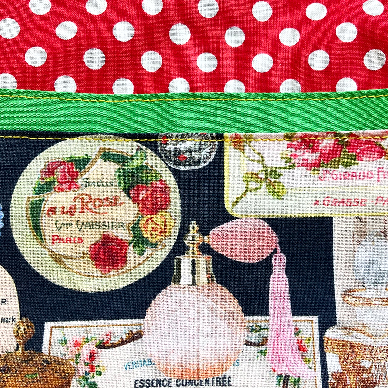 アンティークの香水瓶をコラージュ。黒地。ヴィンテージやデッドストックの香水ビンのコレクションと、ボトルに移し替える前のデッドストック香水ラベルをコラージュした珍しい布。古き可愛さが全部詰まっています。