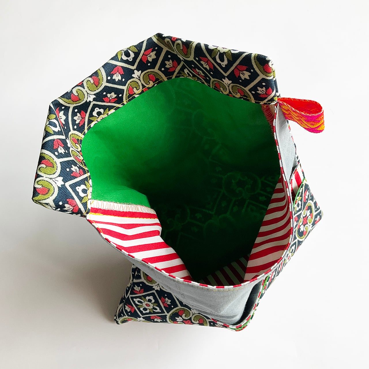 複雑でよくできた、かっこいい模様なので、和風だけどいつか使いたいと思って温めていました。和風に渋くならないようにできないものかと思い続けてきましたがやっとピンと来て縫製に至りました。思い入れいっぱいの一点になりました。