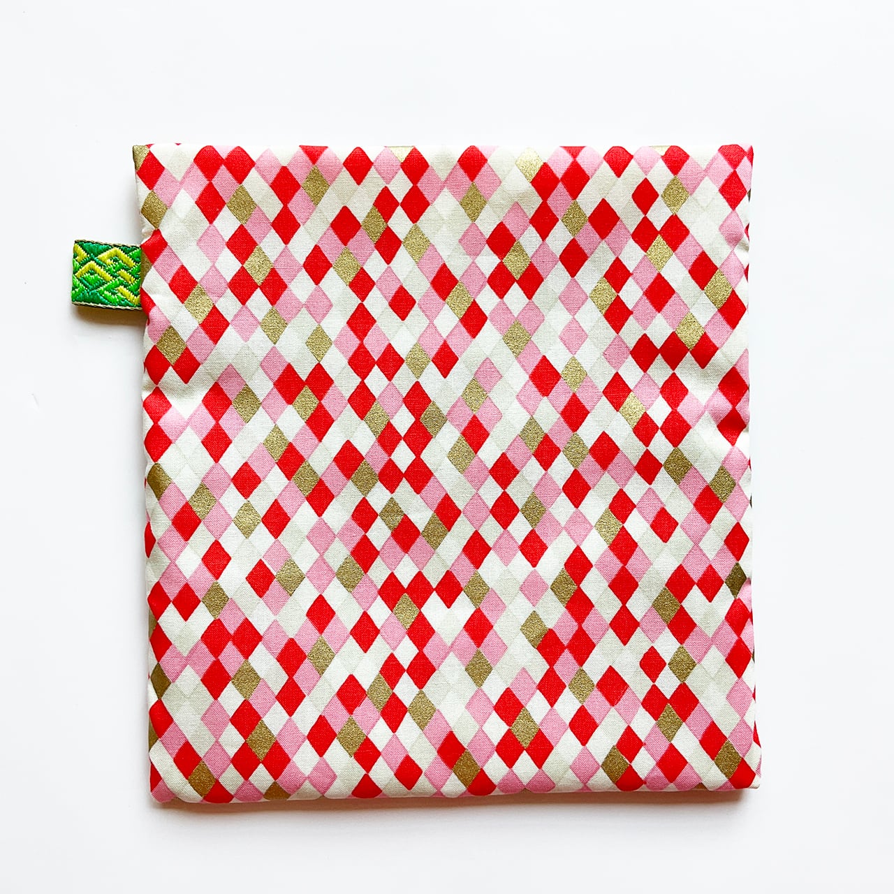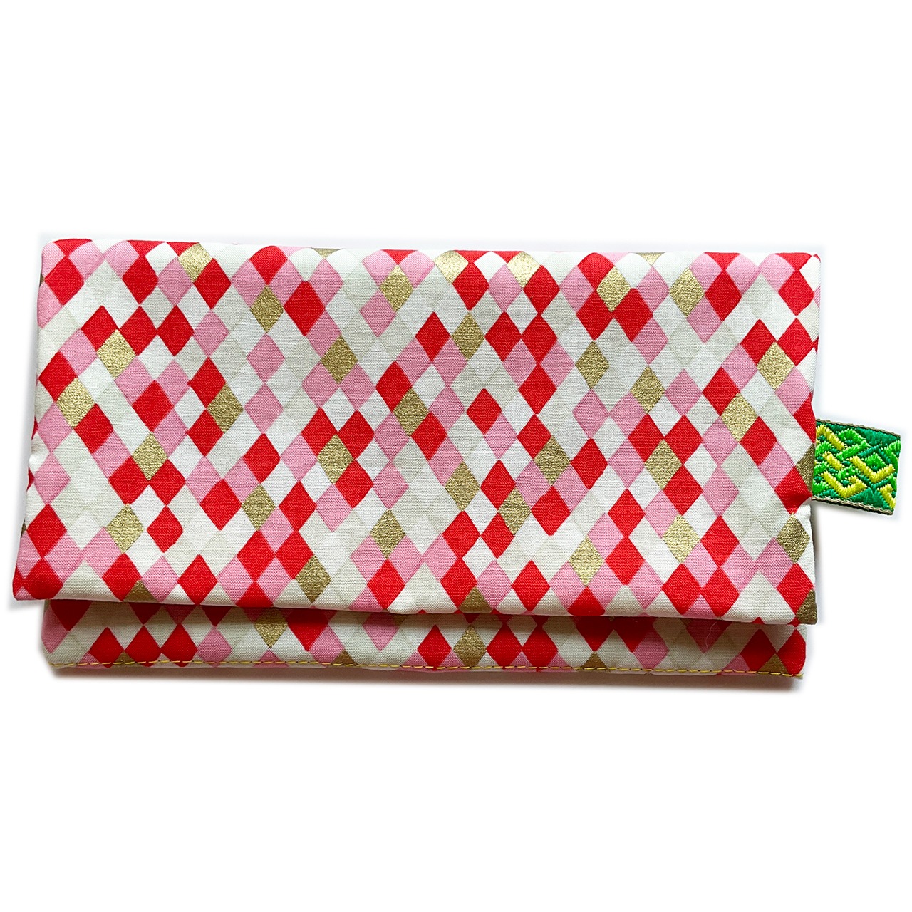 小さな菱形が集まったかわいい柄。千代紙みたいな模様ですが、アメリカンファブリックです。整った小さな小紋なので、開けたら、全く違う世界が広がるように布合わせ。