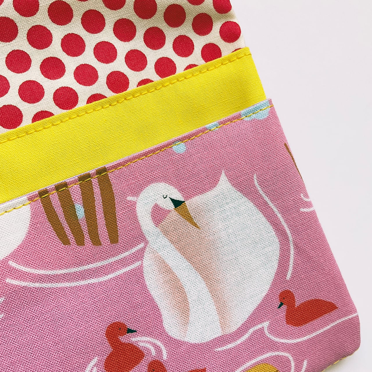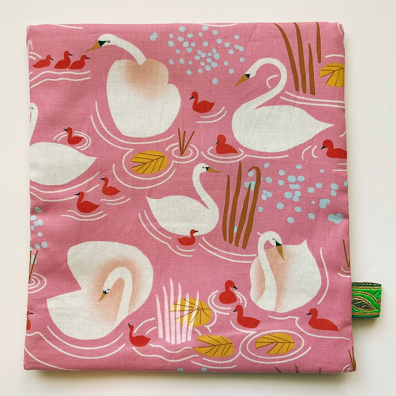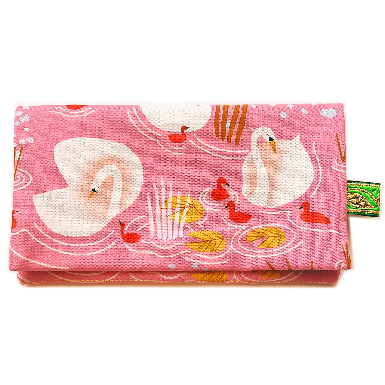 白鳥の親子 桃色です。目を閉じた白鳥の首周りのシャドーの可愛さと、赤いヒナがポイントのアシンメトリーデザイン。写真に映らない微妙なピンクが、手に取るとより一層愛らしいヌノザイフです。