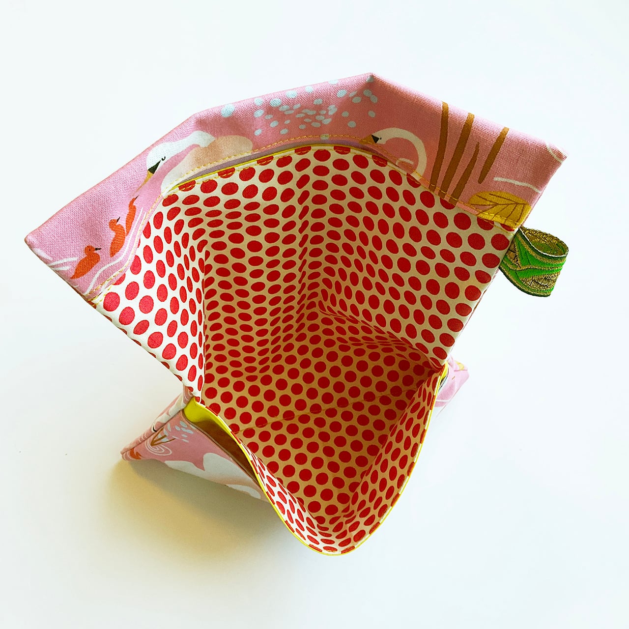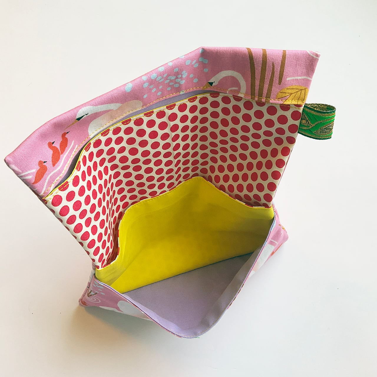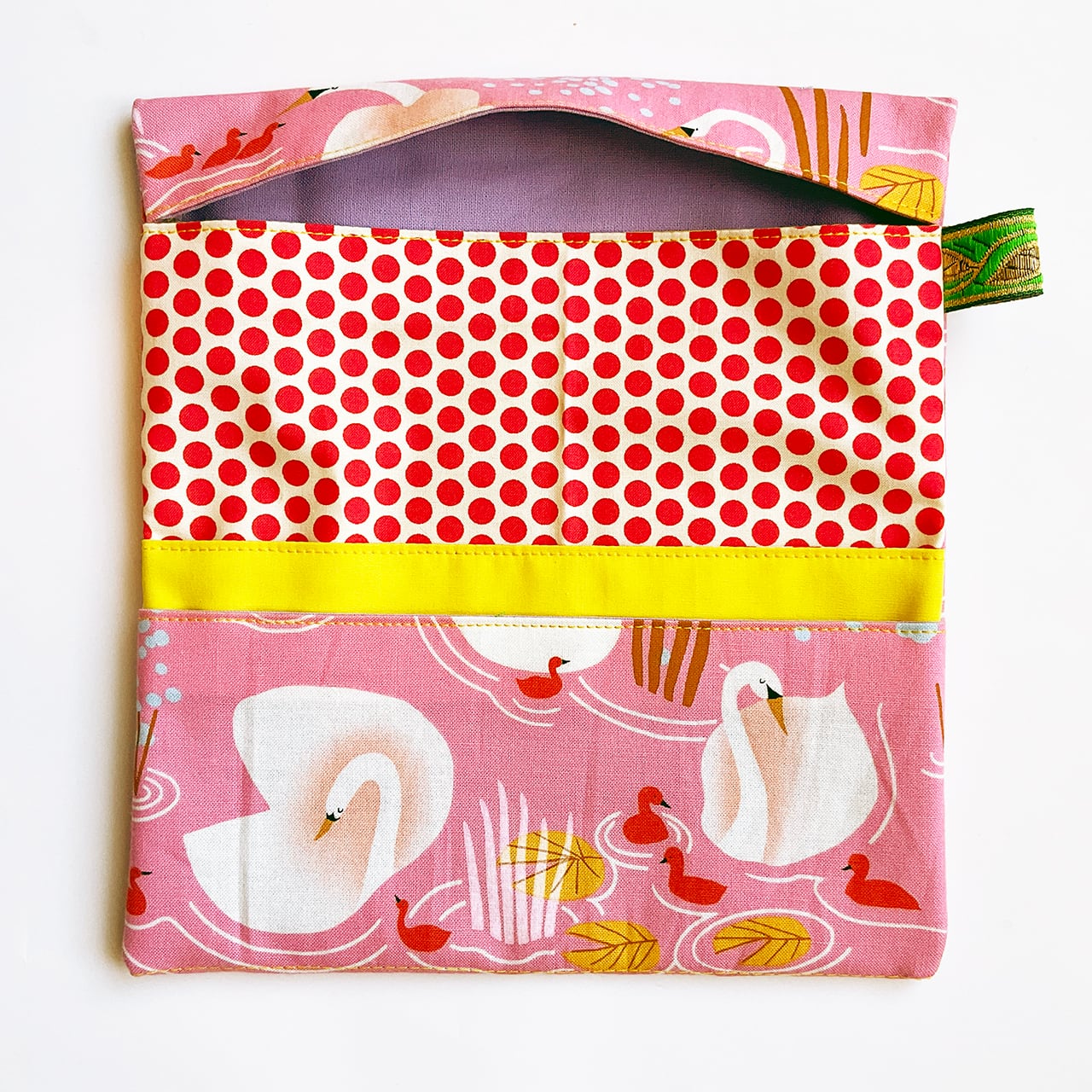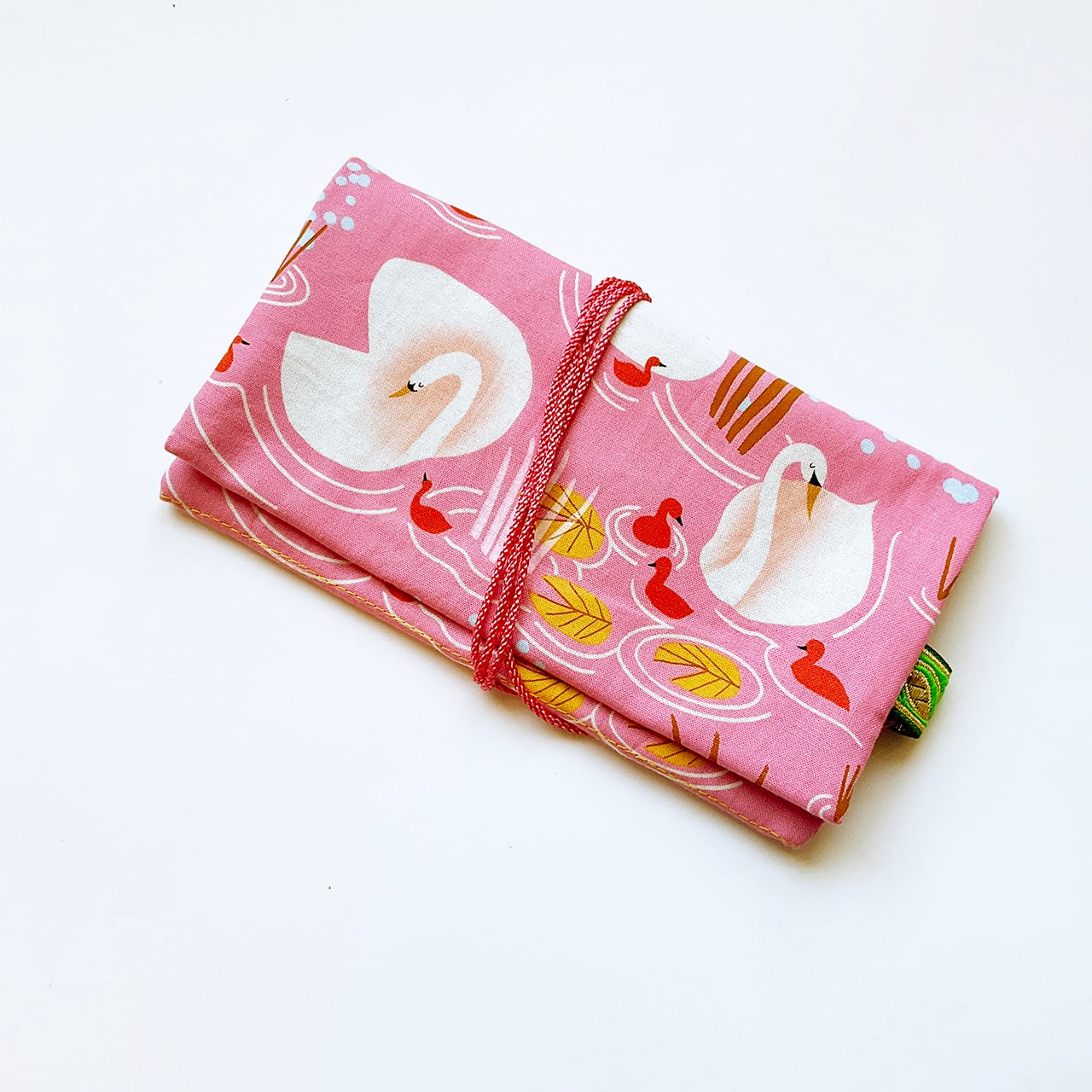 白鳥の親子 桃色です。目を閉じた白鳥の首周りのシャドーの可愛さと、赤いヒナがポイントのアシンメトリーデザイン。写真に映らない微妙なピンクが、手に取るとより一層愛らしいヌノザイフです。
