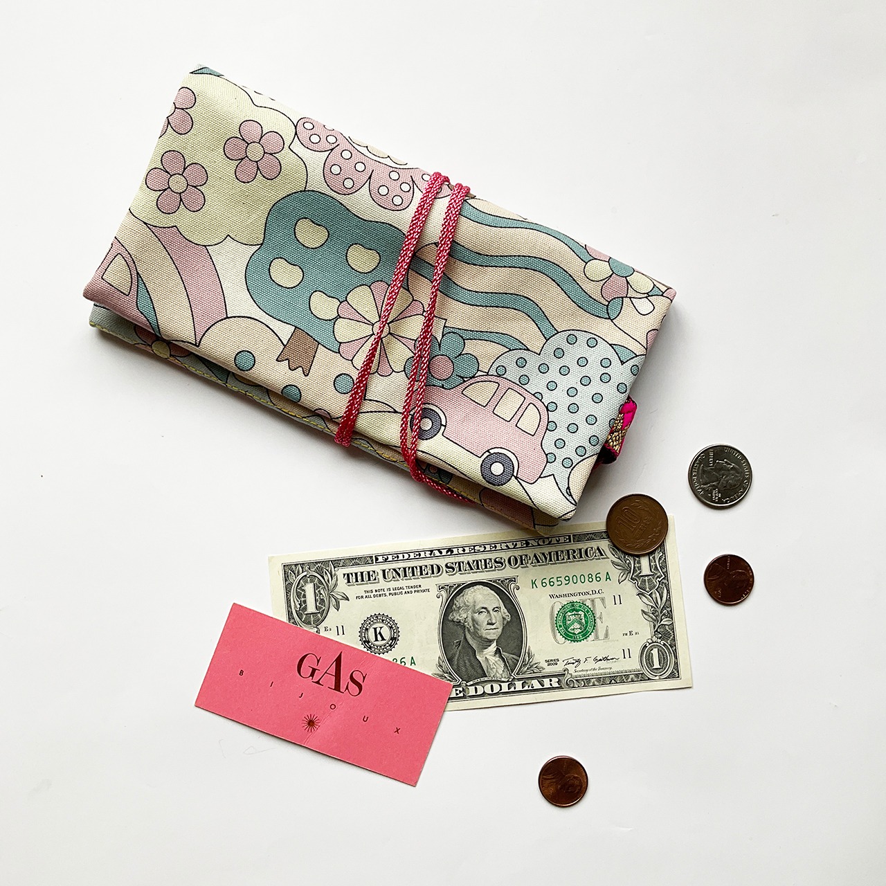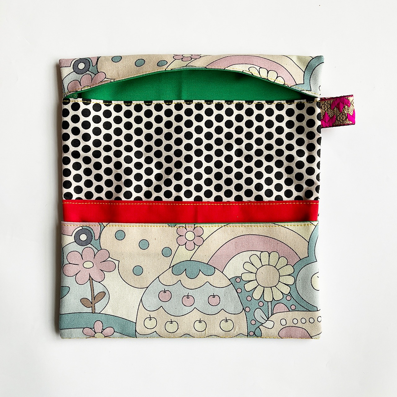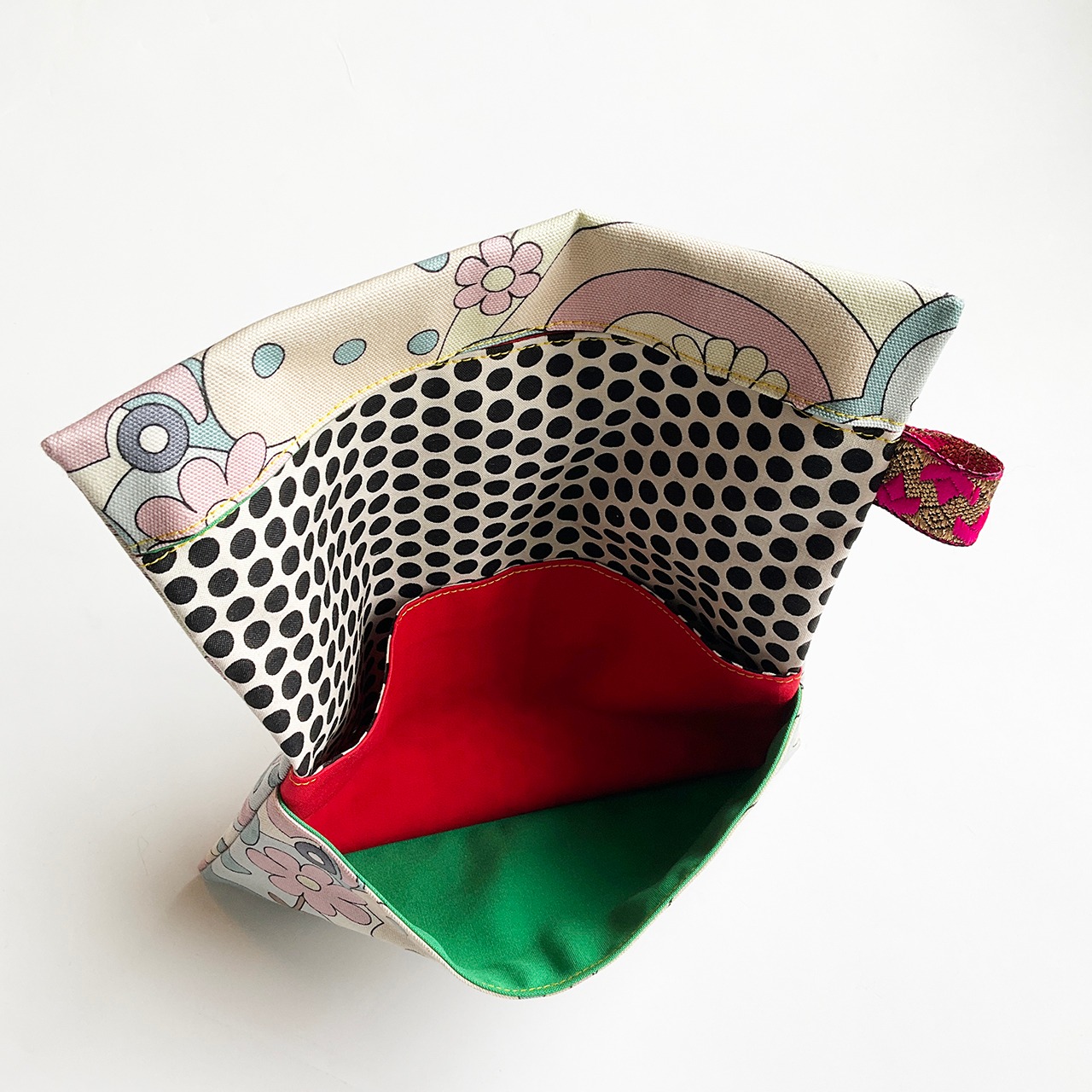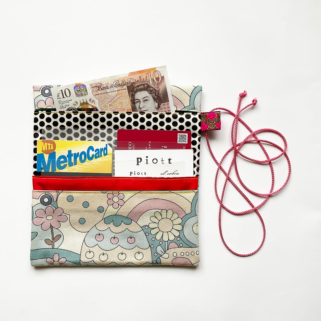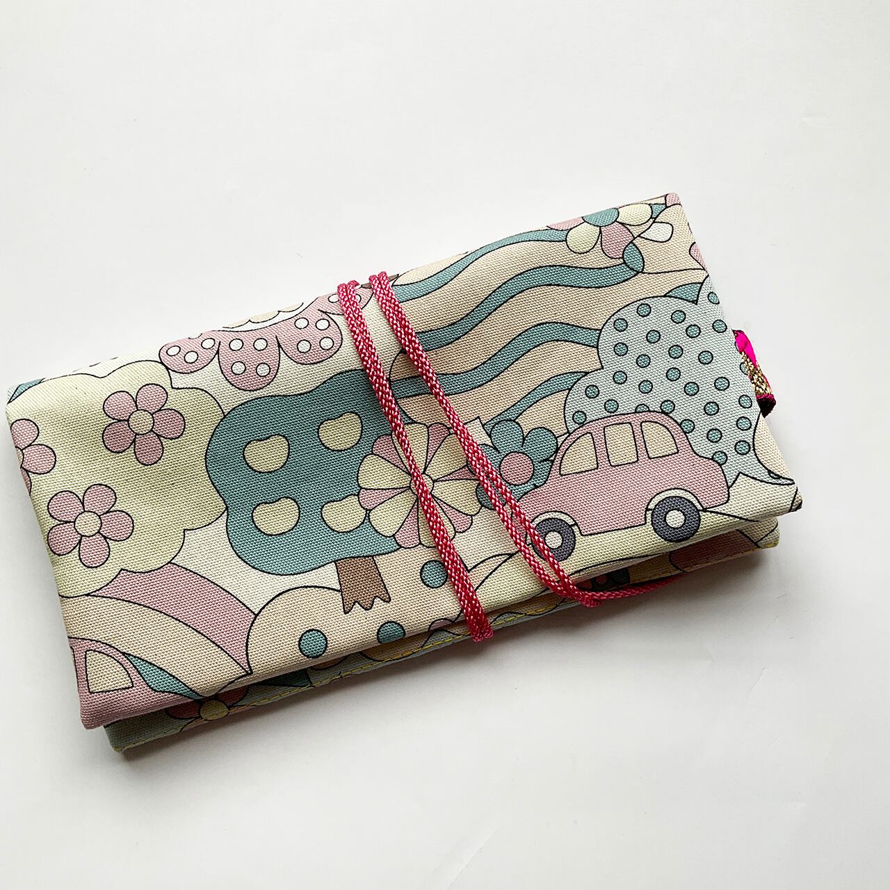 形は江戸の道中財布。欧米のデザインファブリックでポップに明るく作っています。