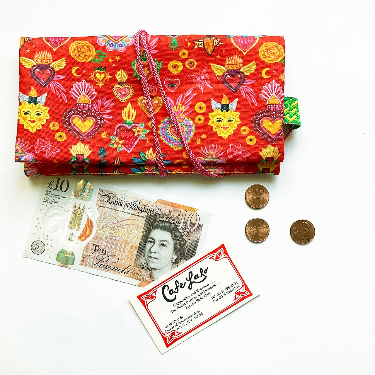 小さなコラソンが散りばめられた賑やかで縁起のいいヌノザイフ。赤黒の二色展開です。