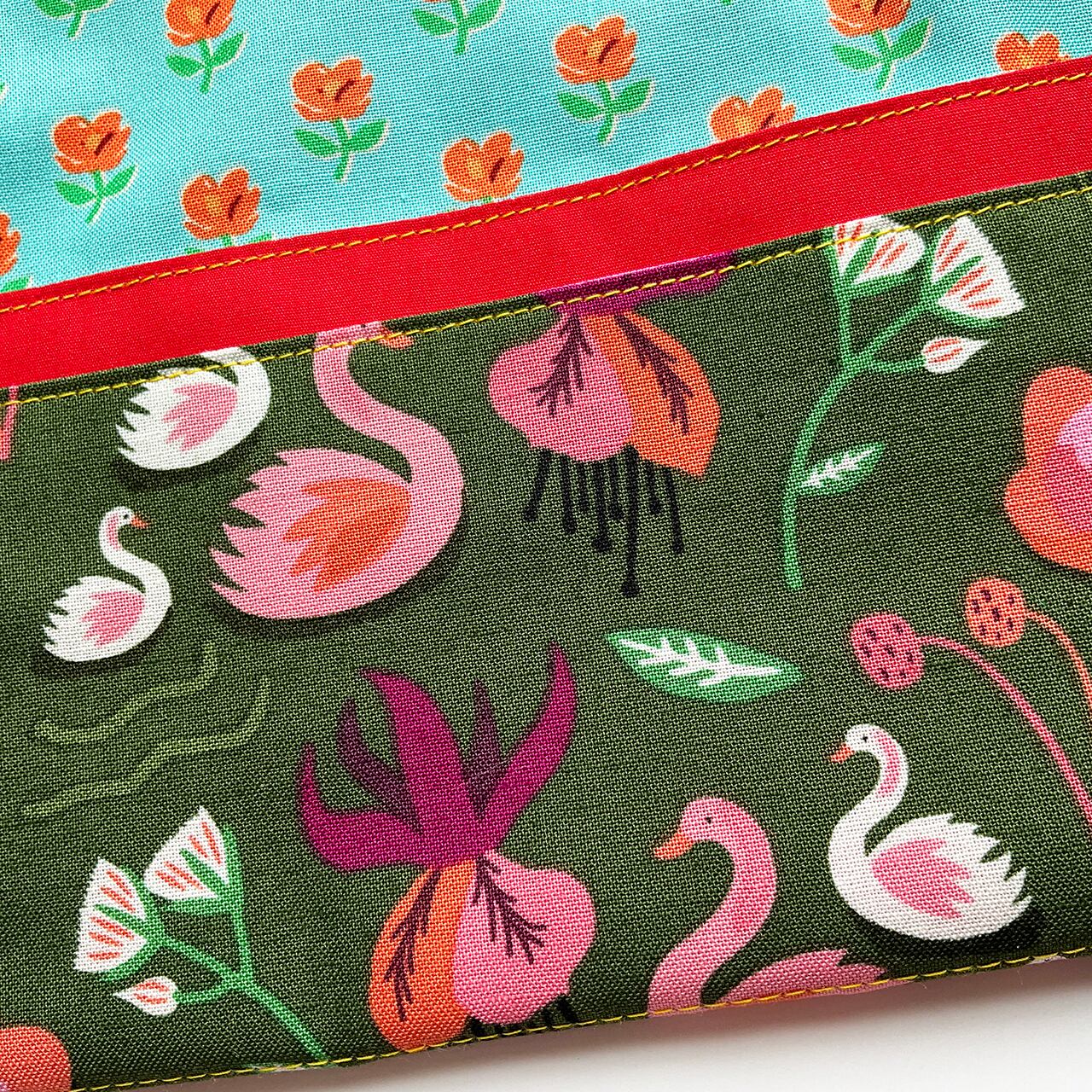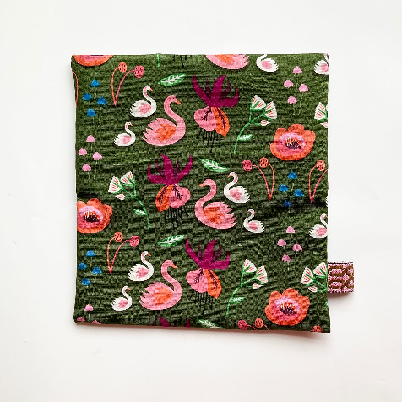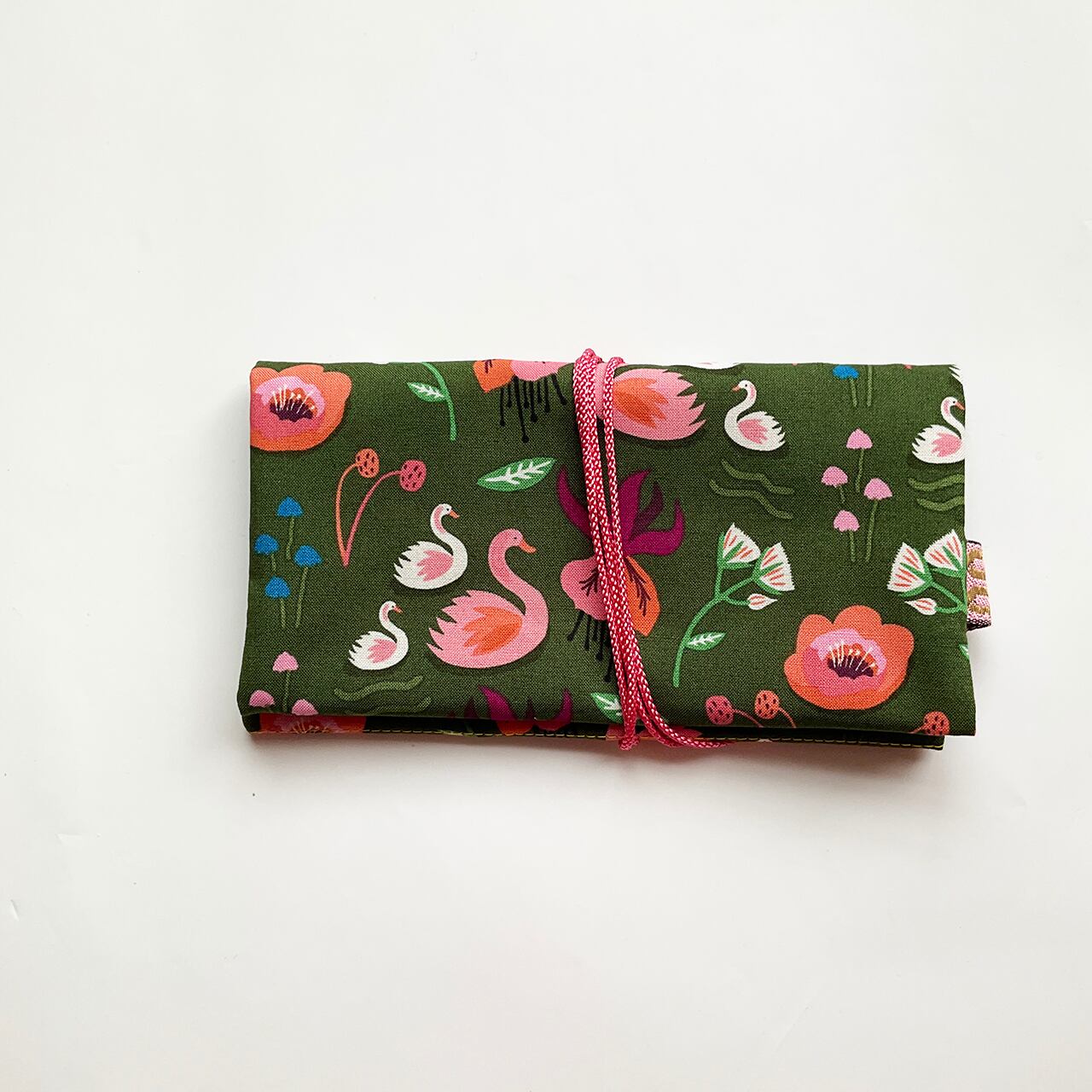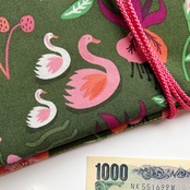 お初です。小さな白鳥の親子。深緑が美しく、細かく可愛らしい図柄を締めてくれています。可愛いのに甘すぎない深緑というのが、奥行きのある洒落た布に思えました。中布もお初の花柄です。