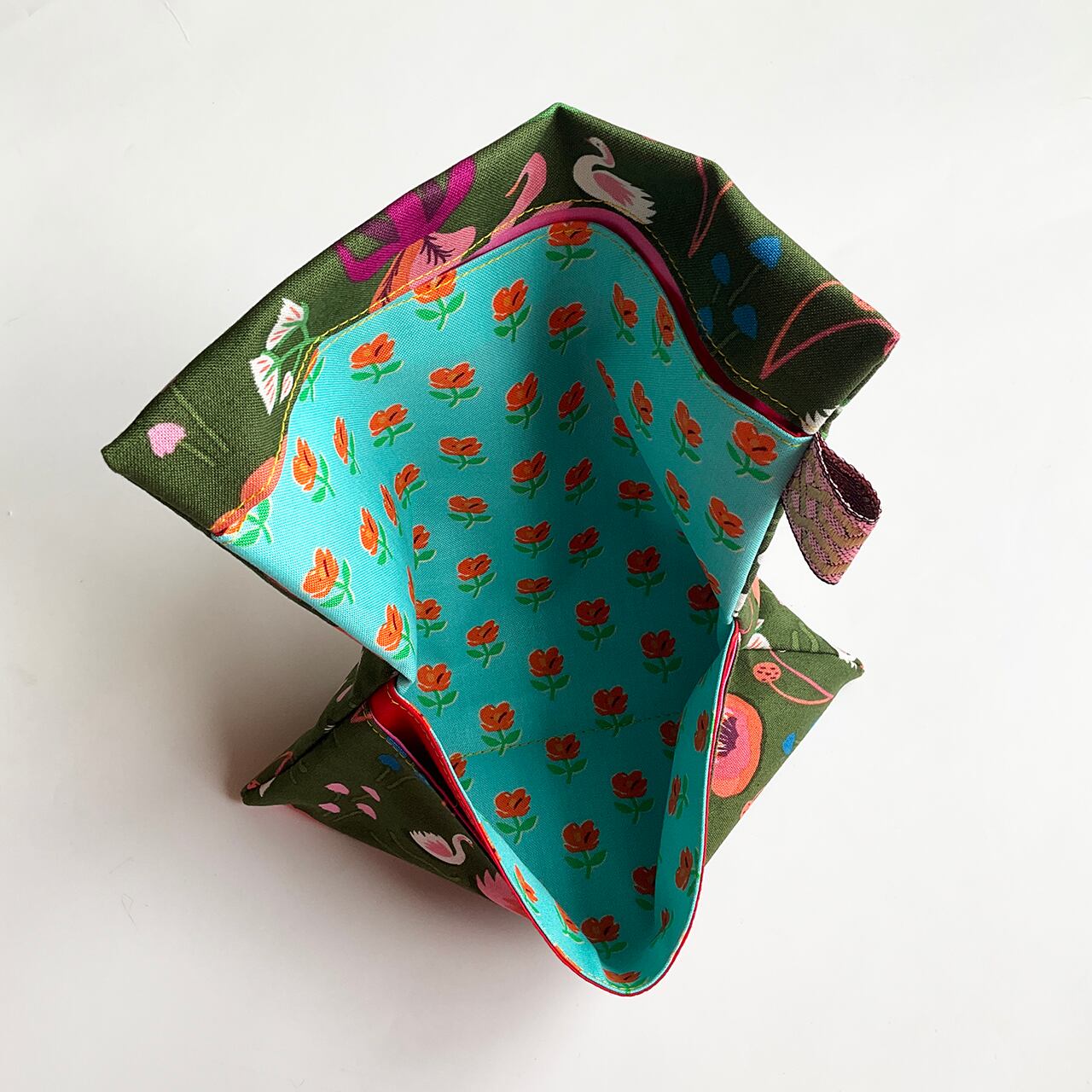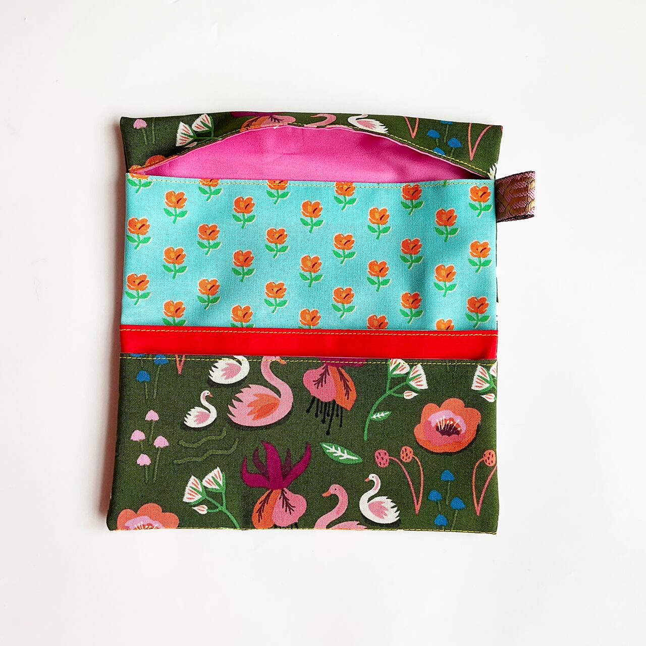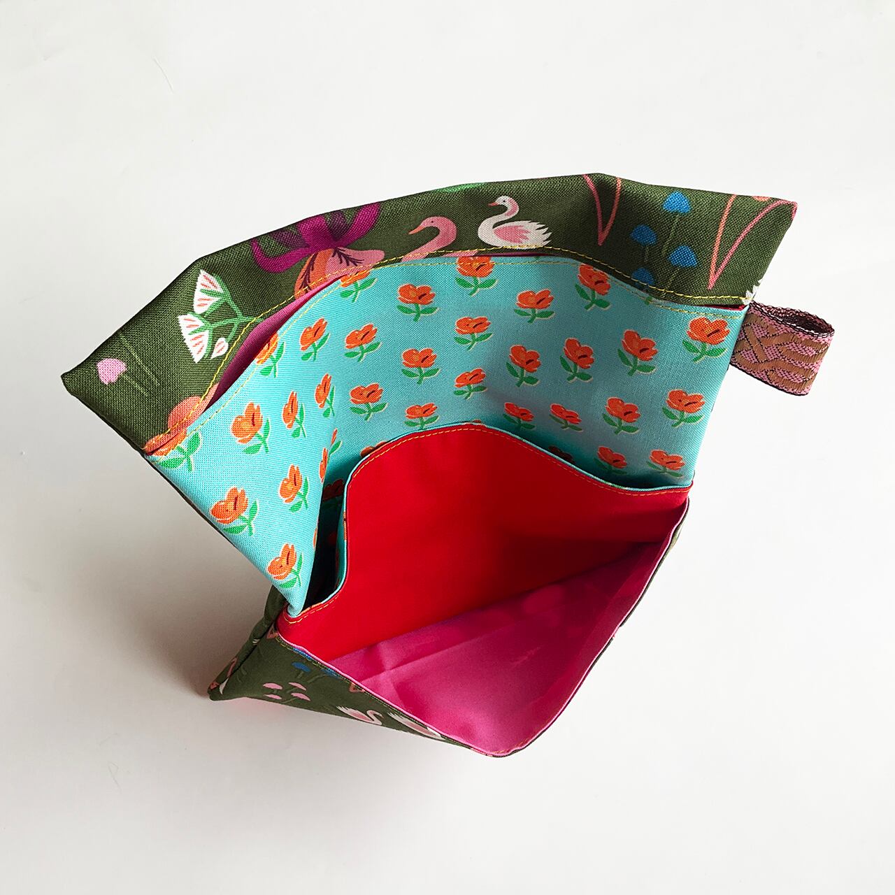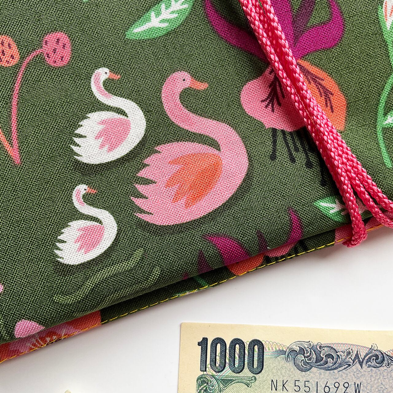 お初です。小さな白鳥の親子。深緑が美しく、細かく可愛らしい図柄を締めてくれています。可愛いのに甘すぎない深緑というのが、奥行きのある洒落た布に思えました。中布もお初の花柄です。