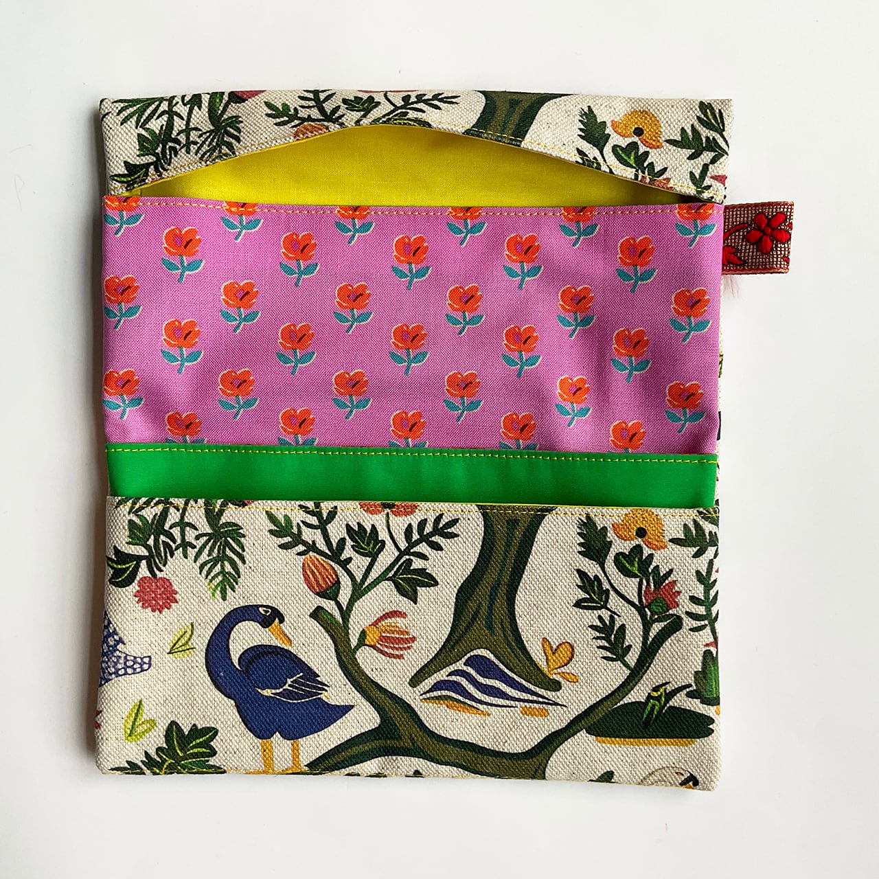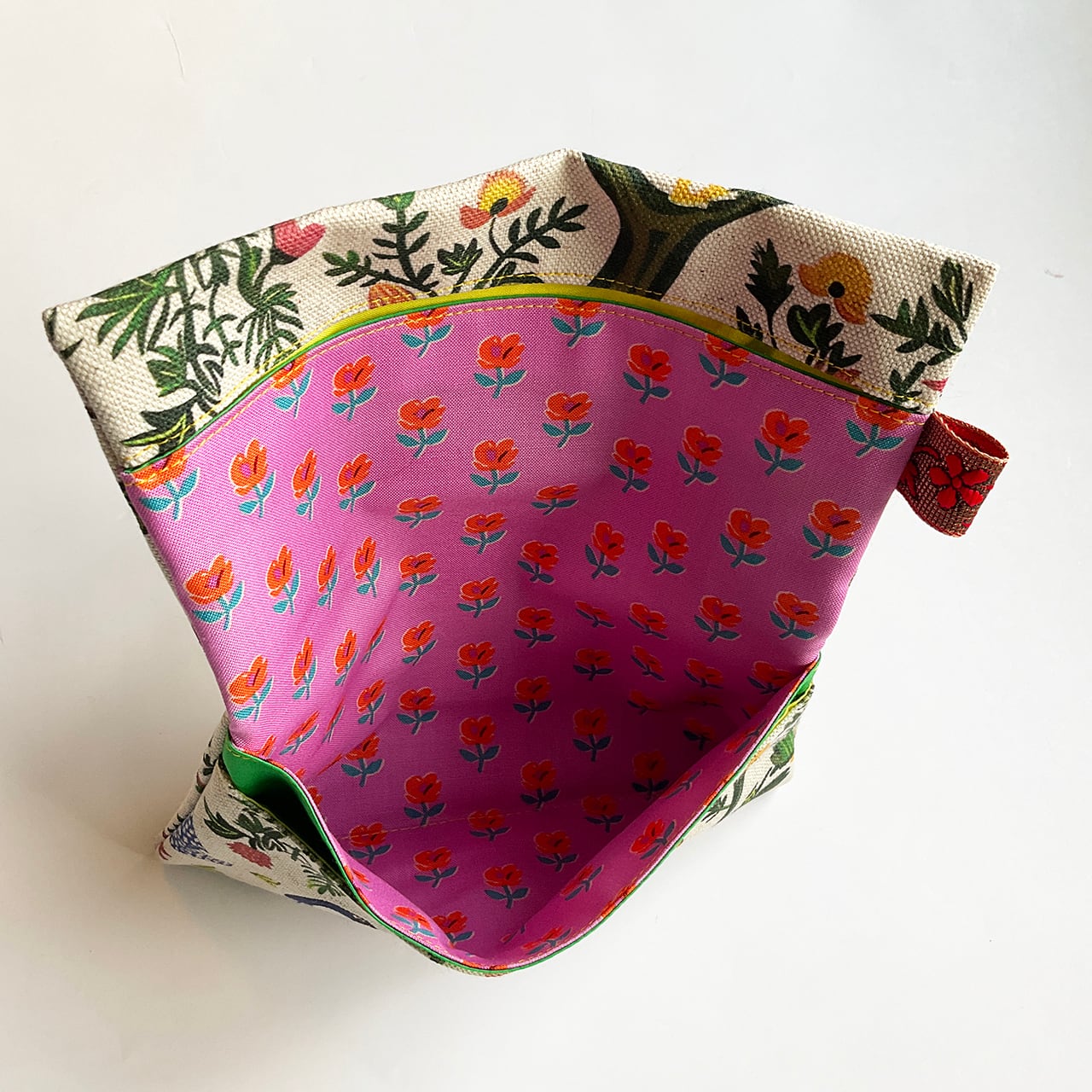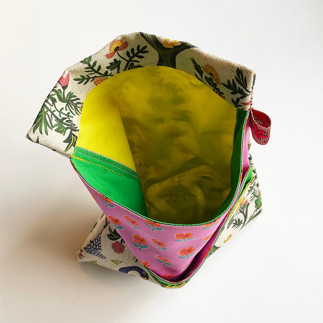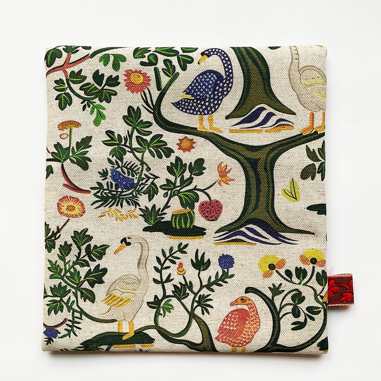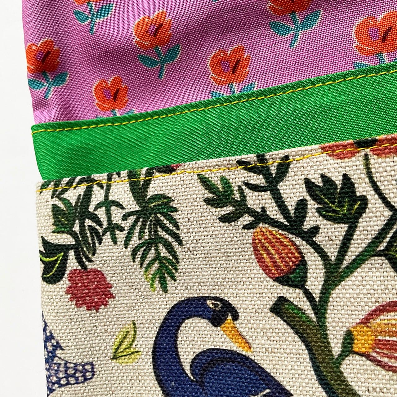 ガチョウ白鳥黒鳥七面鳥、庭にあそぶ柄。素朴なボタニカルは大昔のパピルスに描かれた絵のよう。アダムとイブがリンゴを食べていそうな風景です。しっかりしたオックス生地。中布は買ったばかりの初めての布。