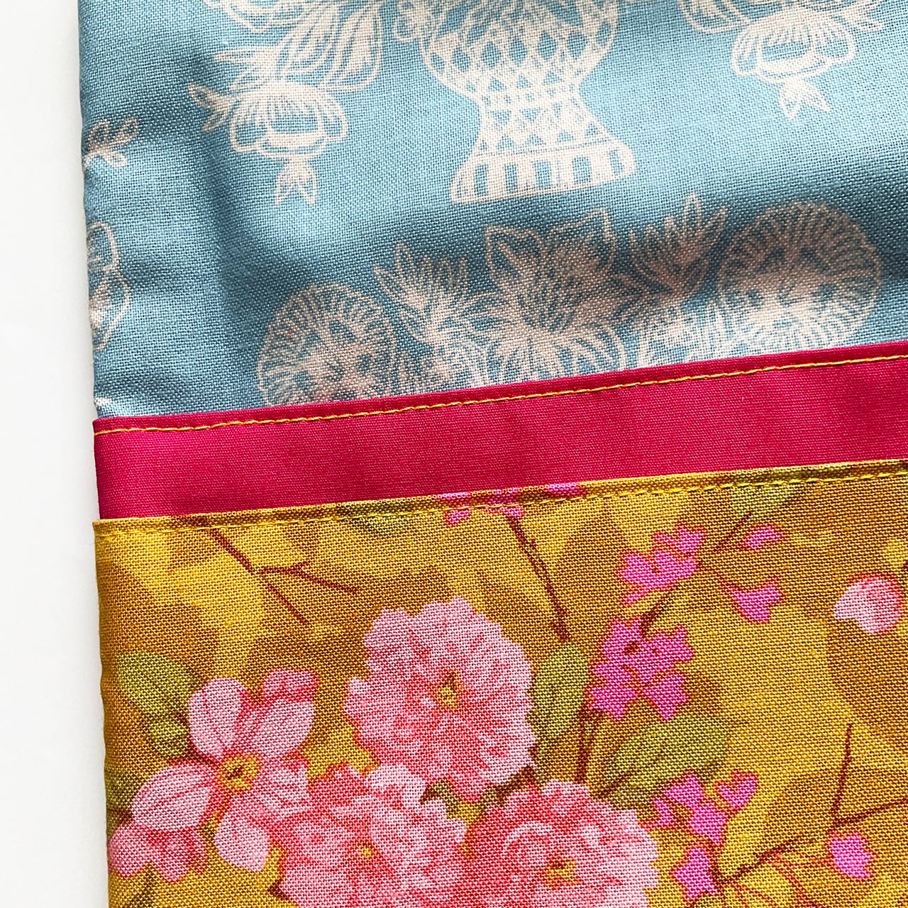 ほんのりフラッシュカラーも混ざっている花びらのピンクが、地色の辛子色をさらに高揚させてくれます。華やかなインテリアのような布。春の八重桜をこんなに匂い立つようにデザインしたデザイナーさんの色使い凄いです。