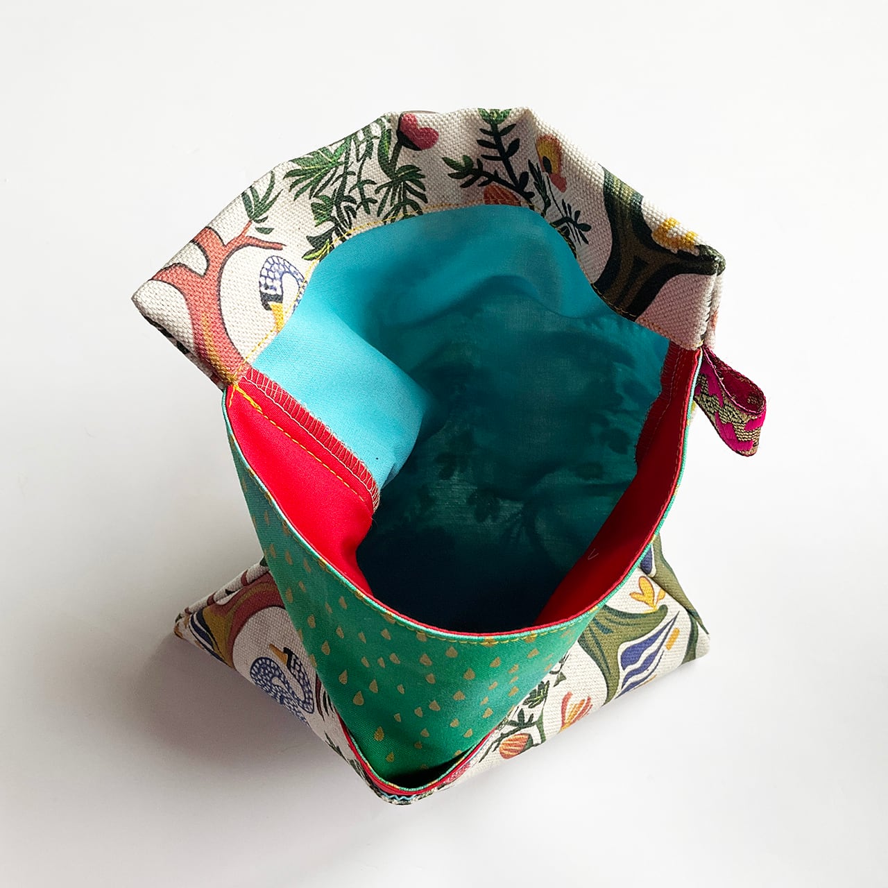 ガチョウ白鳥黒鳥七面鳥、庭にあそぶ柄。素朴なボタニカルは大昔のパピルスに描かれた絵のよう。アダムとイブがリンゴを食べていそうな風景です。しっかりしたオックス生地。中布は買ったばかりの初めての布。