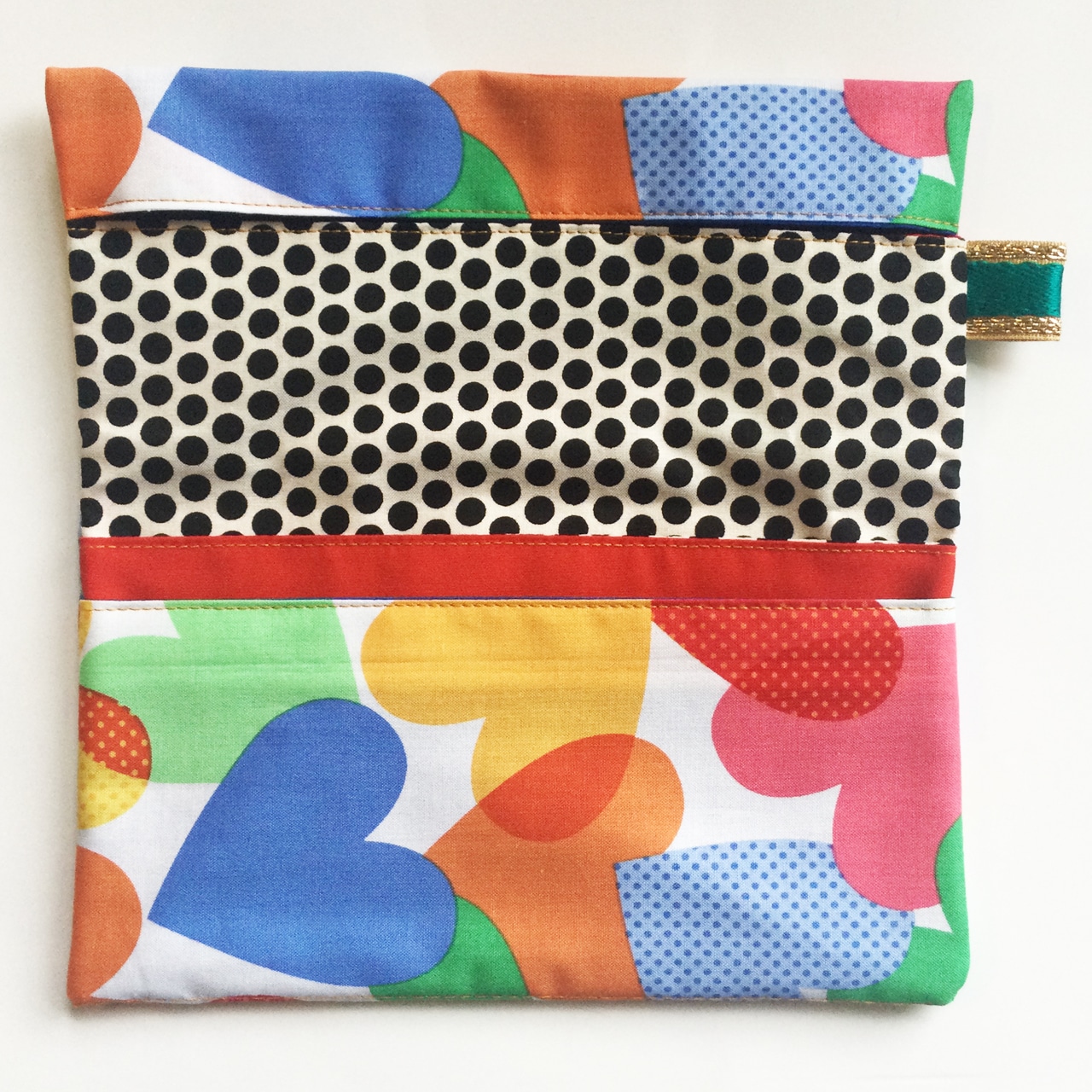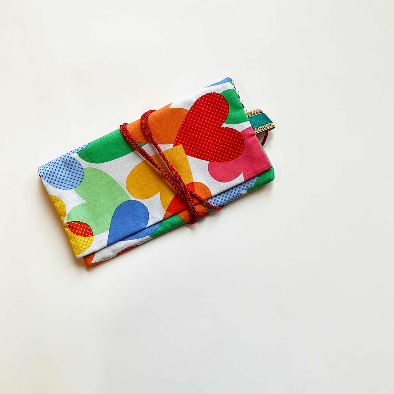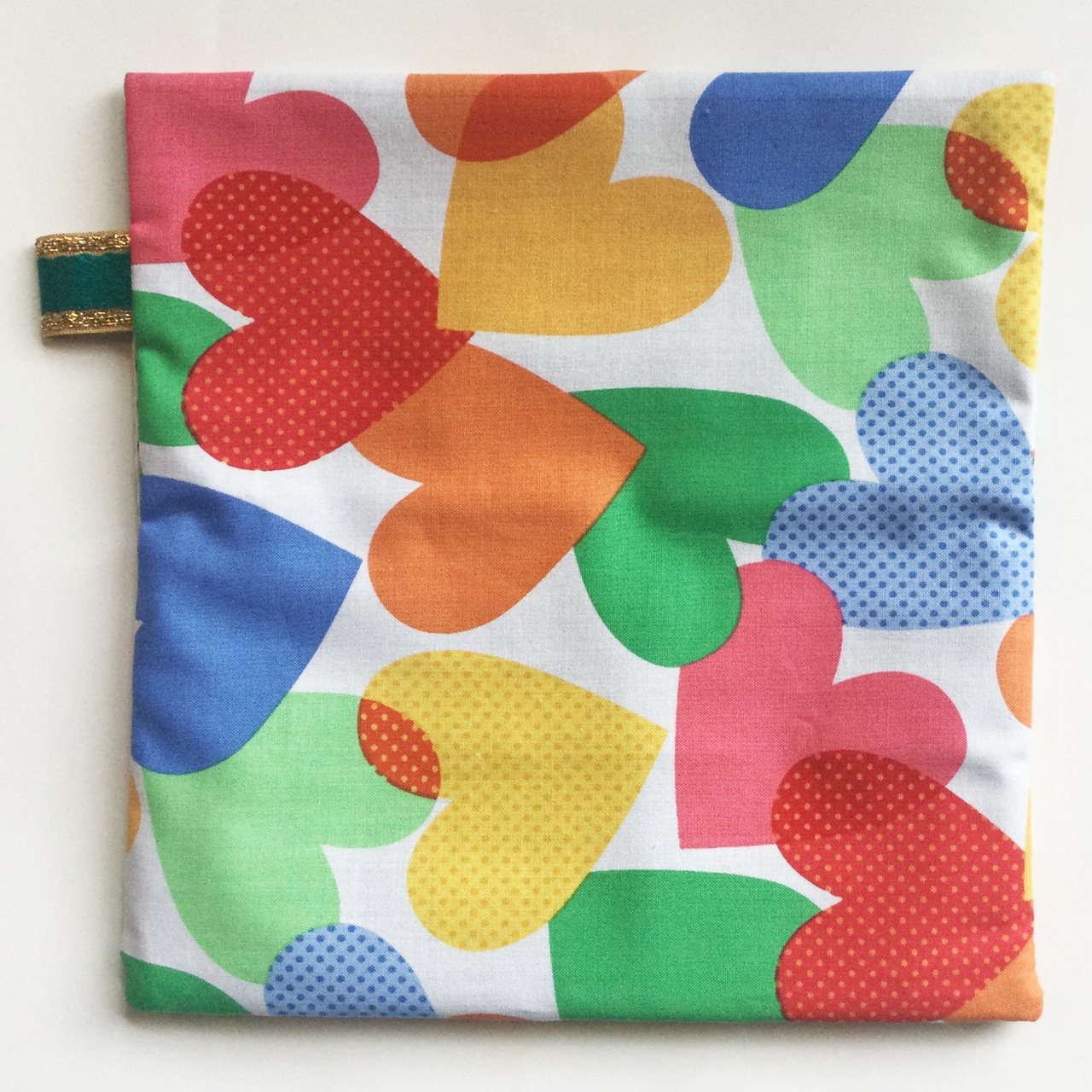 ハッピーなハート柄。有名デザインファブリックのものですが、ゆるさがかわいい。色味や印刷が上品で優しい布です。