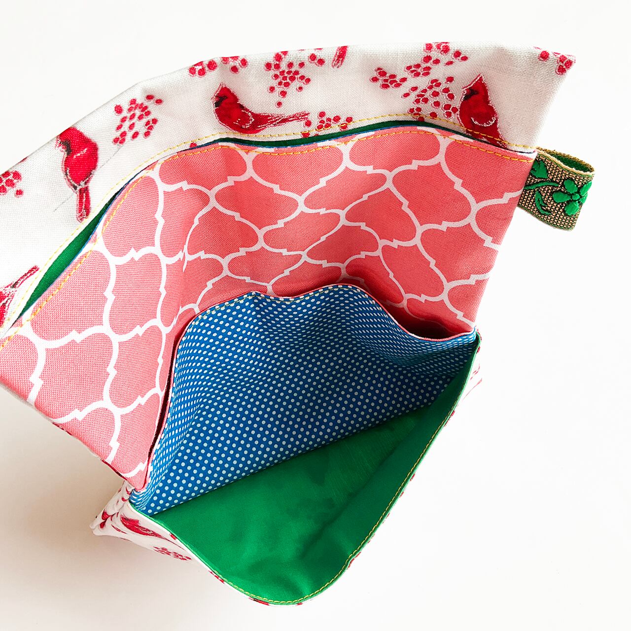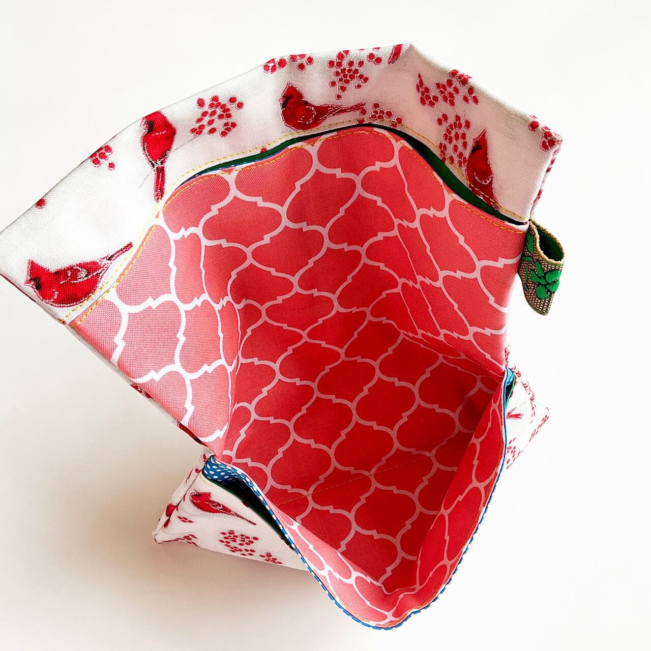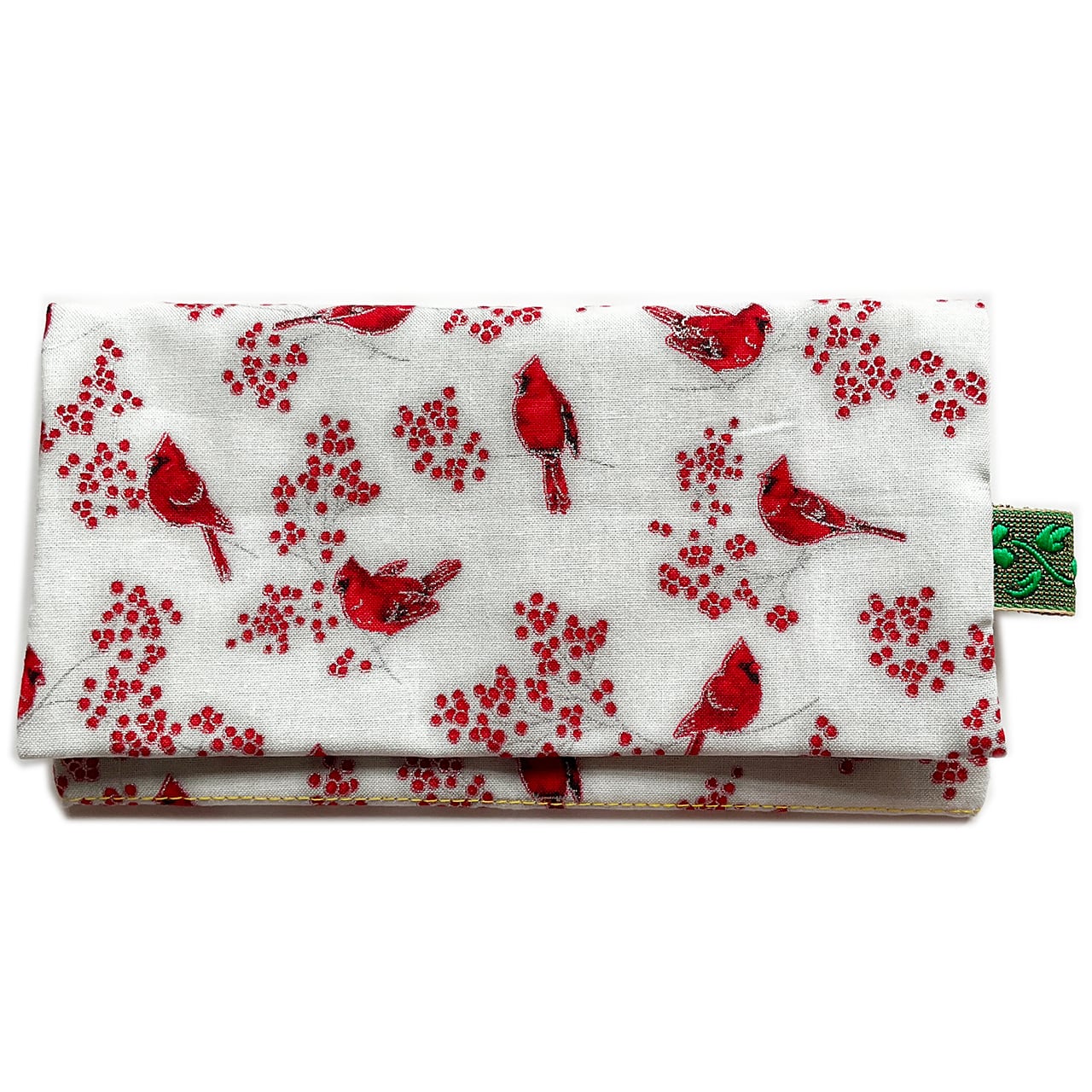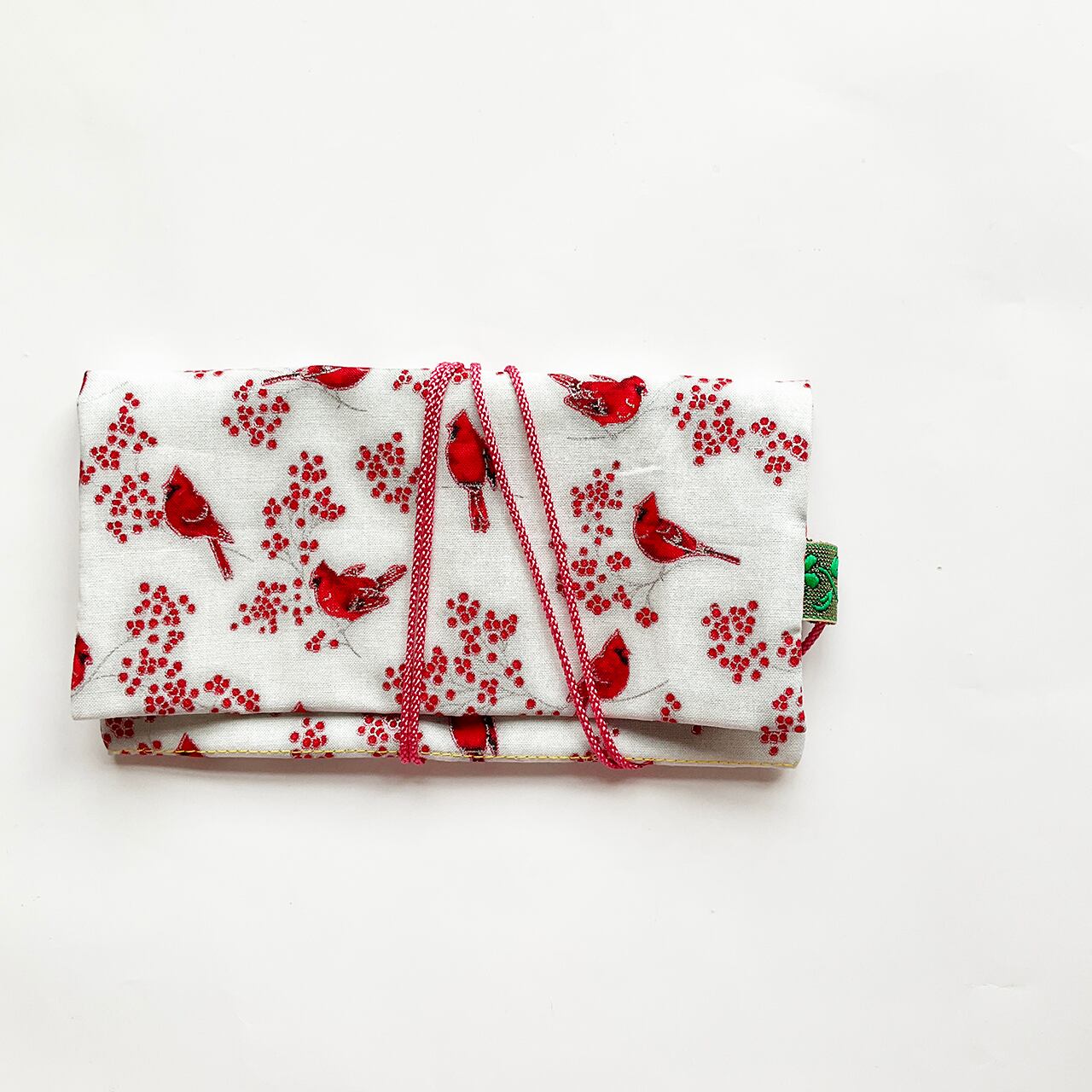 赤い鳥と赤い実。カーディナルです。降り積もる雪のようなヌノザイフになりました。クリスマスの布のようですがもちろん一年中使って欲しい。中布のサーモンピンクに青いラインが効いています。開けた時に見える色合わせ、目に爽やかです。