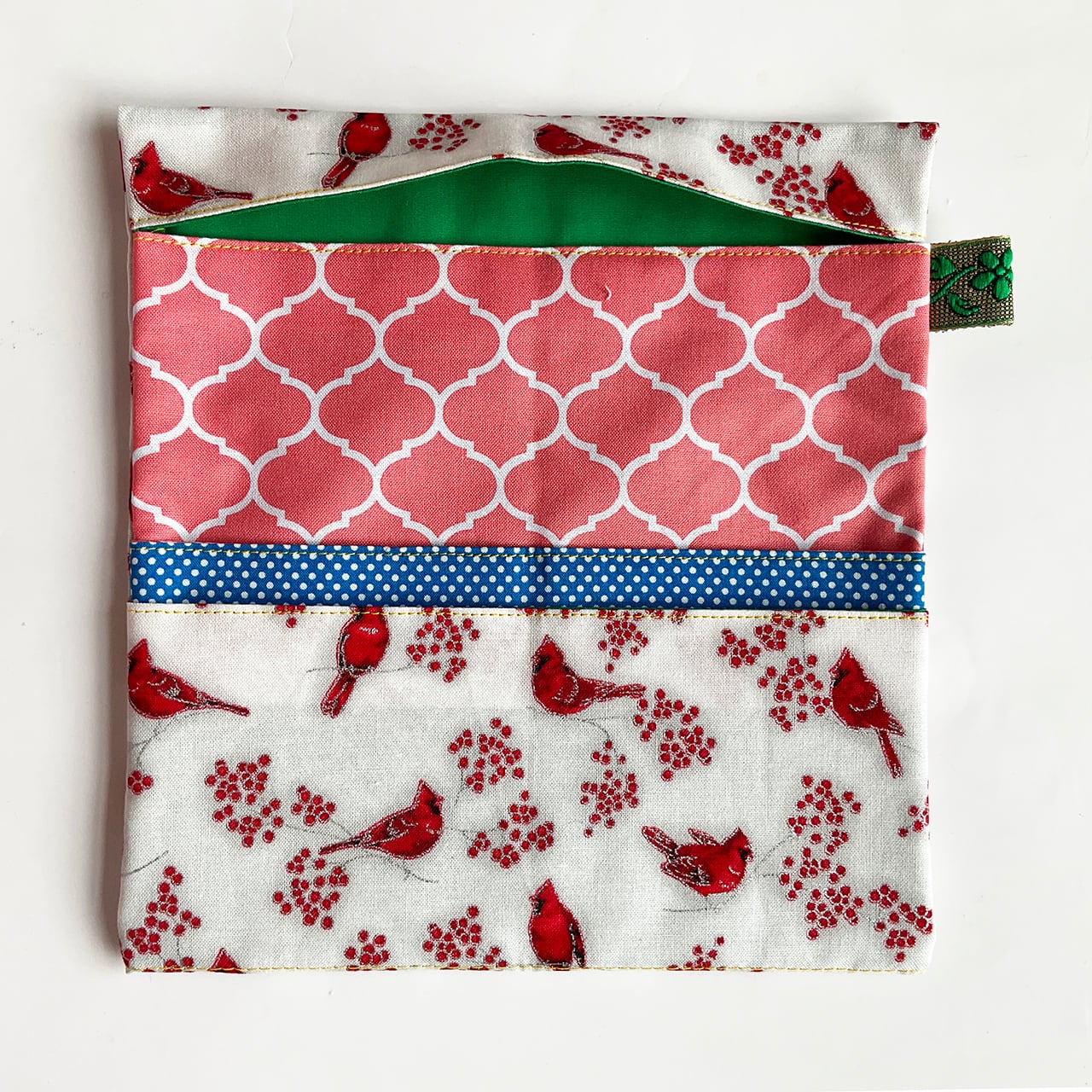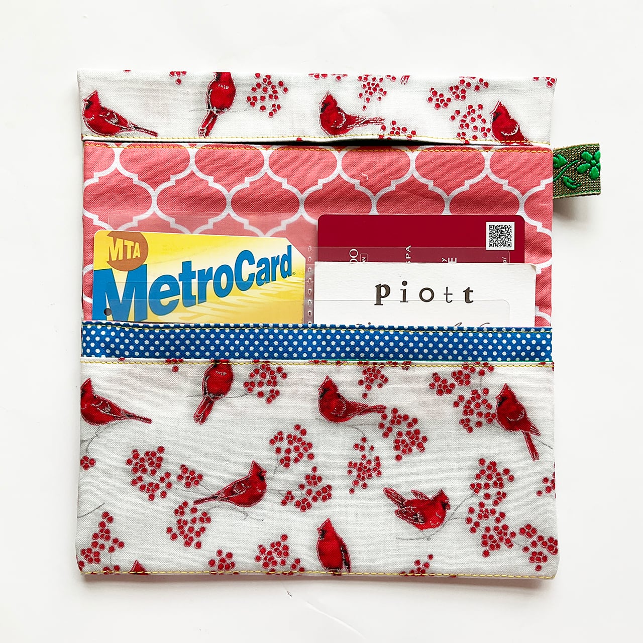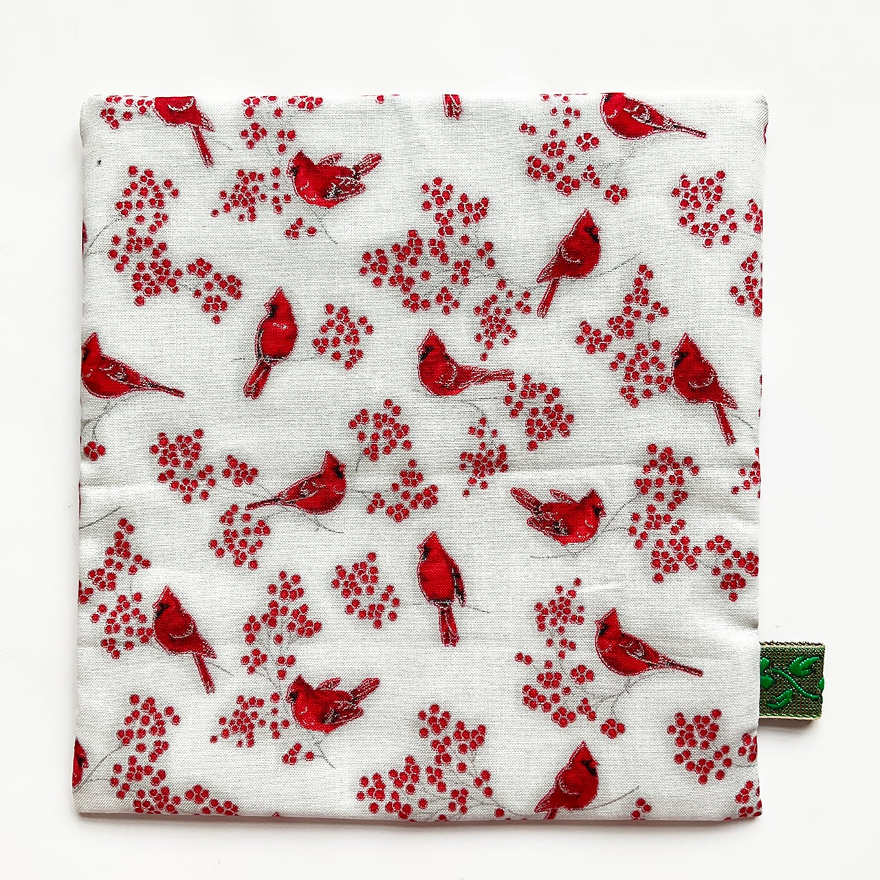 赤い鳥と赤い実。カーディナルです。降り積もる雪のようなヌノザイフになりました。クリスマスの布のようですがもちろん一年中使って欲しい。中布のサーモンピンクに青いラインが効いています。開けた時に見える色合わせ、目に爽やかです。