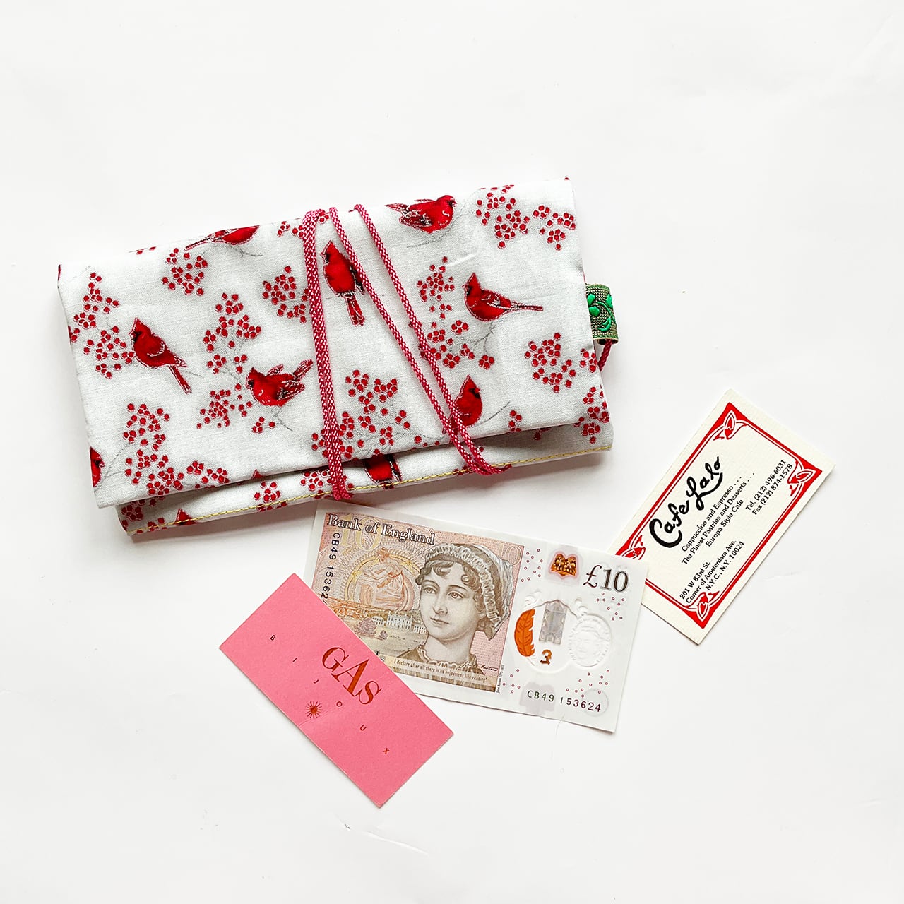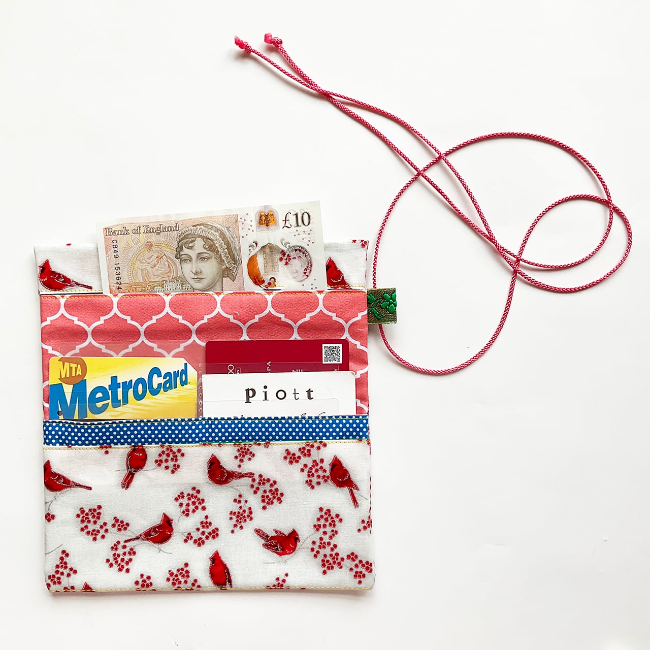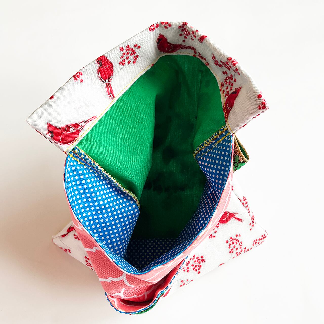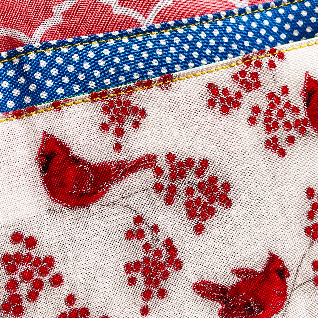 赤い鳥と赤い実。カーディナルです。降り積もる雪のようなヌノザイフになりました。クリスマスの布のようですがもちろん一年中使って欲しい。中布のサーモンピンクに青いラインが効いています。開けた時に見える色合わせ、目に爽やかです。