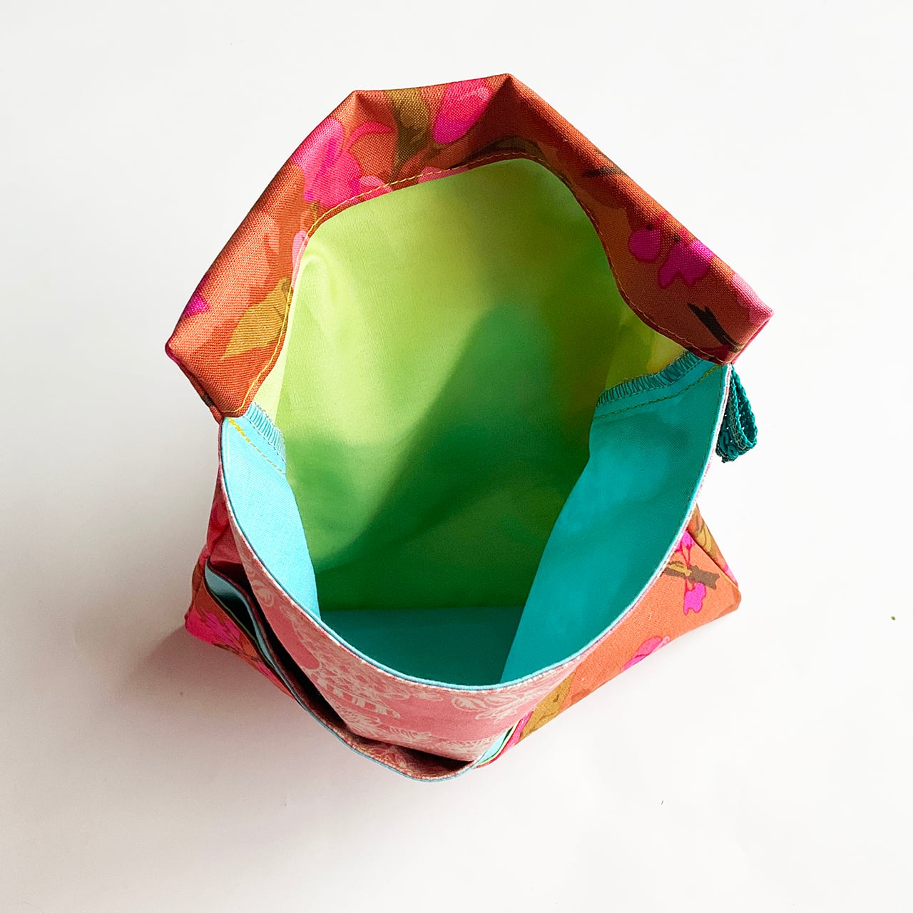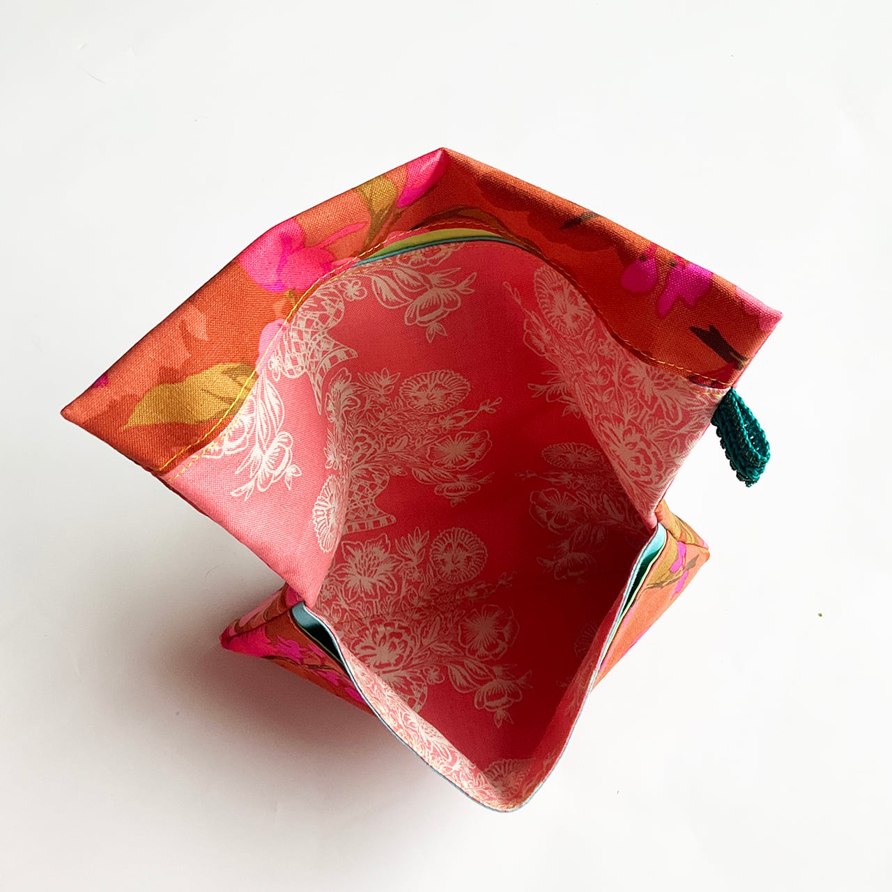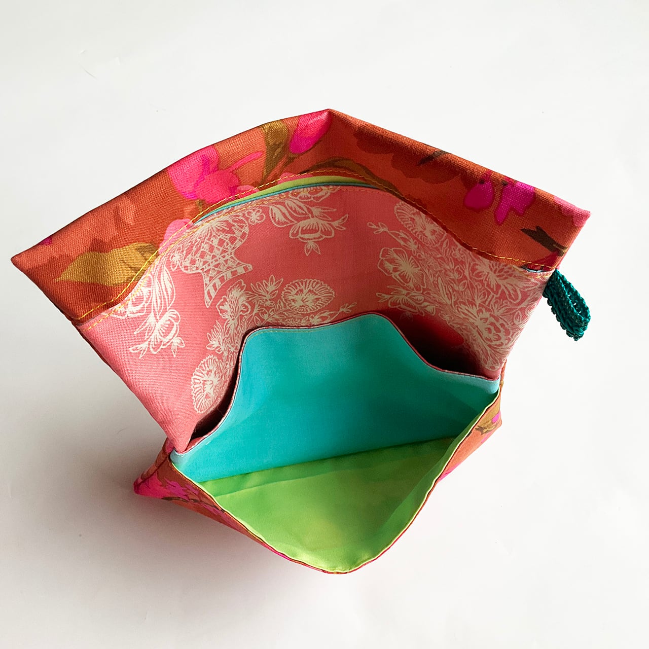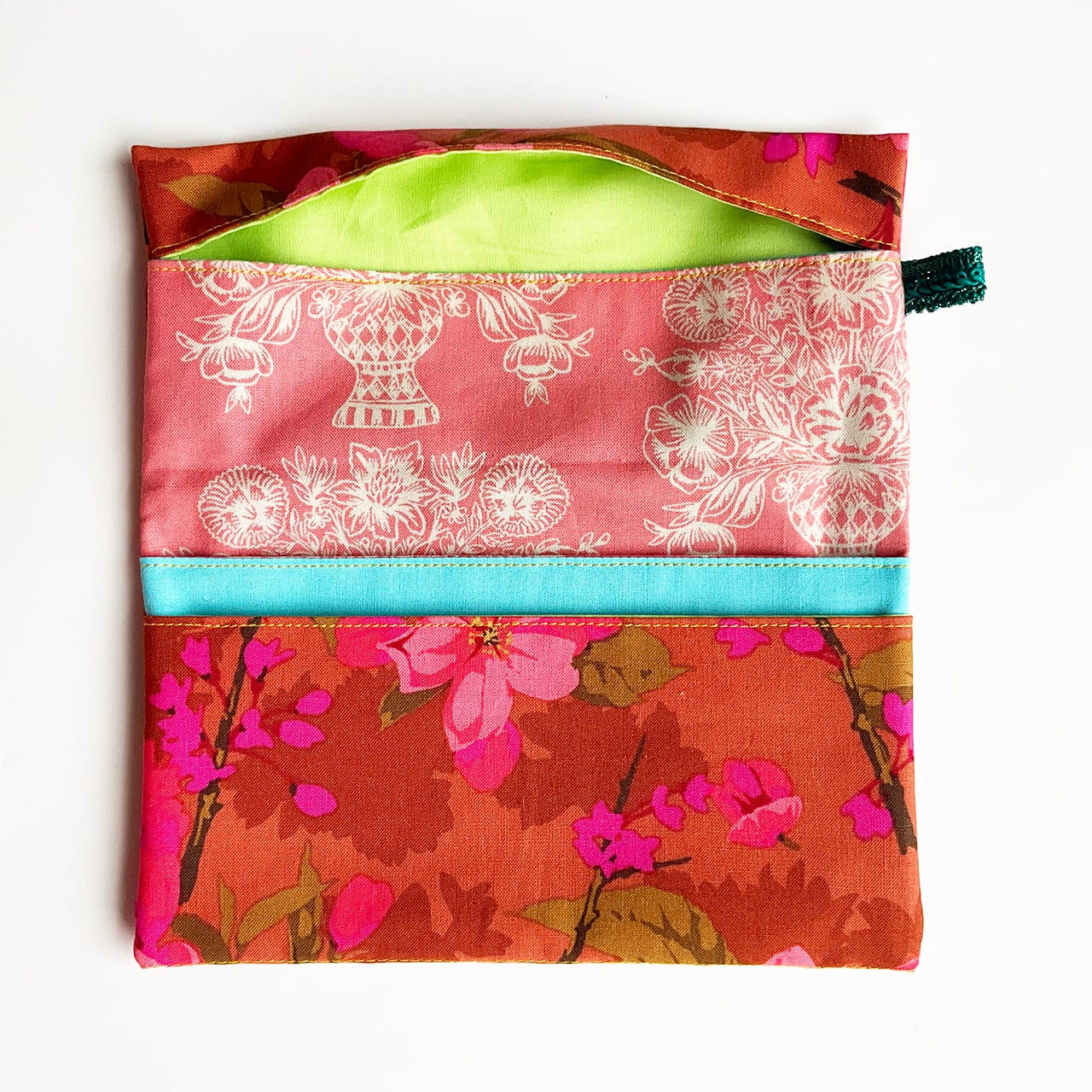 形は江戸の道中財布。欧米のデザインファブリックでポップに明るく作っています。