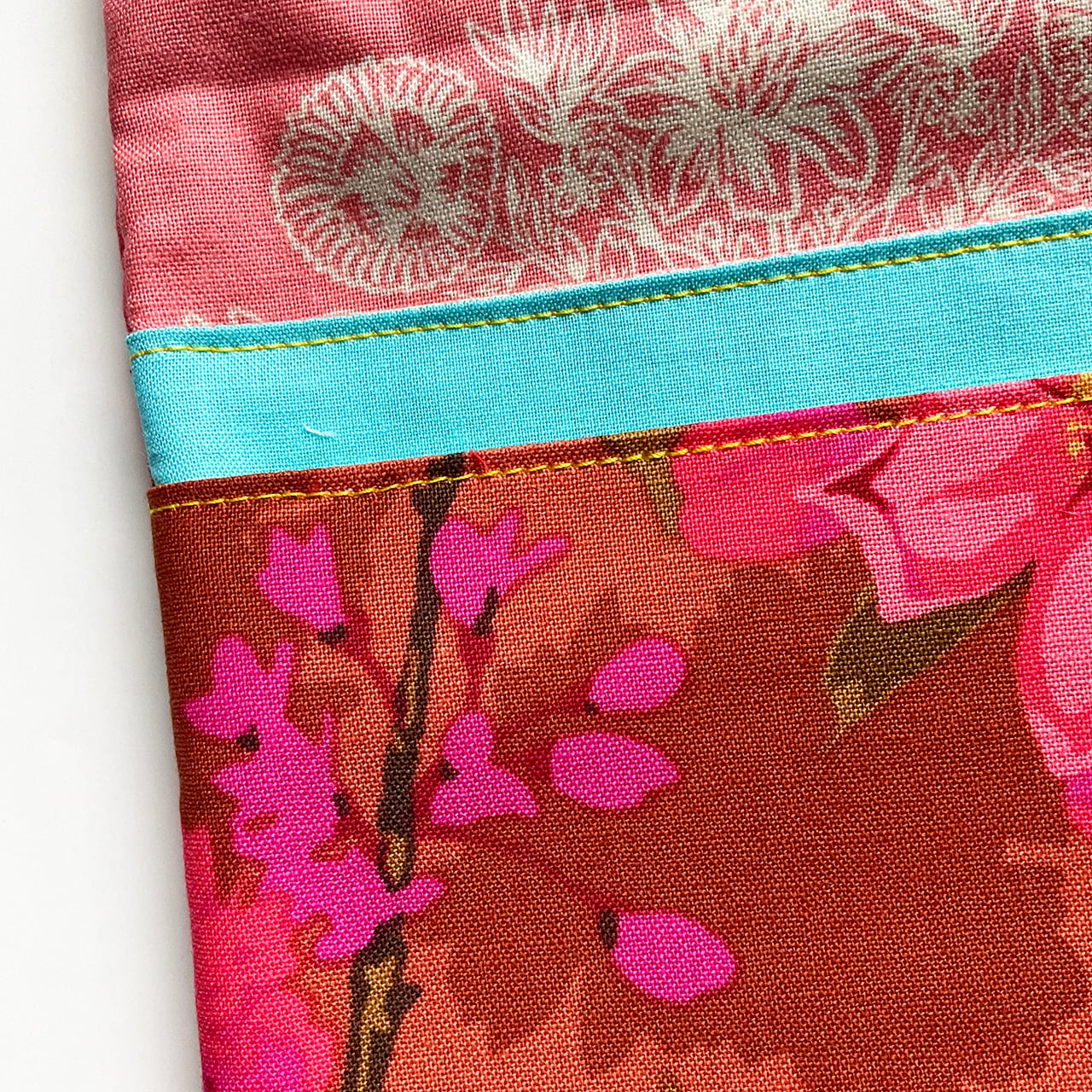 ピンクの桜と八重桜が、茶系の地色に不思議な華やかさ。花びらにフラッシュカラーも混ざっていますが地色のえんじ、茶系が、いい感じに同系色でトーンダウンして落ち着いた雰囲気。華やかさ保てるようにサーモンピンクのトワルドジュイを合わせて差し色に水色を。今までにない雰囲気の一点が出来上がりました。