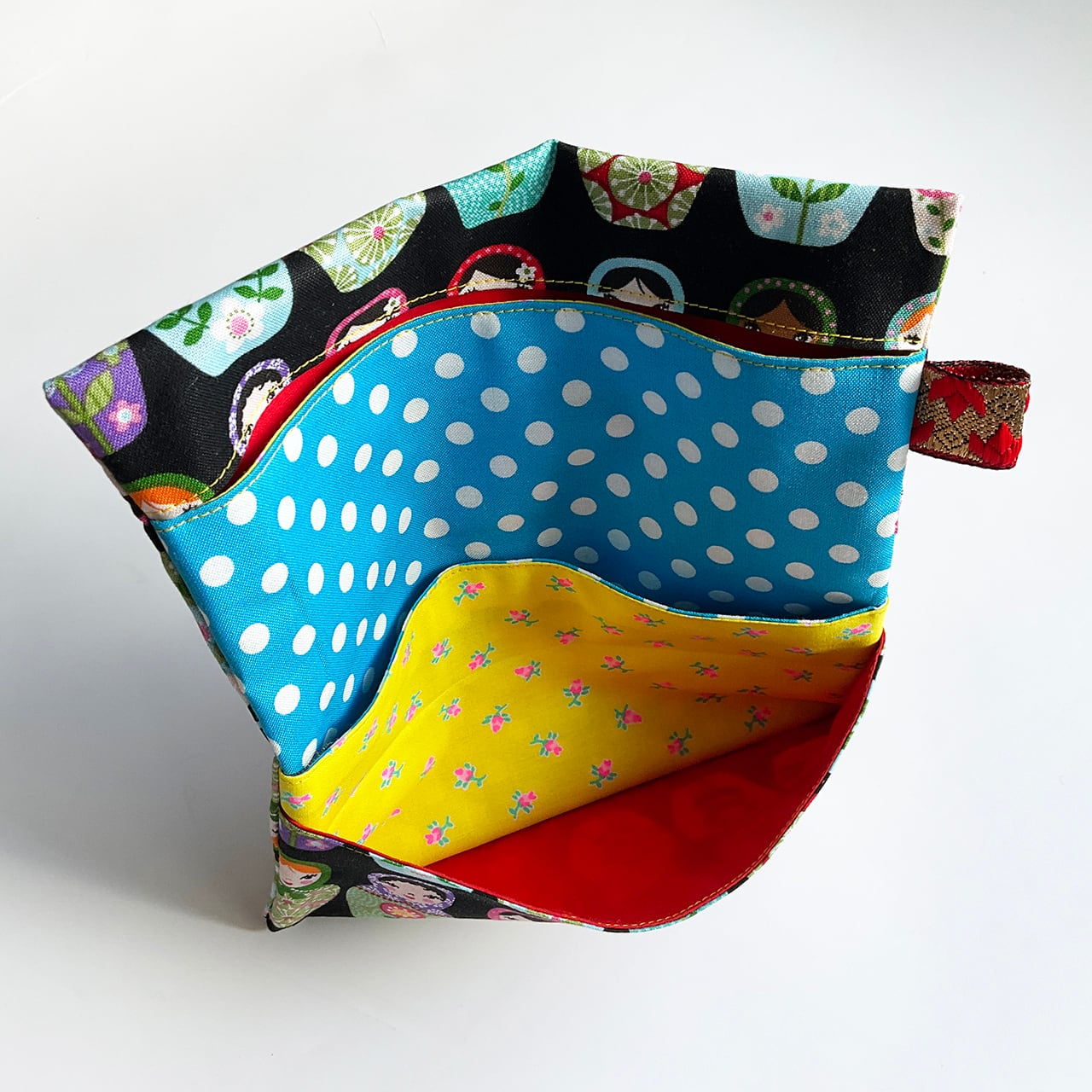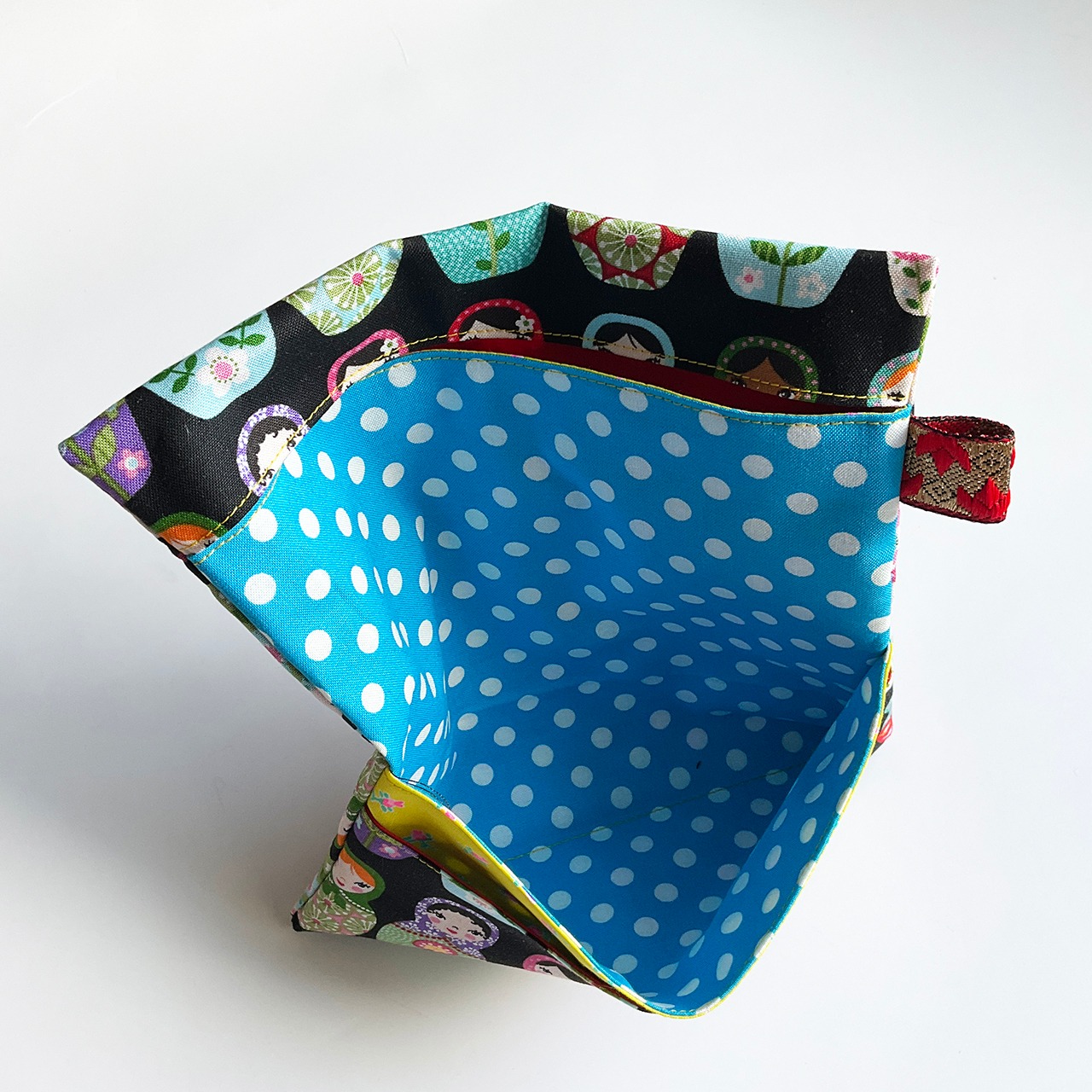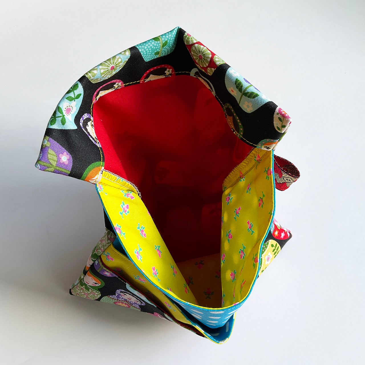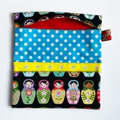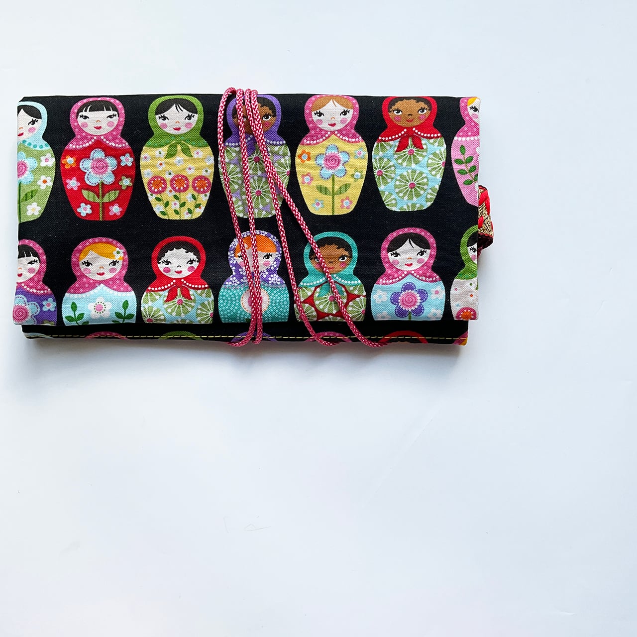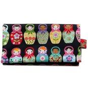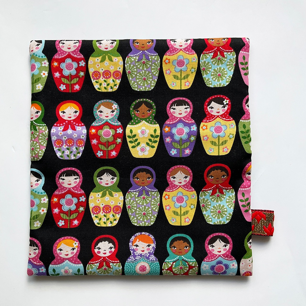 マトリョーシュカのおキャンな柄。黒地ですが騒がしく可愛いです。マトリョーシュカ好きのあなたに。
