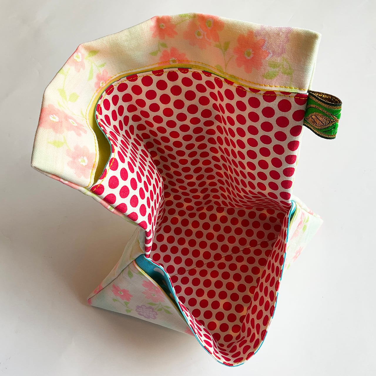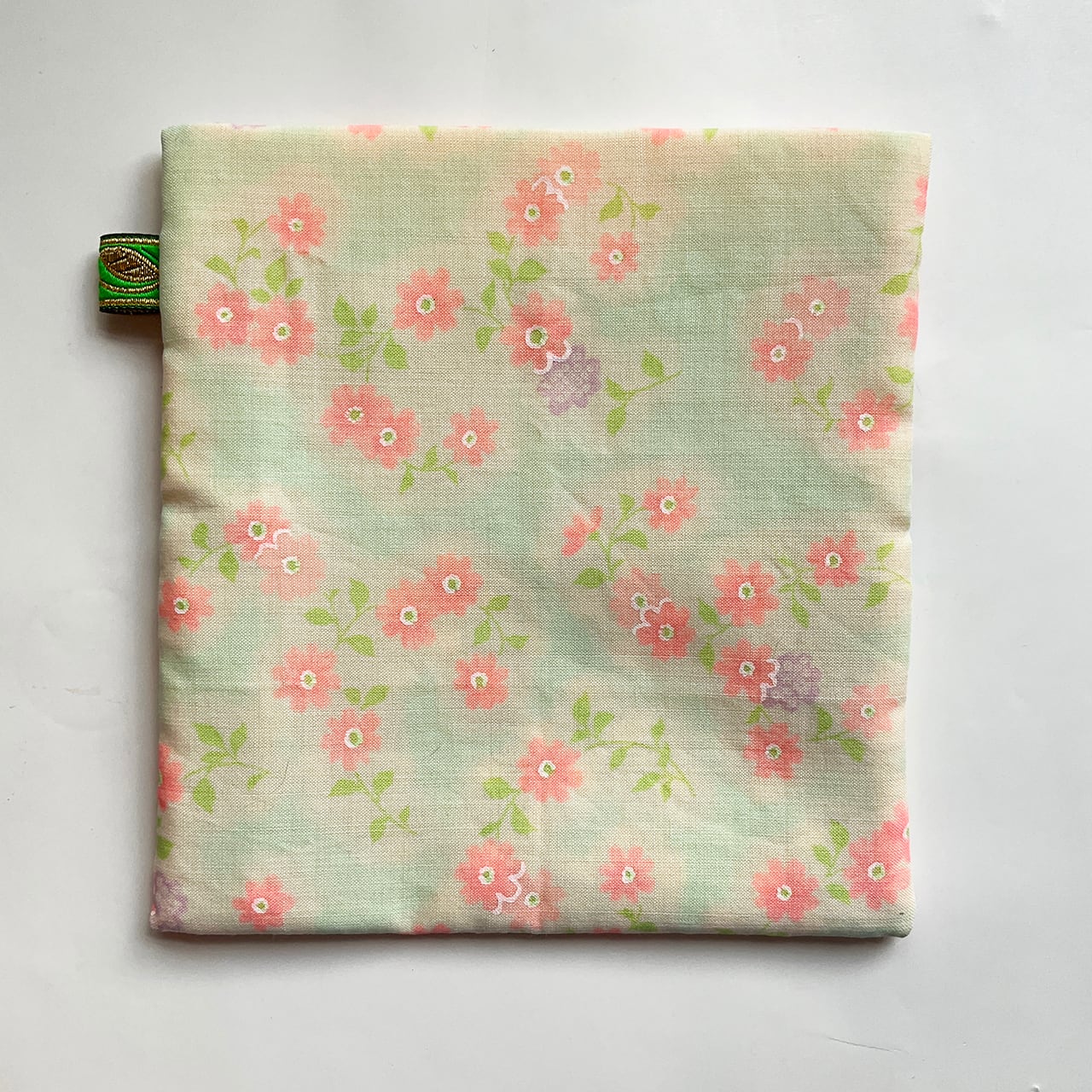 デッドストックのモスリン生地の素朴な花々。図案は素朴ですが、色はモスリン独特の蛍光ペンのようなインクで不思議なキッチュさ。中布とあいまって、フランスのアンティークのような雰囲気が出るように布合わせ。