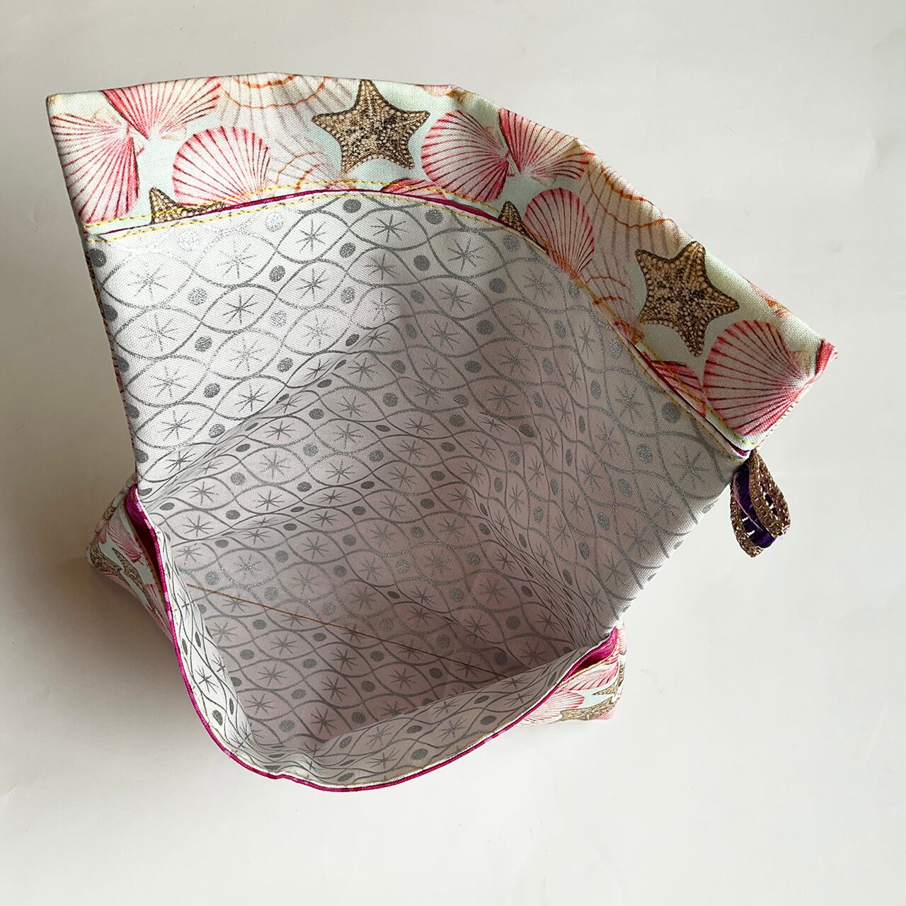 シェル柄 ホタテ?と手に取ってみると、繊細な色柄タッチ。リバティのハンカチーフにありそうな布。フランス展で手に入れた上質な布。ちょっとおすまし気分です。。