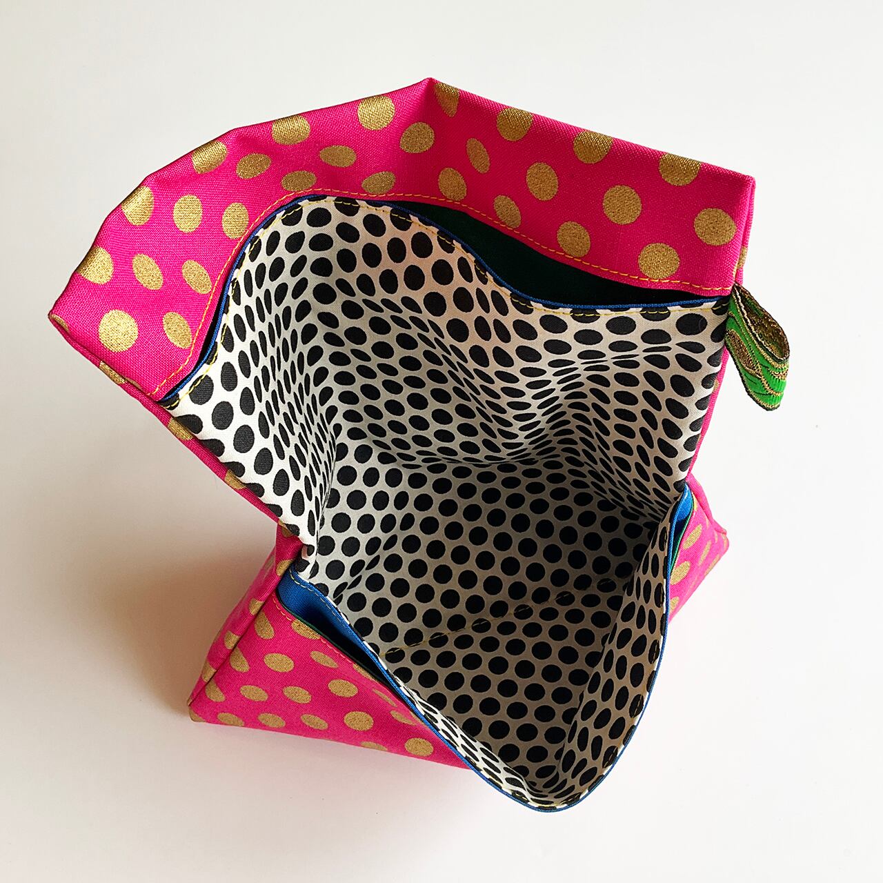 濃いピンクに濃いめの金箔のしっかりしたドット。中布、ちらみえ、インナー共に完璧にソリッドな、私好みのヌノザイフになりました。静かなpopでテクノっぽくもあり組み合わせ大満足の仕上がり。ピンク、水玉ですがおもいのほかクール。