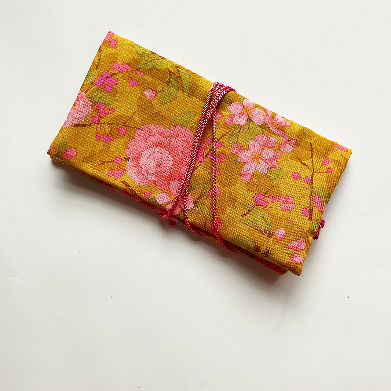 ほんのりフラッシュカラーも混ざっている花びらのピンクが、地色の辛子色をさらに高揚させてくれます。華やかなインテリアのような布。春の八重桜をこんなに匂い立つようにデザインしたデザイナーさんの色使い凄いです。