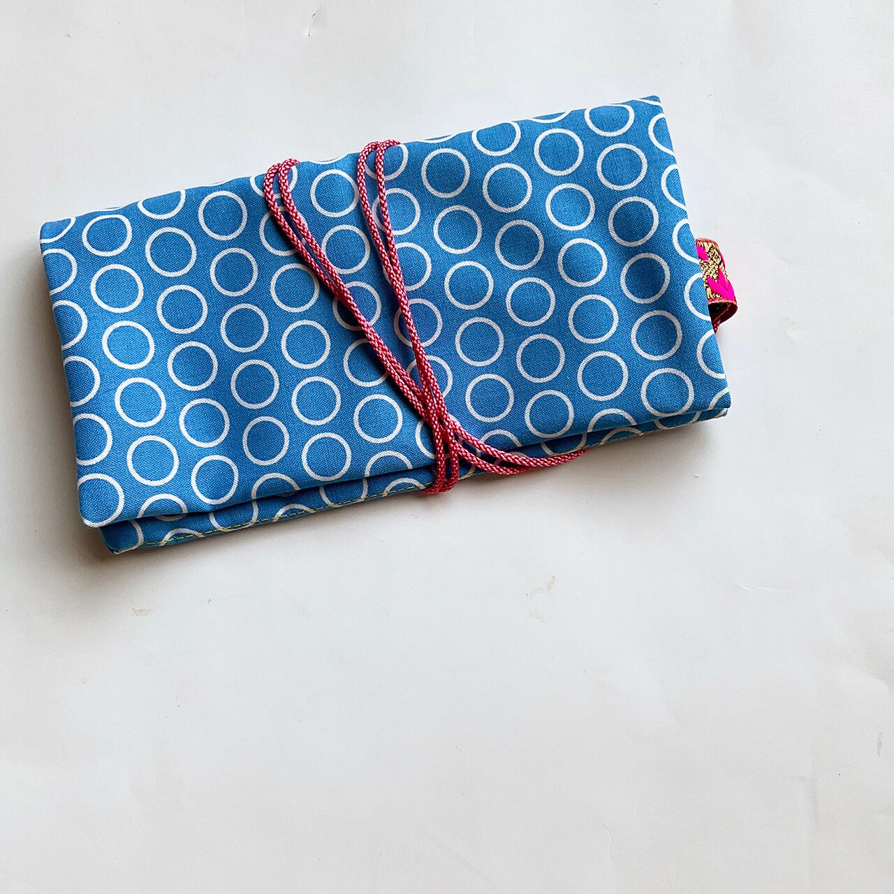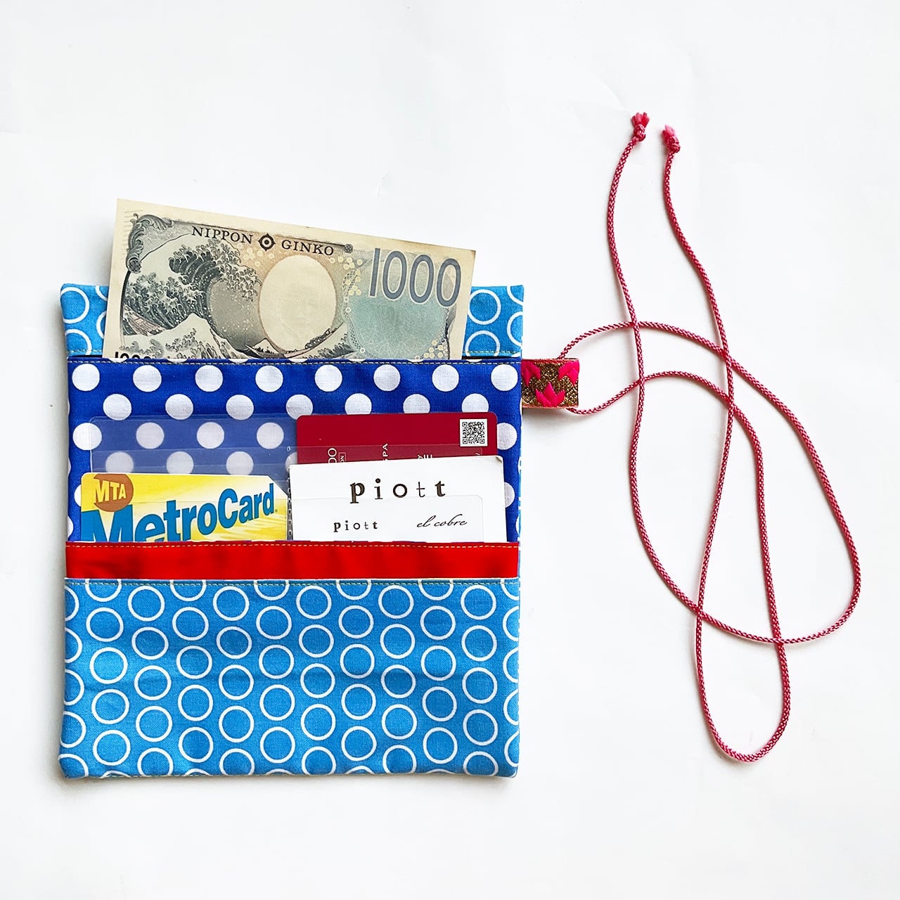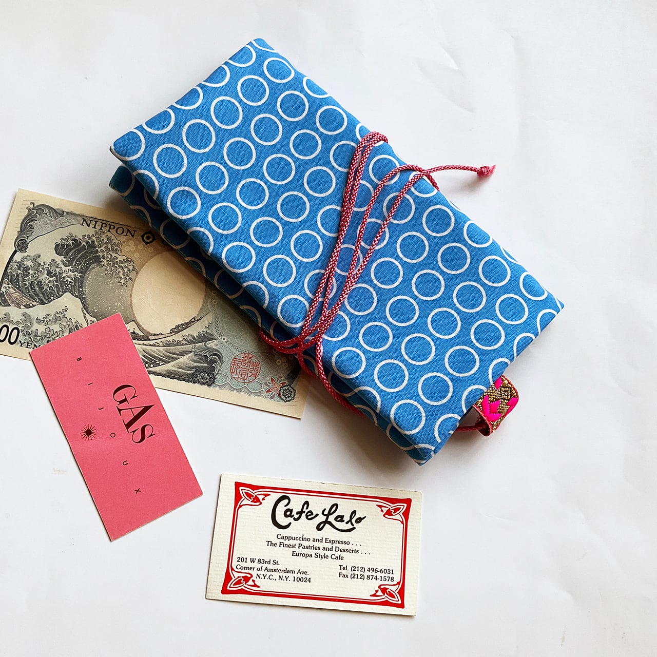 青に白い丸ラインのソリッドな布。青が好きな方。紐は青系でもいいですね。色数が少ないので、中布、インナーともに華やかで思い切りpopにしてみました。開ければ元気が出る一品になりました。水玉好きさんのためのヌノザイフ